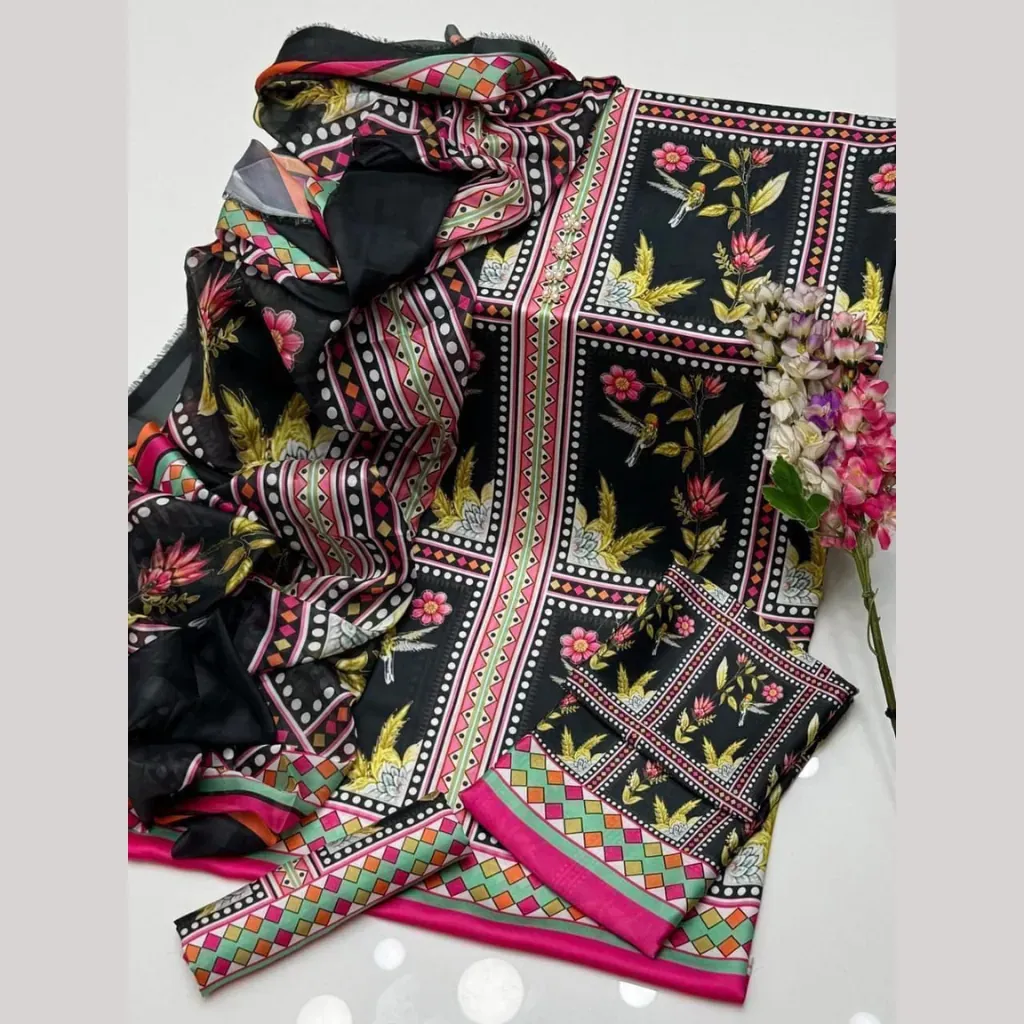 Experience timeless elegance with our Shamooz Silk Printed Unstitched 3PC Suit, designed for women who love sophistication and comfort.