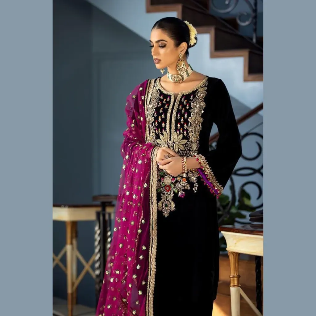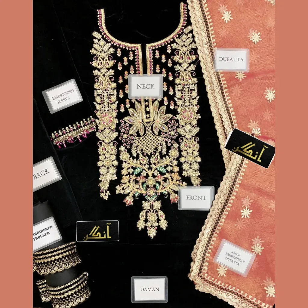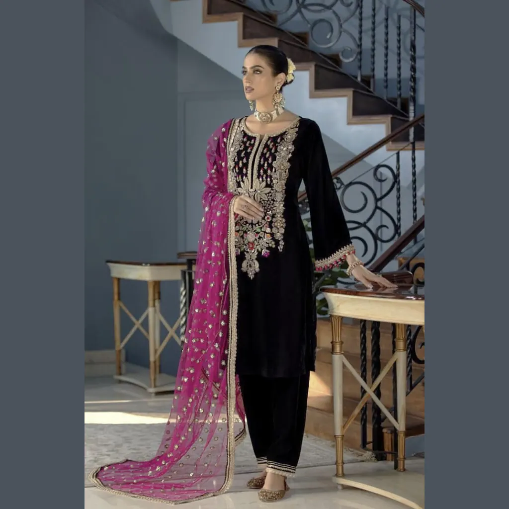 Indulge in timeless elegance with this luxury velvet embroidered hand-embellished 3 piece suit, designed for those who appreciate sophistication and fine craftsmanship.
