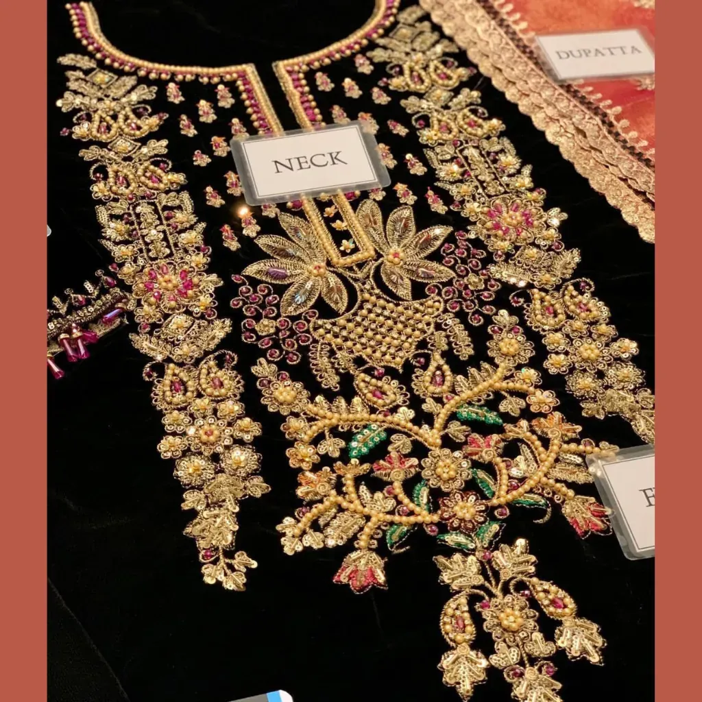 The outfit comes with a silk trouser adorned with embroidered bunch, offering both comfort and style. Completing the look is a ready-to-wear masoori dupatta, giving it a perfect balance of tradition and modern luxury. Whether it’s a festive event, formal dinner, or wedding function, this outfit ensures you stand out with elegance.