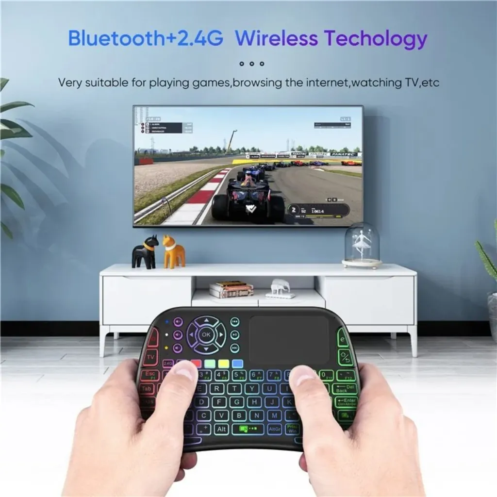 The M9 Bluetooth Mini Wireless Keyboard with 7-Color Backlight, 2.4G Air Mouse, and Built-in Touchpad is an advanced all-in-one control solution for your smart home and entertainment needs. Designed for ultimate convenience and performance, this compact wireless keyboard integrates Bluetooth and 2.4GHz connectivity, a responsive air mouse, and a precision touchpad—giving you complete control over your Smart TV, Android Box, laptop, PC, projector, or gaming console.
