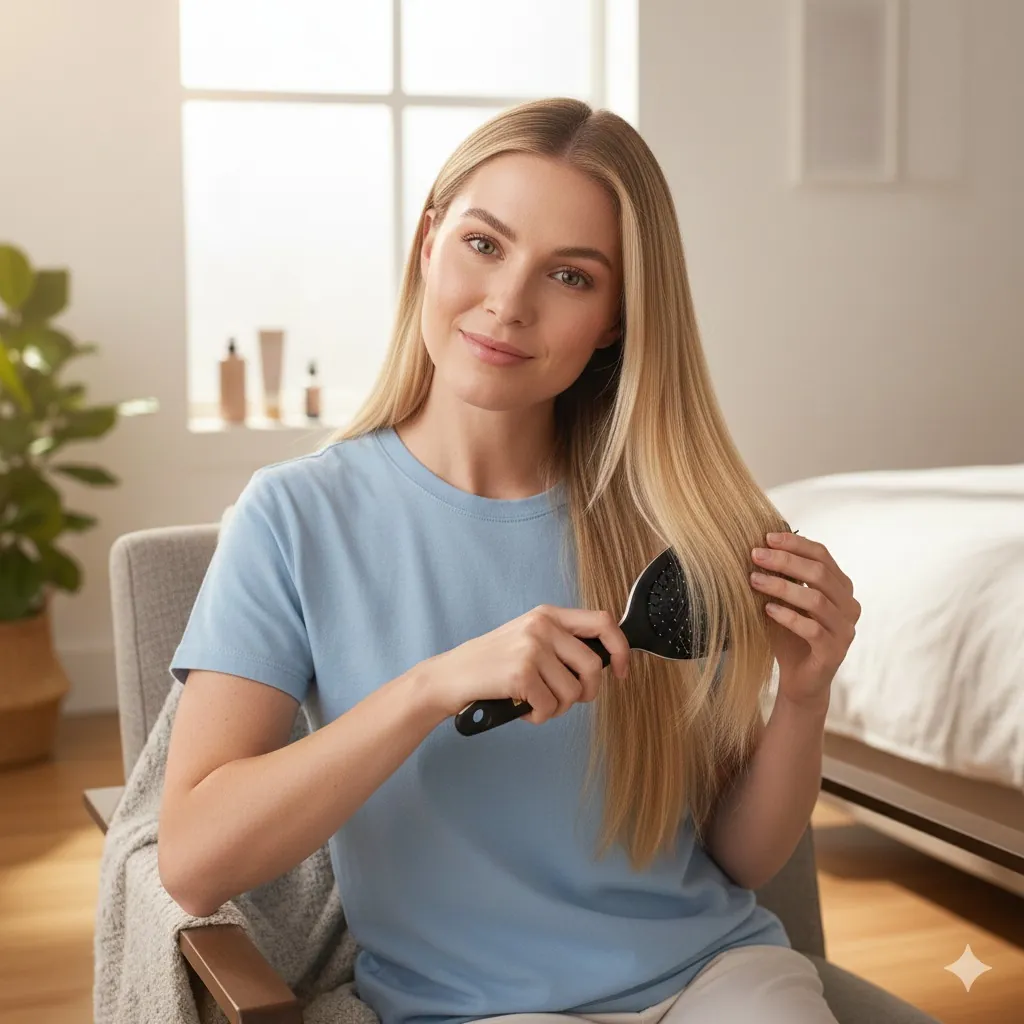 The MAGGIE Professional Cushion Paddle Brush is designed for those who demand both comfort and performance. This wide-set paddle brush features a premium matte black finish with elegant gold branding, making it a stylish addition to any vanity. The heart of the brush lies in its flexible rubber cushion base, which acts as a shock absorber to prevent hair breakage and minimize tension on the scalp.
