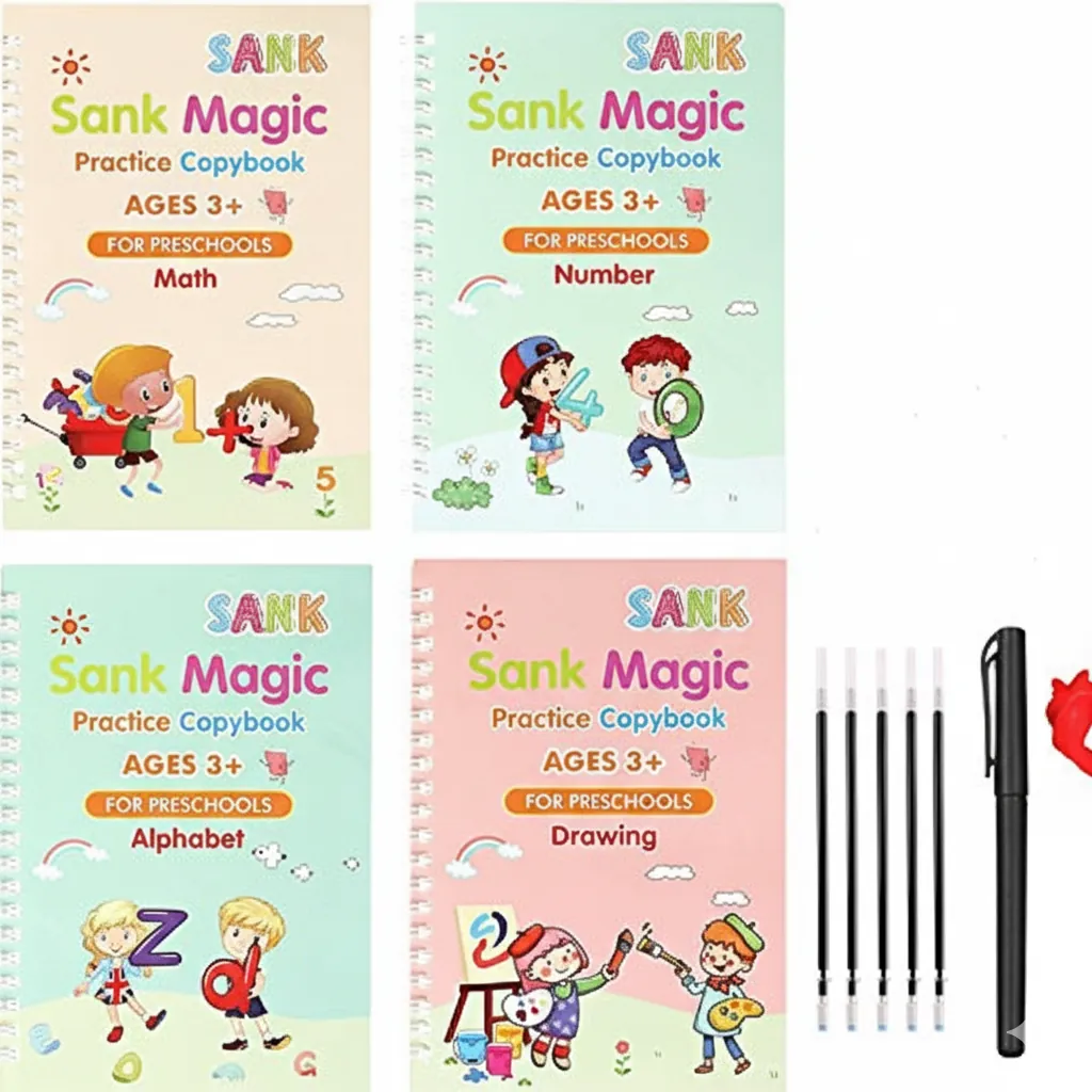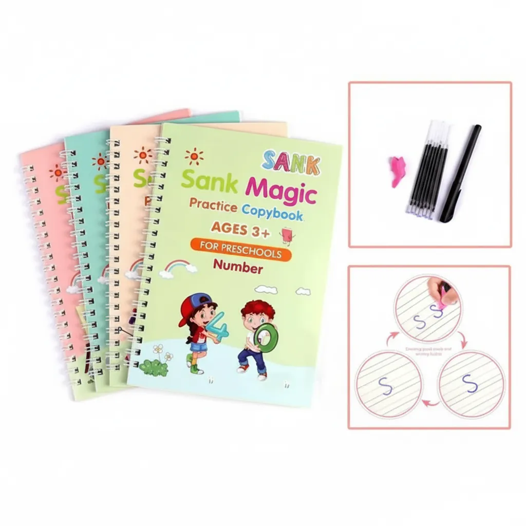 The Magic Sank Book Set (Pack of 4) is an innovative educational tool designed to make handwriting fun and engaging for children. Each copybook features magical reusable pages that fade automatically after a few minutes, allowing kids to practice repeatedly without wasting paper.