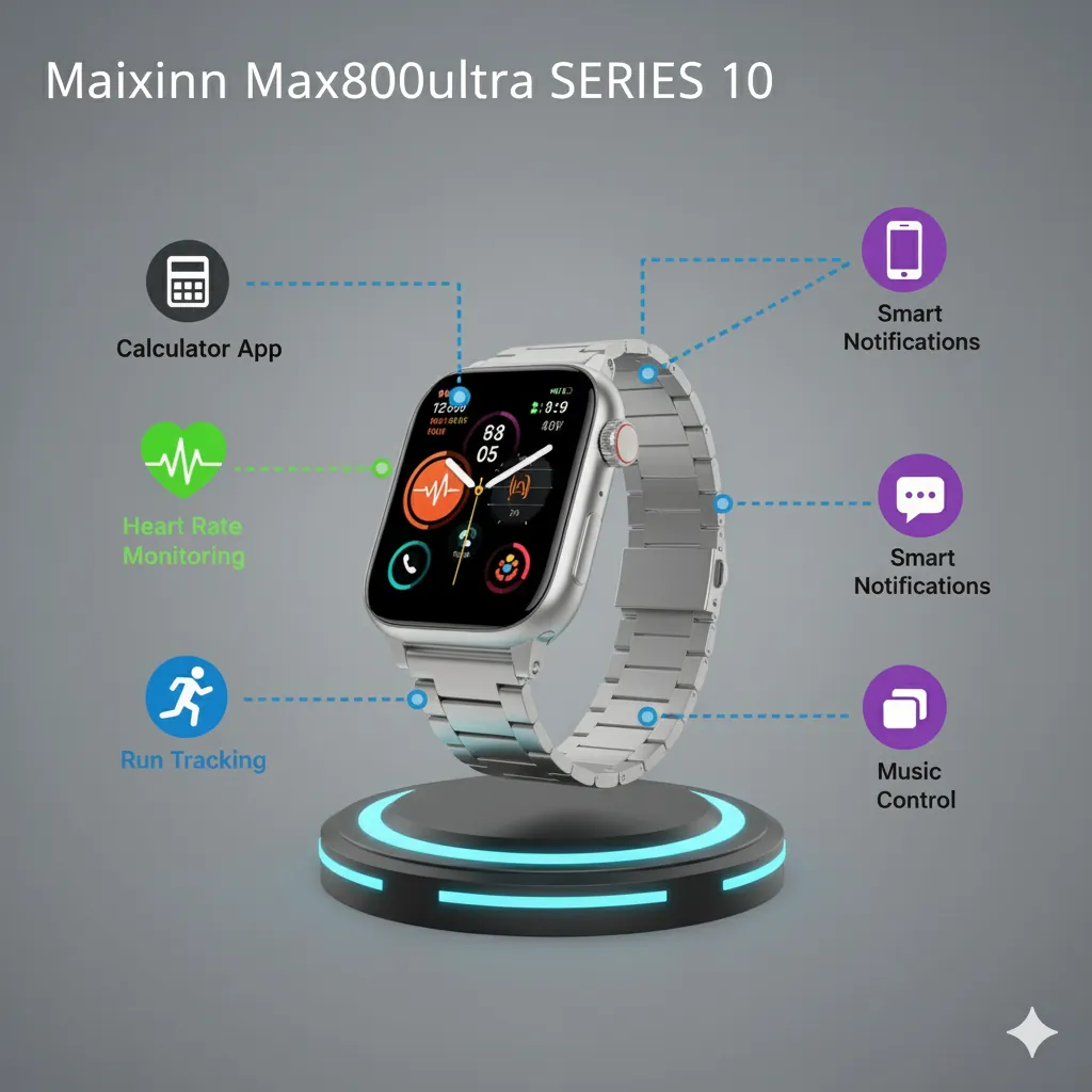 The Maixinn Max 56 Series 10 Smart Watch offers a premium, versatile experience in one incredible 7-in-1 package . At the core is a stunning AMOLED HD Display that delivers vibrant colors and superior clarity, complemented by convenient Wireless Charging for hassle-free power-ups. This Non-Metal Edition is designed for comfort and durability, featuring Bluetooth Calling functionality that allows you to make and receive clear calls directly from your wrist. More than just a communication device, it's a dedicated health companion, equipped with a comprehensive suite of features including Heart Rate, SpO2 monitoring, Sleep Tracking, and Multiple Sports Modes. The package is highlighted by 7 diverse, interchangeable non-metal straps , ensuring you have a perfect look for every occasion, making this watch the ultimate fusion of style, technology, and value.