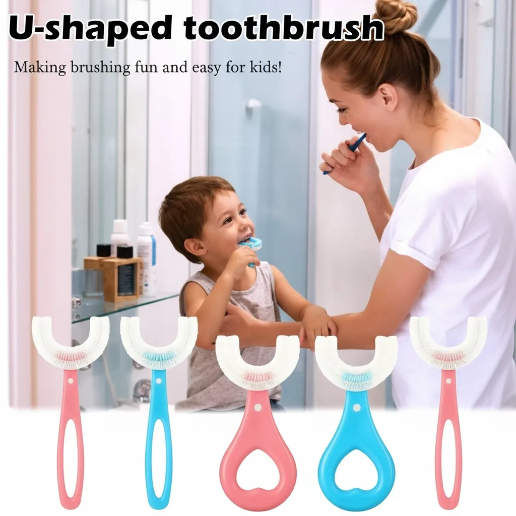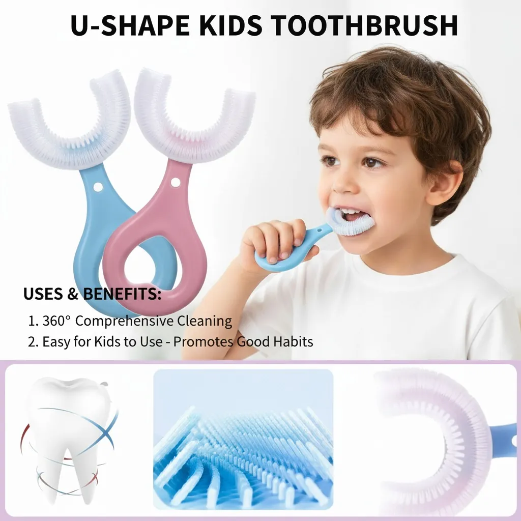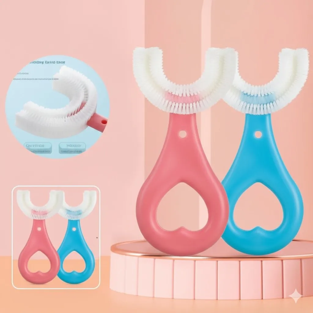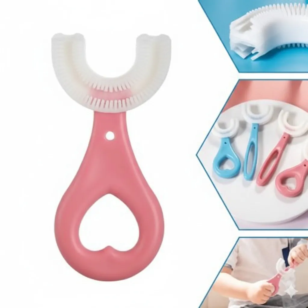Introduce a revolutionary way to care for your child's oral health with our innovative Kids U-Shape Toothbrush. Specifically designed for toddlers and young children, this toothbrush takes the struggle out of daily brushing. Made from 100% food-grade soft silicone, it's gentle on delicate gums and developing teeth, ensuring a comfortable and safe brushing experience. The unique U-shaped brush head effectively cleans all sides of the teeth simultaneously with its 360° cleaning bristles, reaching hard-to-access areas that traditional toothbrushes might miss. Its ergonomic handle is perfectly sized for small hands, making it easy for children to grip and use. Available in vibrant blue and pink, this manual toothbrush encourages good brushing habits from an early age, making oral hygiene a quick and enjoyable routine.