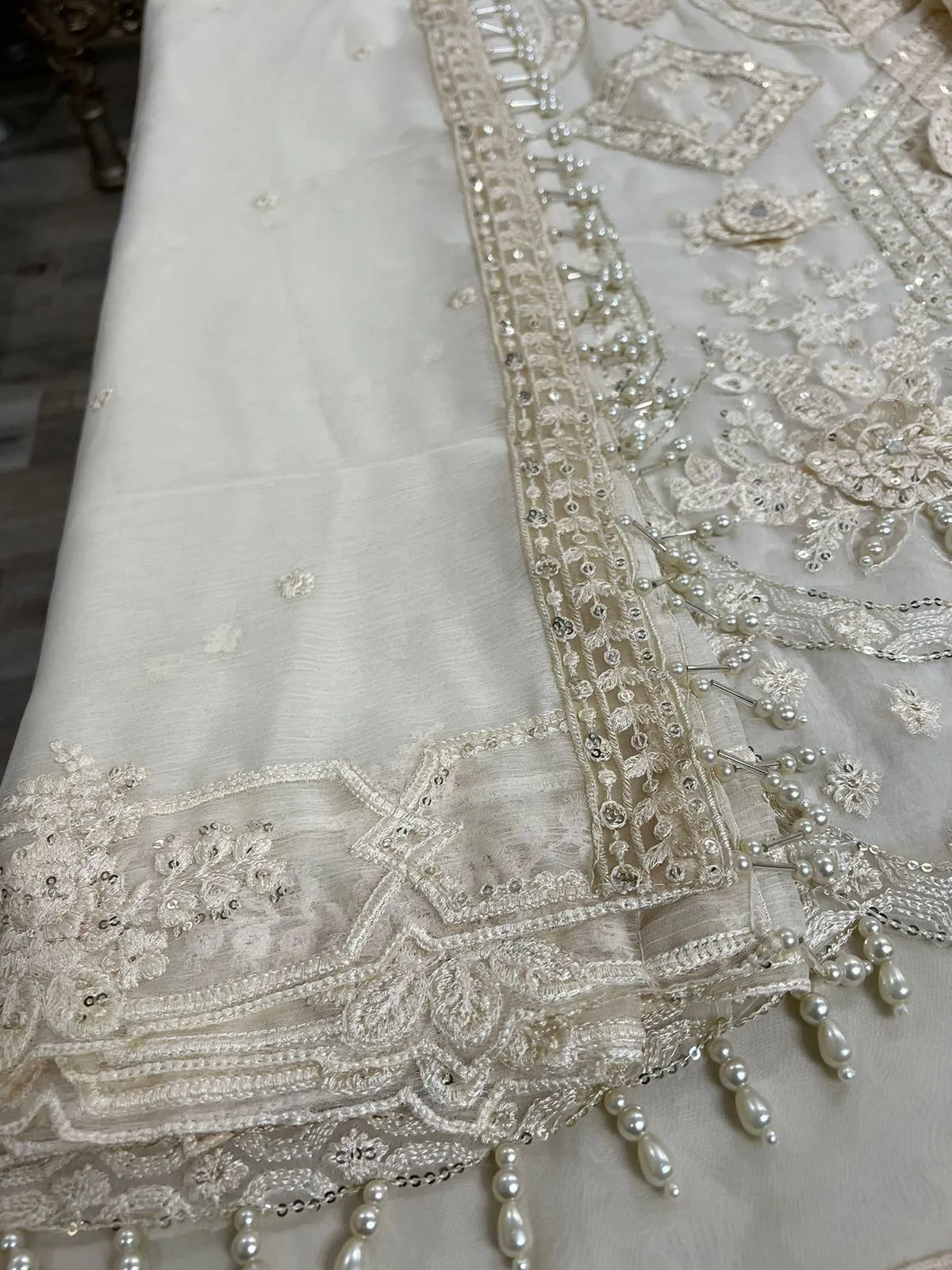 The sleeves are a highlight, featuring fully embroidered alternate design with exquisite cutwork bunches. The Chiffon Dupatta is a true showstopper—it is fully embroidered, ready-to-wear, and finished with a four-sided embroidered border and attached tassels, saving you the hassle of tailoring. The set is completed with a comfortable dyed Malai Trouser.