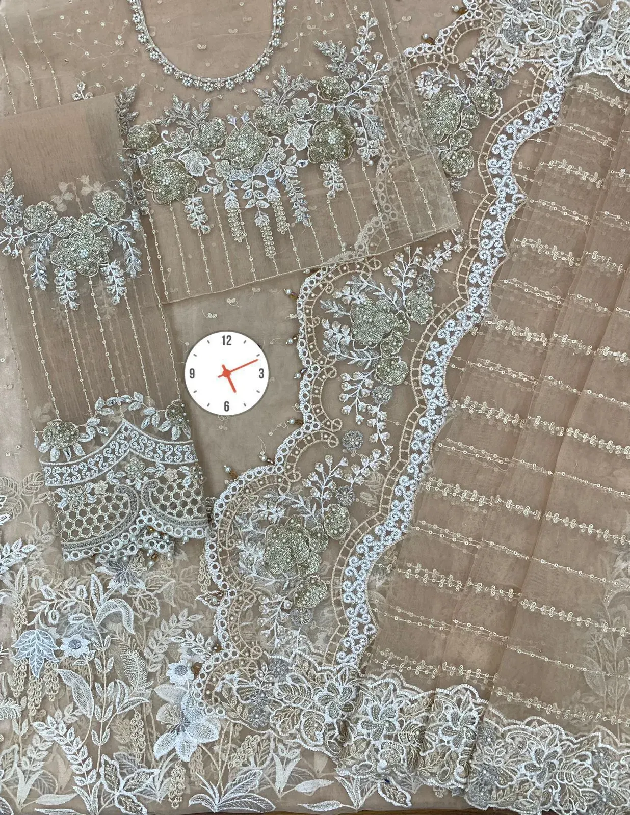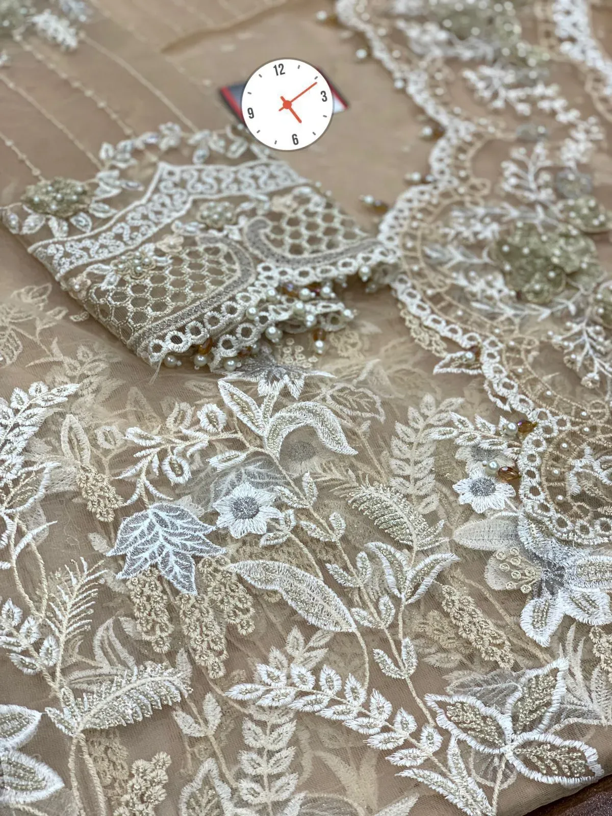 MARAI.B Unstitched Luxury Embroidered Net Dress with Heavy Adda Work and Cutwork Borders - Nude Shade
