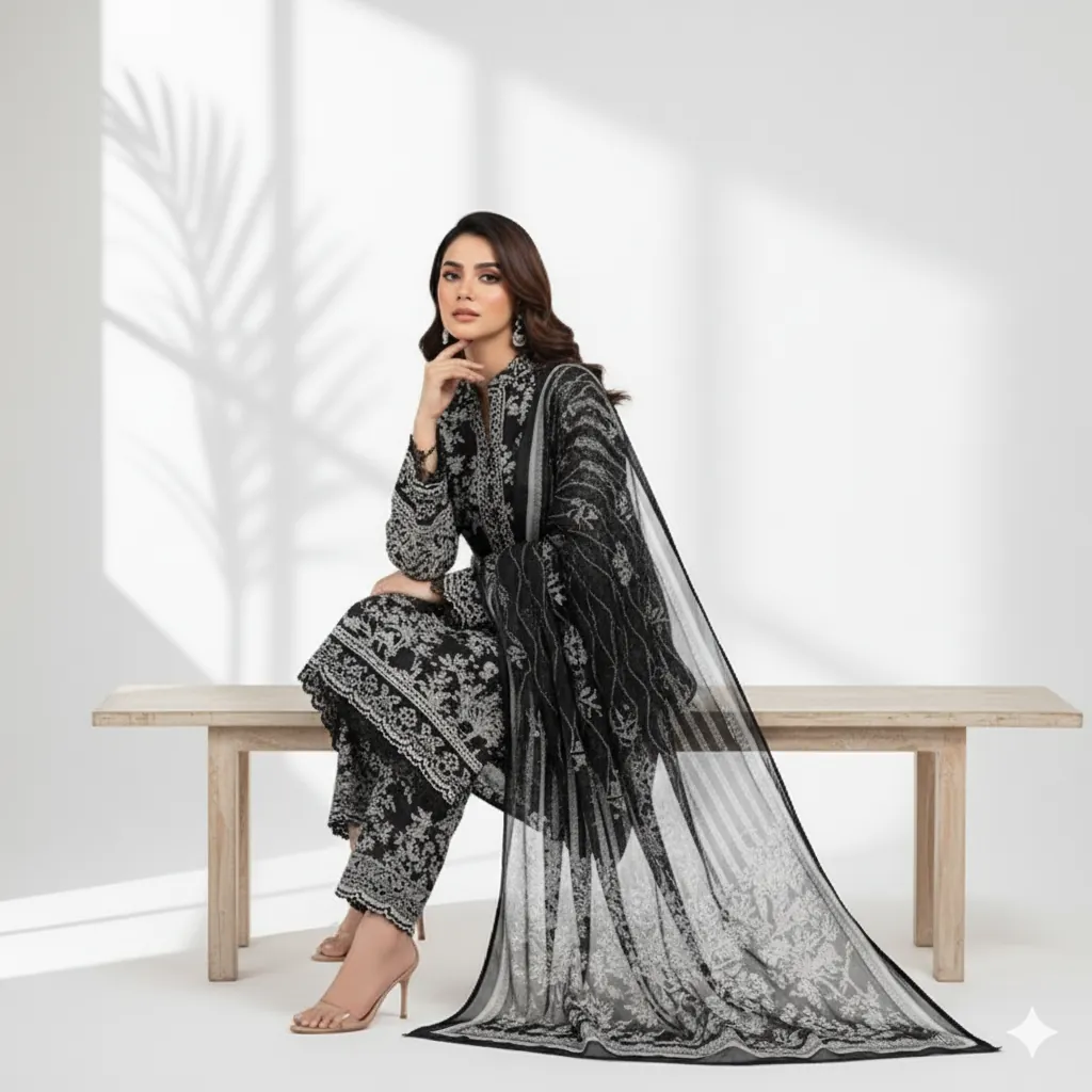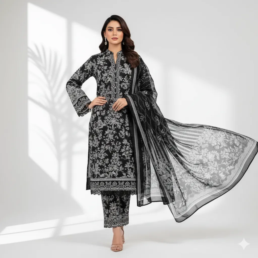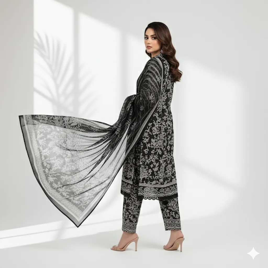 Maria B. 3-Piece Black & White Printed Lawn Suit - Chiffon Dupatta | M.Prints Classic. The shirt is crafted from premium lawn fabric, showcasing a beautiful digital print with floral, leaf, and tree motifs in black and white. The suit is complemented by a digital printed Shafoon (chiffon) dupatta that mirrors the black and white patterns, creating a cohesive design. A solid black trouser fabric provides a classic and graceful finish. This authentic Maria B. product guarantees superior fabric and color quality.