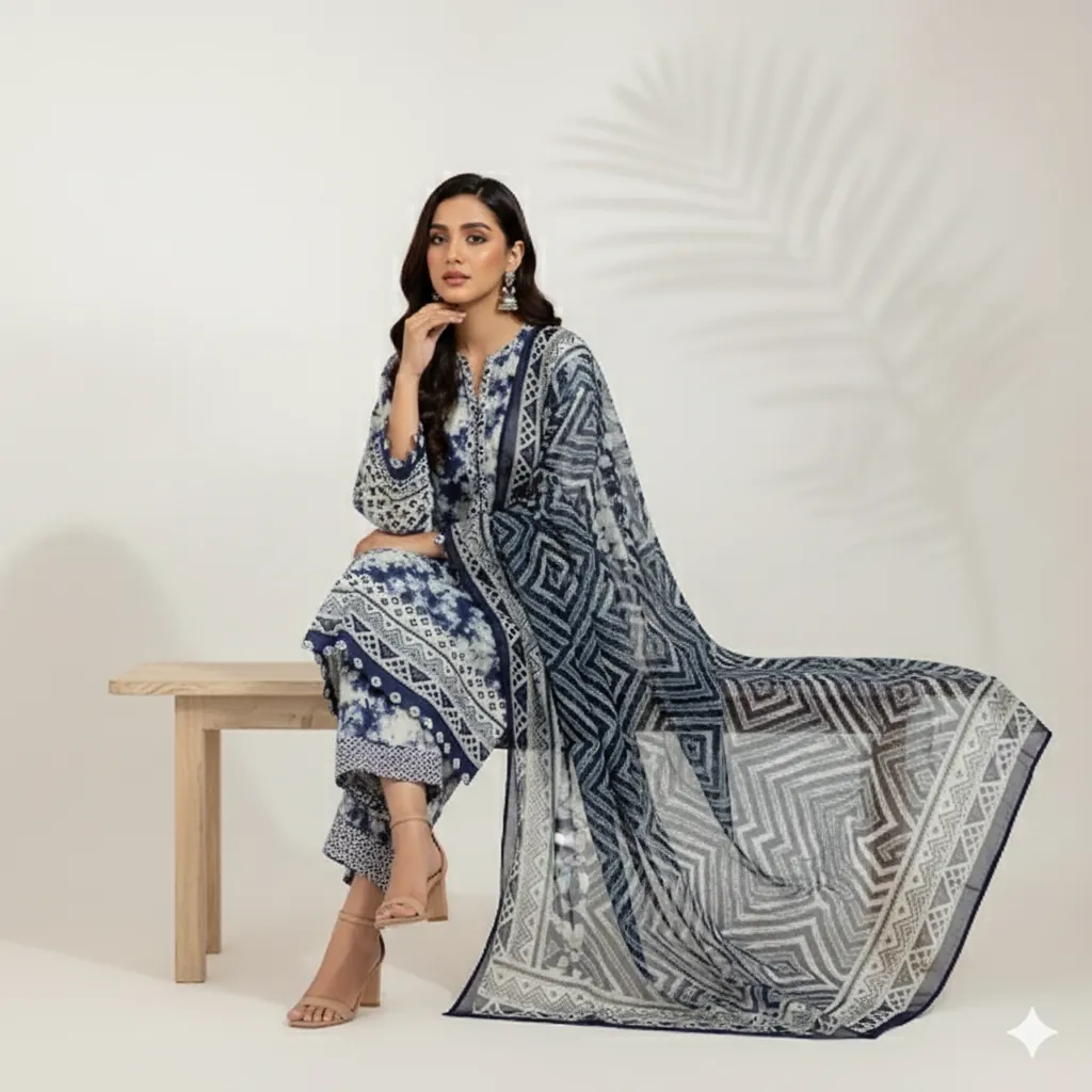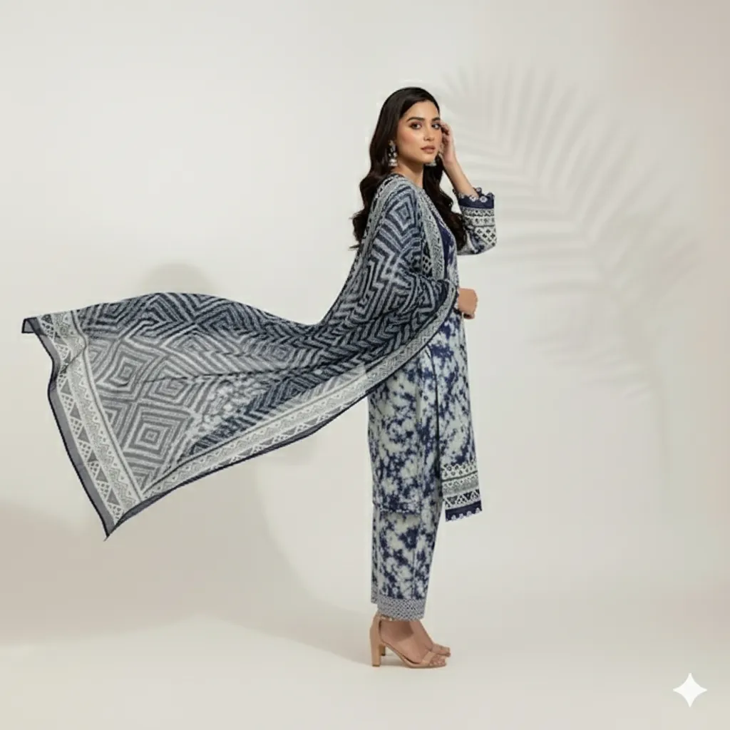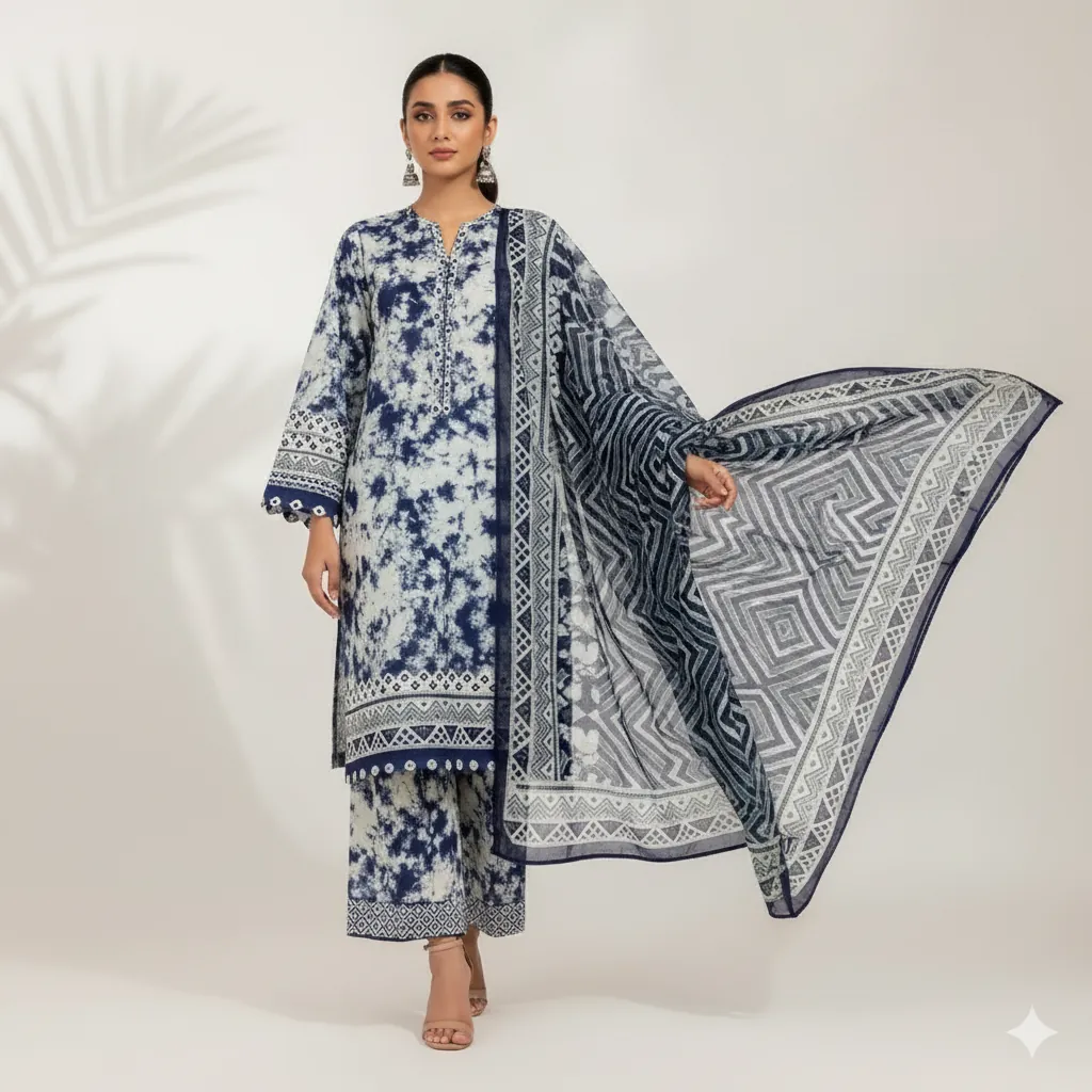 Maria B. 3-Piece Blue & White Tie-Dye Lawn Suit - Striped Chiffon Dupatta .This beautifully crafted 3-piece unstitched suit is a perfect addition to your seasonal wardrobe. The lawn shirt boasts a stunning digital print with a tie-dye effect in various shades of blue and white, and is detailed with intricate geometric borders on the cuffs and hem. The ensemble is completed with a digital printed chiffon dupatta featuring a multi-toned striped and geometric pattern. The solid navy blue trouser fabric offers a cohesive and elegant finish, bringing the entire look together.