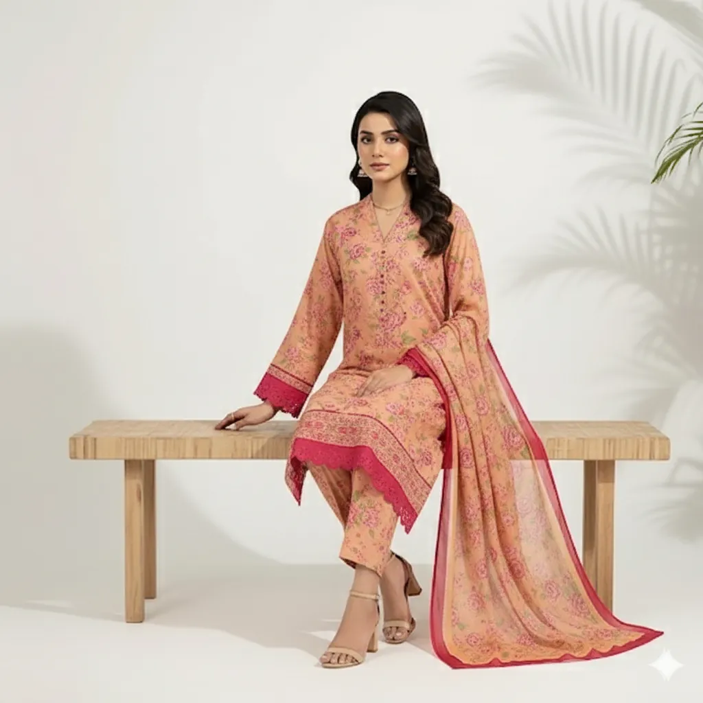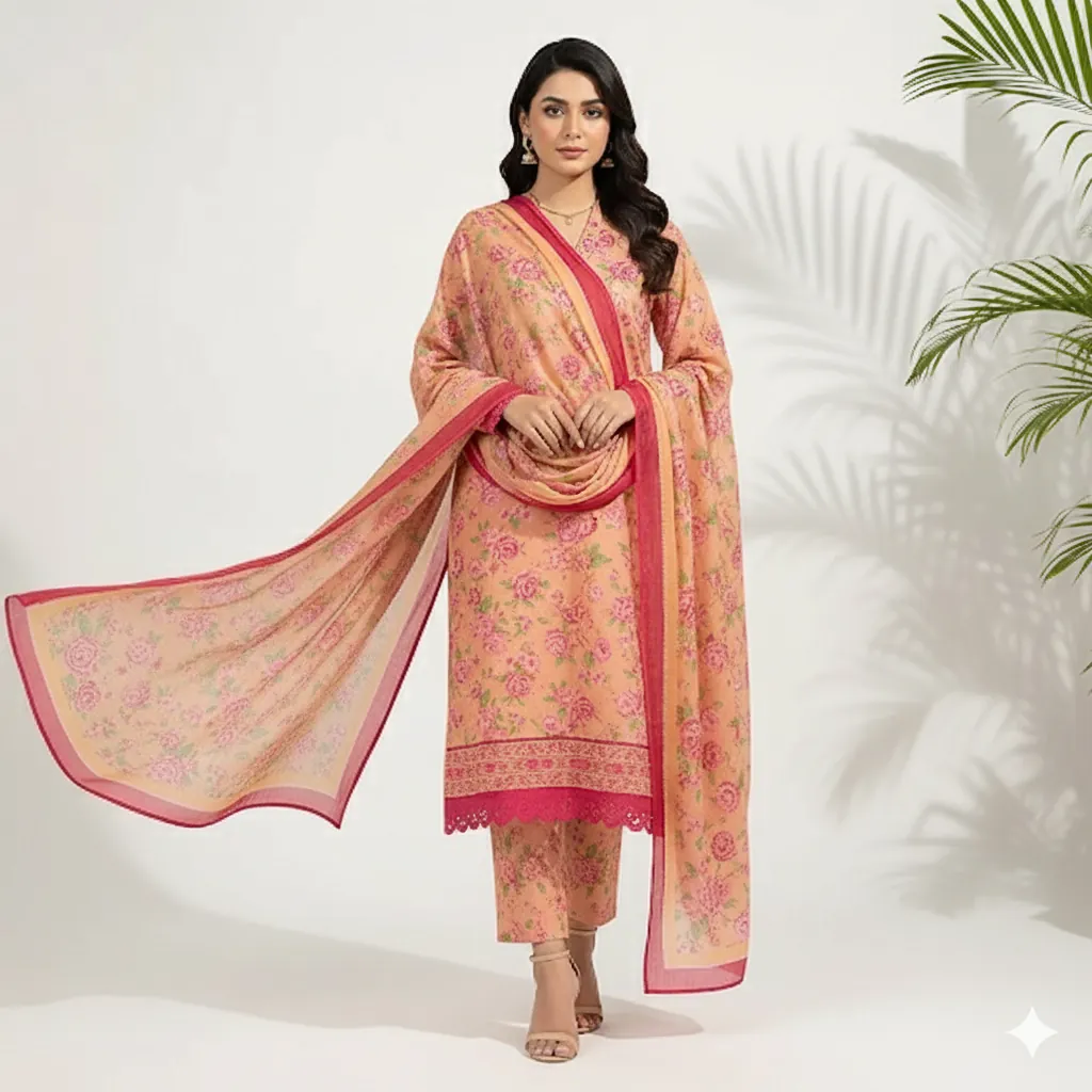 Maria B. 3-Piece Peach & Pink Floral Print Lawn Suit - Chiffon Dupatta | Baroque Collection. Introducing the Maria B. 3-Piece Lawn Collection from their exquisite Baroque line. This unstitched suit is crafted from premium lawn fabric, ensuring exceptional comfort and a luxurious feel. The digital printed shirt boasts a beautiful all-over floral design in vibrant pink on a soft peach or skin-toned base. The ensemble is perfectly complemented by a digital printed Shafoon (chiffon) dupatta, mirroring the floral pattern and finished with a striking dark pink or maroon border. A solid peach trouser fabric provides a cohesive and elegant finish. This authentic Maria B. product guarantees superior fabric and color quality, making it a perfect addition to your summer wardrobe.