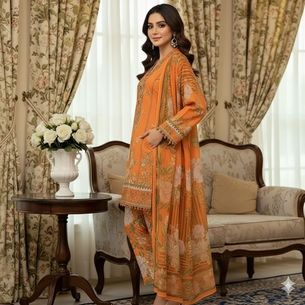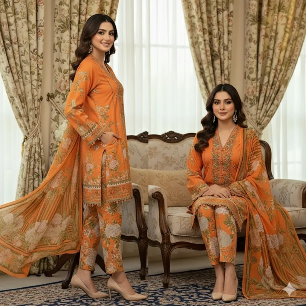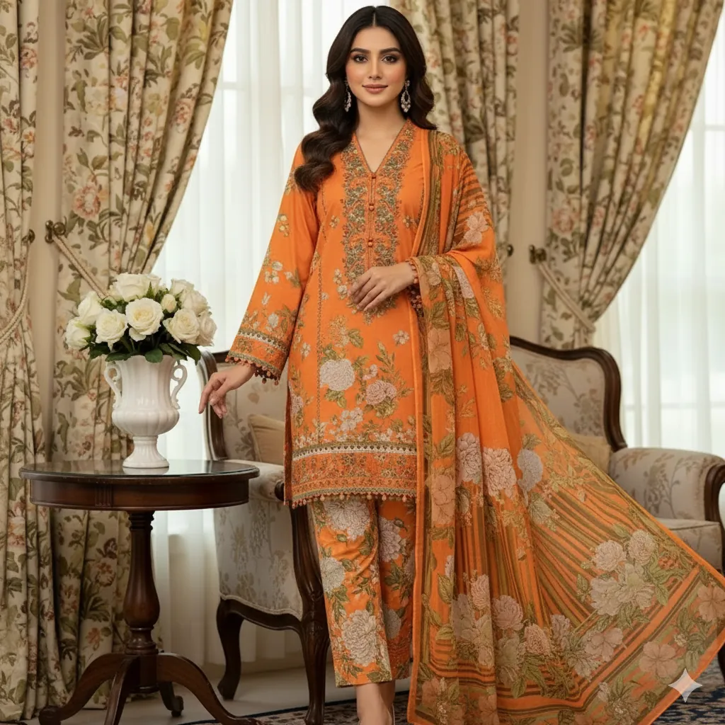 Maria B. 3-Piece Vibrant Orange & Green Floral Print Lawn Suit - Chiffon Dupatta | Summer Collection.The shirt is crafted from premium lawn fabric and features a beautiful digital print with large floral and leaf motifs in various shades of green, set against a stunning vibrant orange base. The suit is complemented by a digital printed Shafoon (chiffon) dupatta that mirrors the mix of orange and green floral prints. A solid orange trouser fabric provides a cohesive and elegant finish. This authentic Maria B. product is a must-have for a stylish summer wardrobe.
