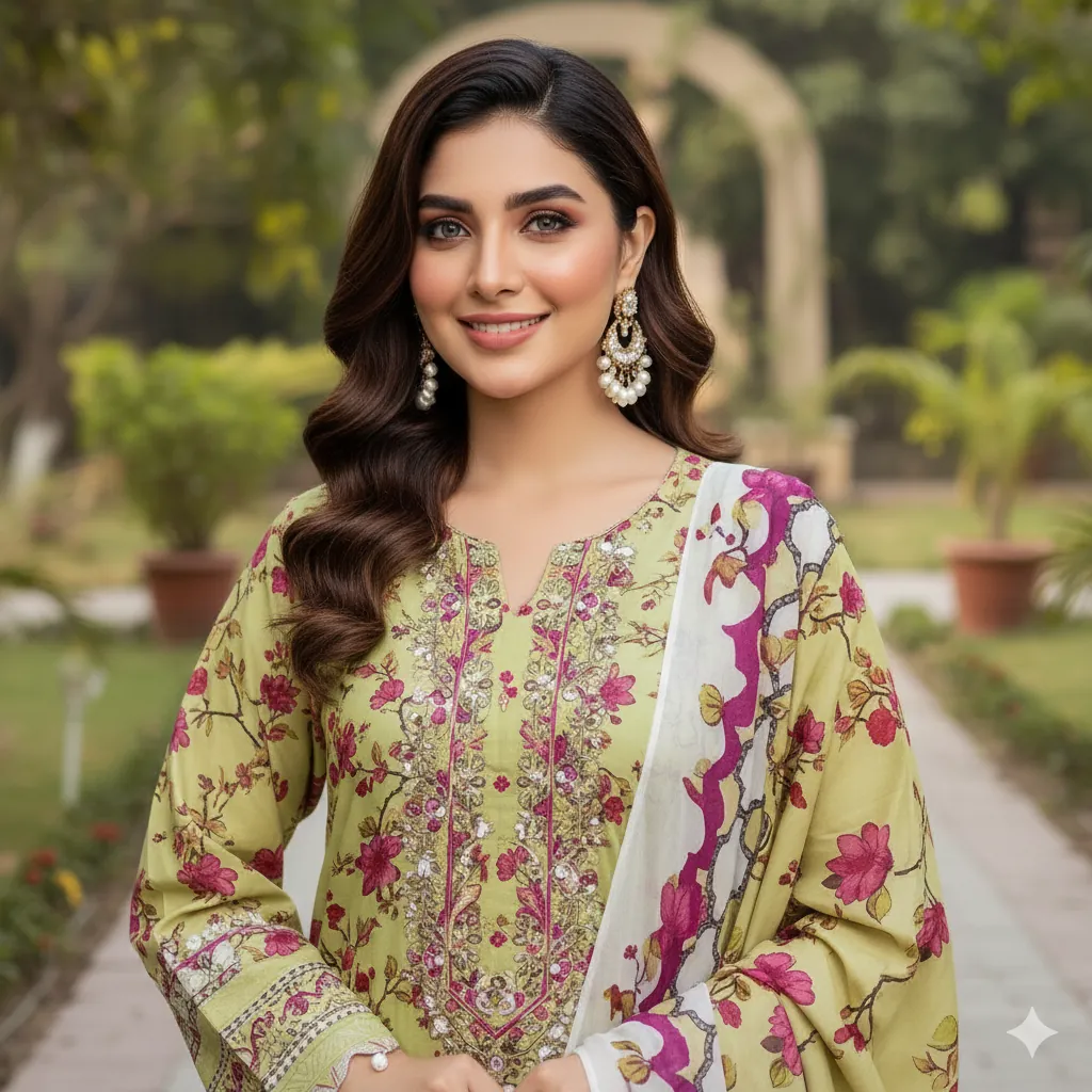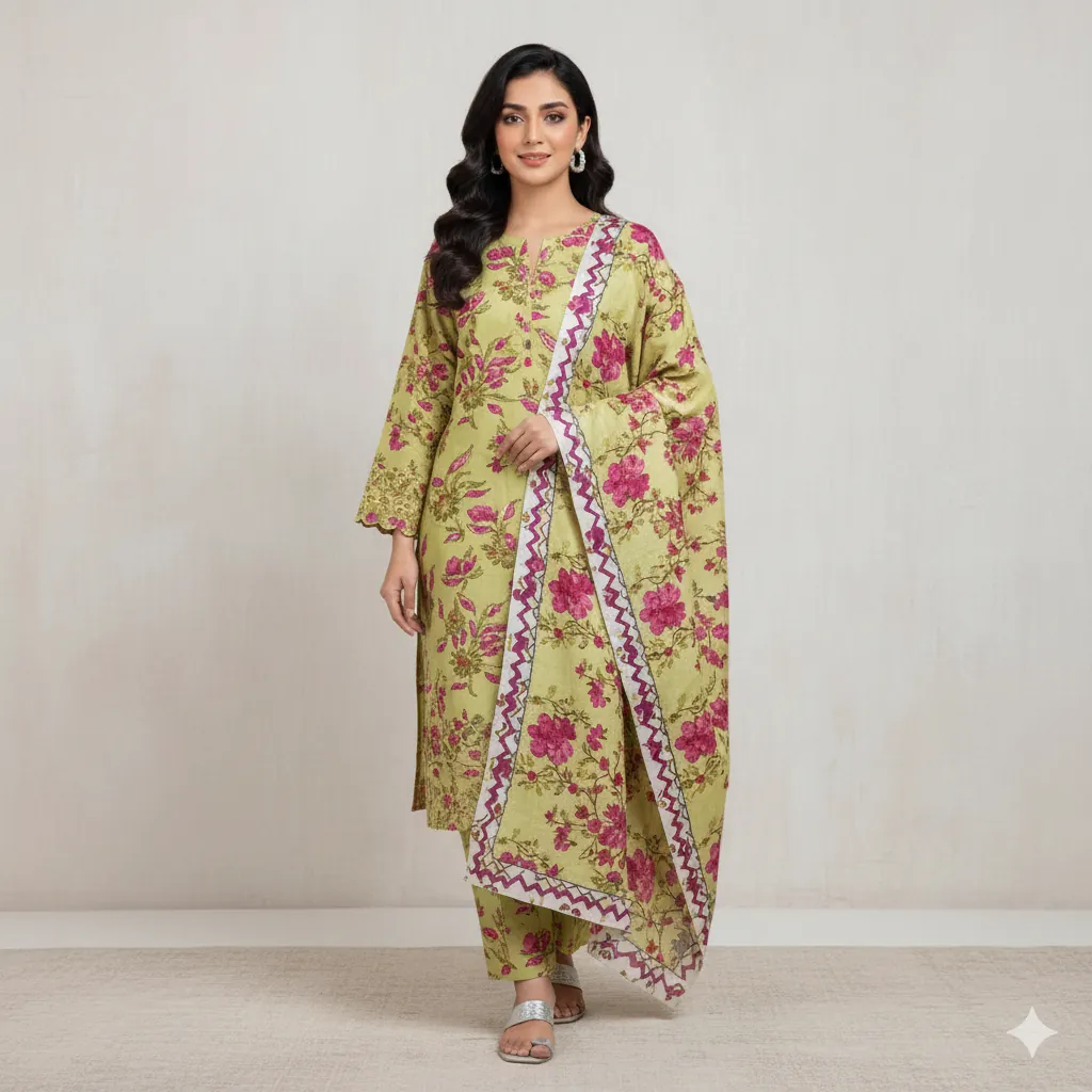 Maria B. Designer Linen Collection - All-Over Digital Printed Shirt, Trouser & Dupatta (Yellow). Add a pop of color to your style with this stunning 3-piece suit from the MARIA.B. linen collection. The digitally printed all-over linen shirt is adorned with a beautiful floral pattern in fuchsia, creating a lively contrast against the elegant yellow base. The suit is completed with a perfectly matched printed linen trouser and a coordinating digital printed linen dupatta. The outclass fabric and beautiful color scheme are guaranteed to be of the highest quality, ensuring both comfort and a fashionable look. This suit is the perfect choice for making a statement.