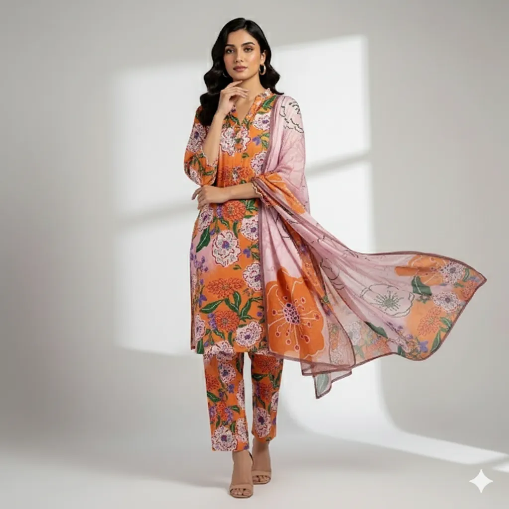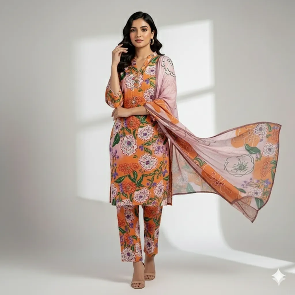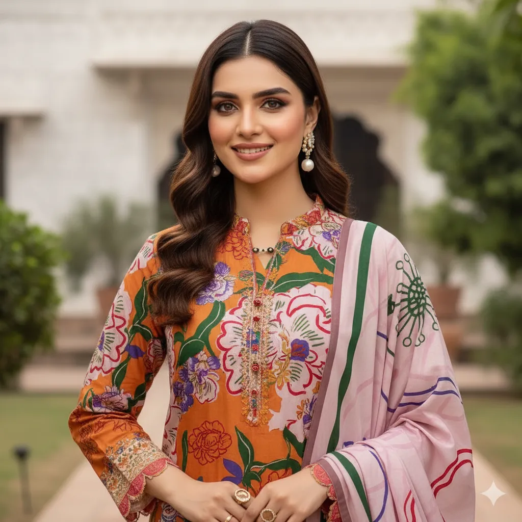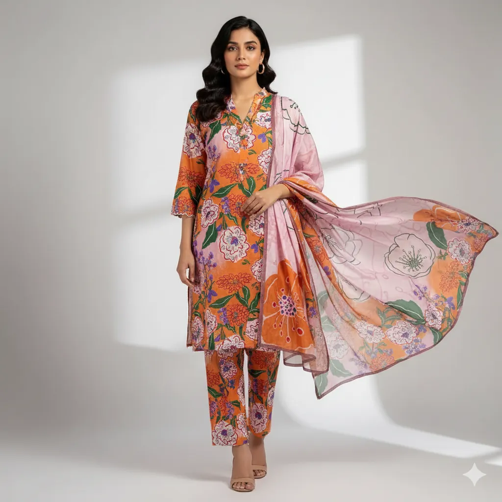 Maria B. Designer Linen Collection - Orange Suit with Multi-Color All-Over Print. Step into the season with this lively 3-piece suit from the MARIA.B. linen collection. The digitally printed all-over linen shirt showcases an eye-catching mix of floral and abstract designs in shades of orange, pink, and blue. This is perfectly complemented by a matching printed linen trouser. The highlight of the suit is the beautifully coordinated digital printed linen dupatta, which features a mesmerizing pattern with a distinct orange touch, creating a sophisticated and stylish appeal. With its outclass fabric and guaranteed colors, this suit is perfect for those who want to express their style with vibrant prints and a touch of elegance.