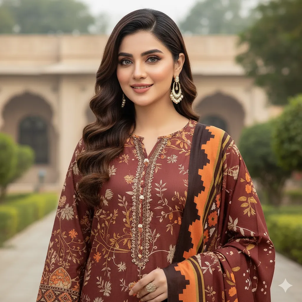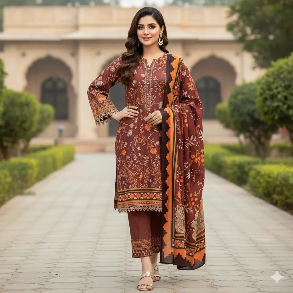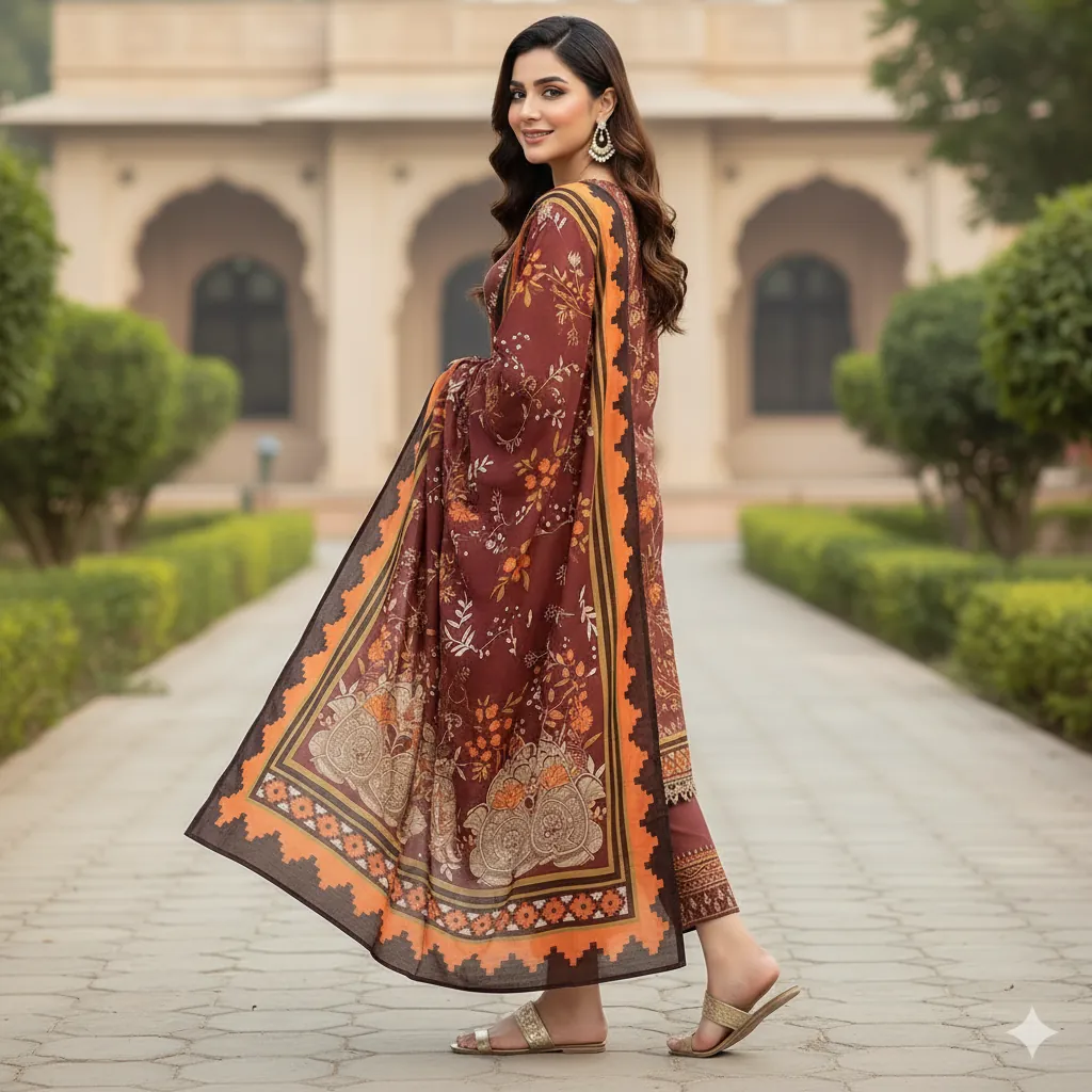 Maria B. Digital Printed All-Over Shirt, Trouser & Dupatta Linen Suit - Maroon & Orange. Add a touch of elegance to your wardrobe with this stunning 3-piece suit from the MARIA.B. linen collection. The digitally printed all-over linen shirt and trouser are adorned with a delicate floral print in a rich maroon and orange color scheme. The outfit is completed with a coordinating digital printed linen dupatta that features a beautiful mix of floral and bold geometric prints, adding a sophisticated touch. The premium quality fabric and colors are guaranteed to provide a comfortable fit and a stylish look that will last.