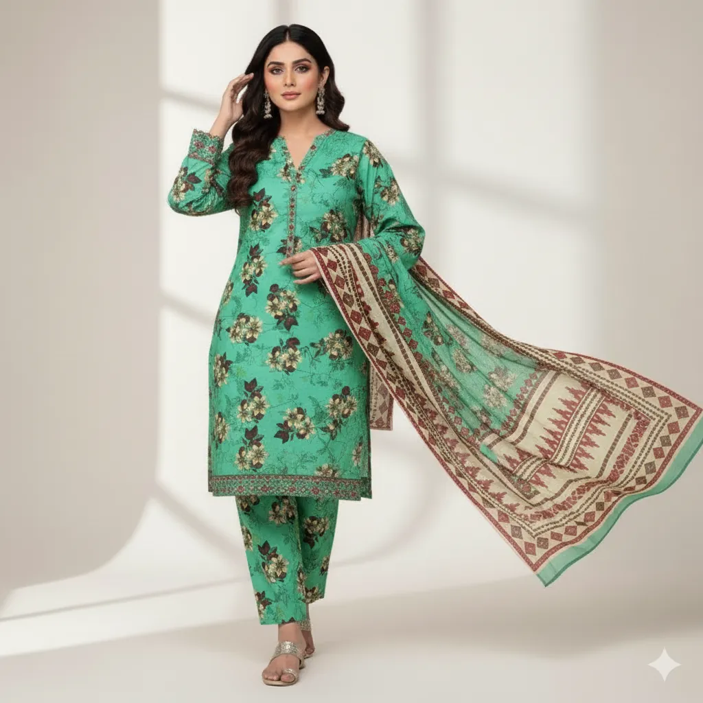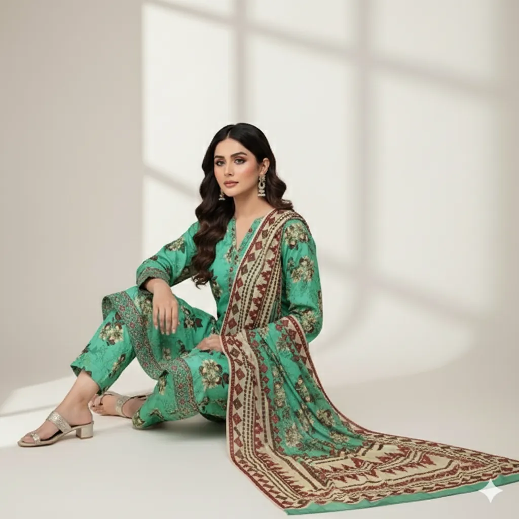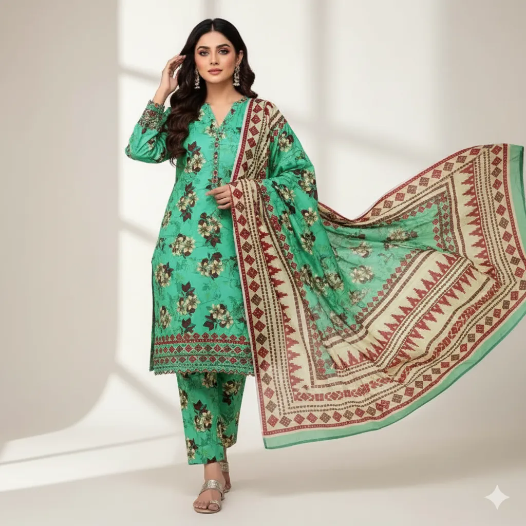 Maria B. Digital Printed All-Over Shirt, Trouser & Dupatta Linen Suit - Mint Green & Red. Step into style with this exquisite 3-piece suit from the MARIA.B. linen collection. The digitally printed all-over linen shirt and trouser are adorned with a beautiful floral print in mint green, complemented by subtle hints of red and white. The outfit is completed with a gorgeous digital printed linen dupatta that features a bold geometric design with red and white accents, providing a stunning contrast. The outclass fabric and guaranteed colors ensure a comfortable and stylish look that is perfect for any occasion.