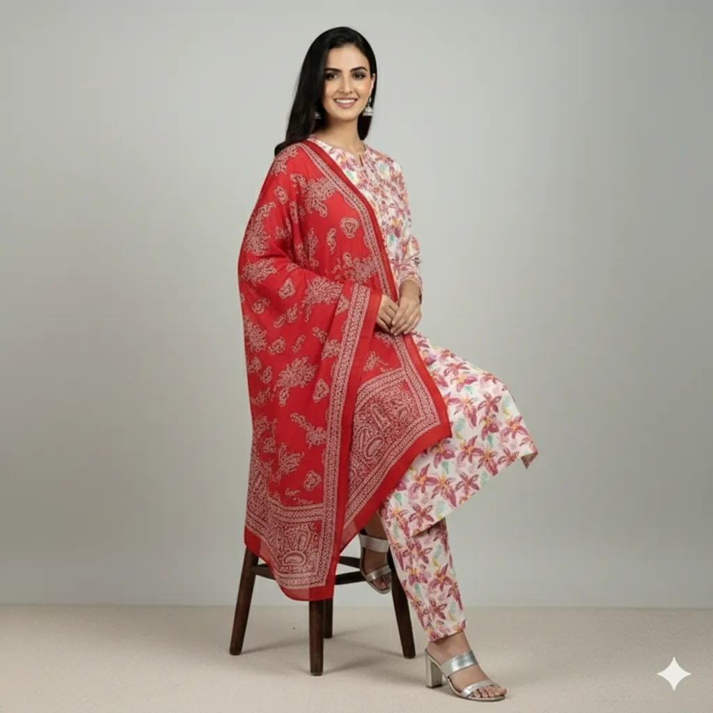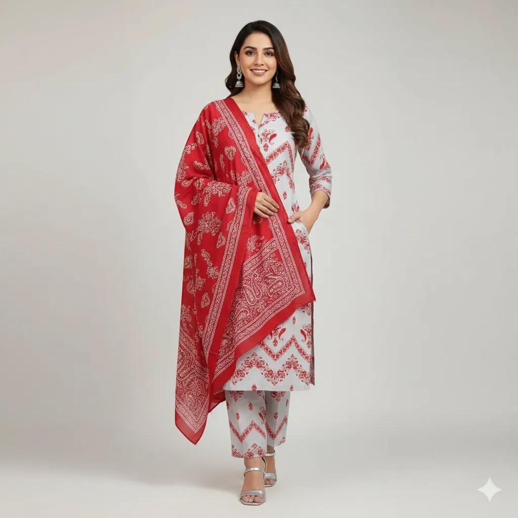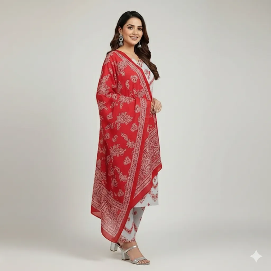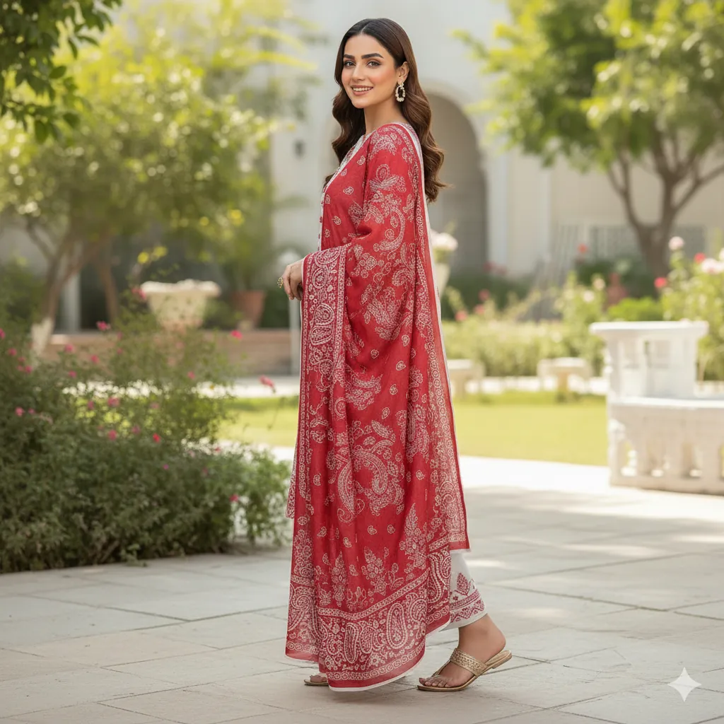 Maria B. Digital Printed All-Over Shirt, Trouser & Dupatta Linen Suit - Red & White. Make a bold statement with this beautiful 3-piece suit from the MARIA.B. linen collection. The digitally printed all-over linen shirt and trouser feature a detailed floral and geometric print on a clean white background, providing a rich contrast to the vibrant red. The ensemble is completed with a magnificent digital printed linen dupatta that is covered in a striking red and white paisley pattern, adding a touch of traditional elegance. The outclass fabric and guaranteed colors ensure a comfortable and stylish appearance that is perfect for any occasion.