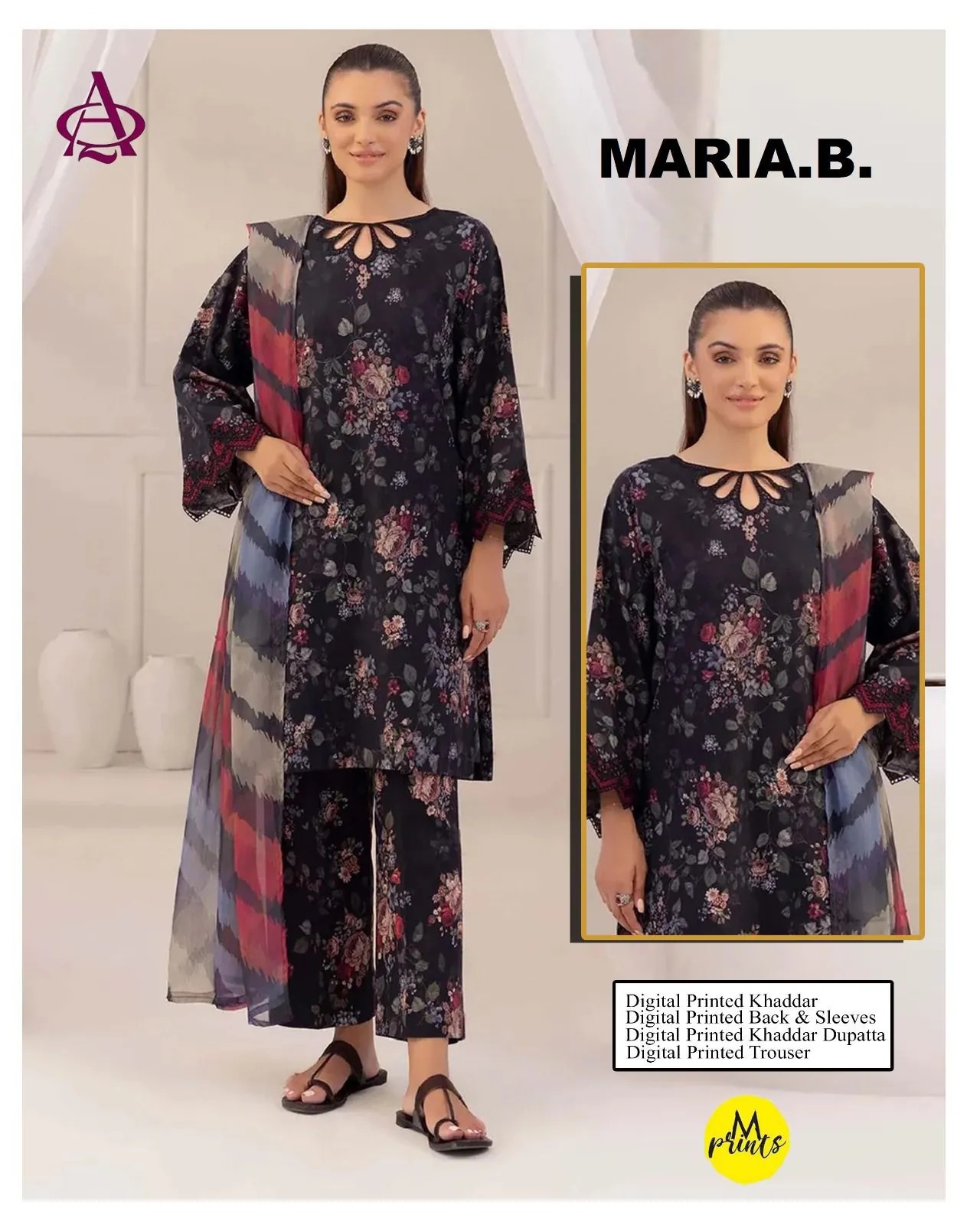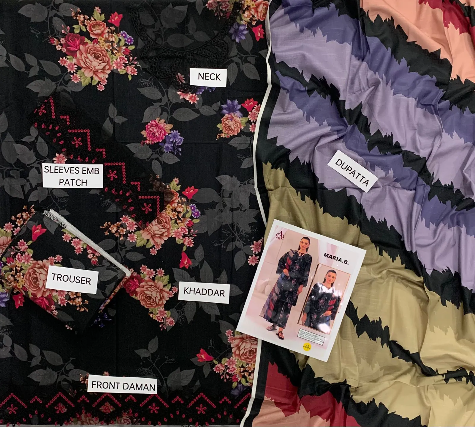 Maria B Inspired Black Floral Khadder 3-Piece Unstitched Suit | Embroidered Neck & Sleeves Patches | Digital Print Shawl