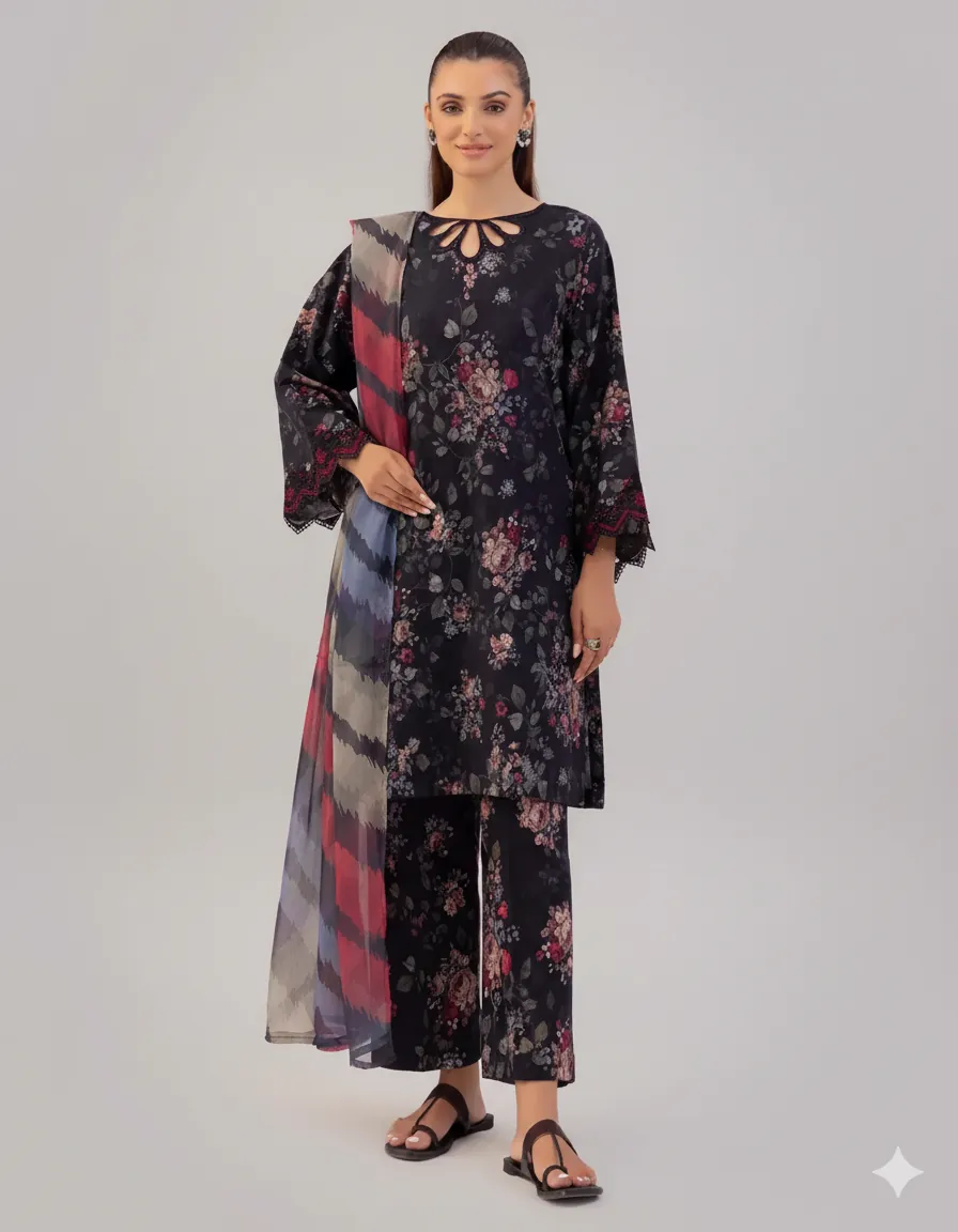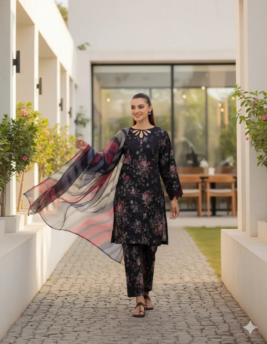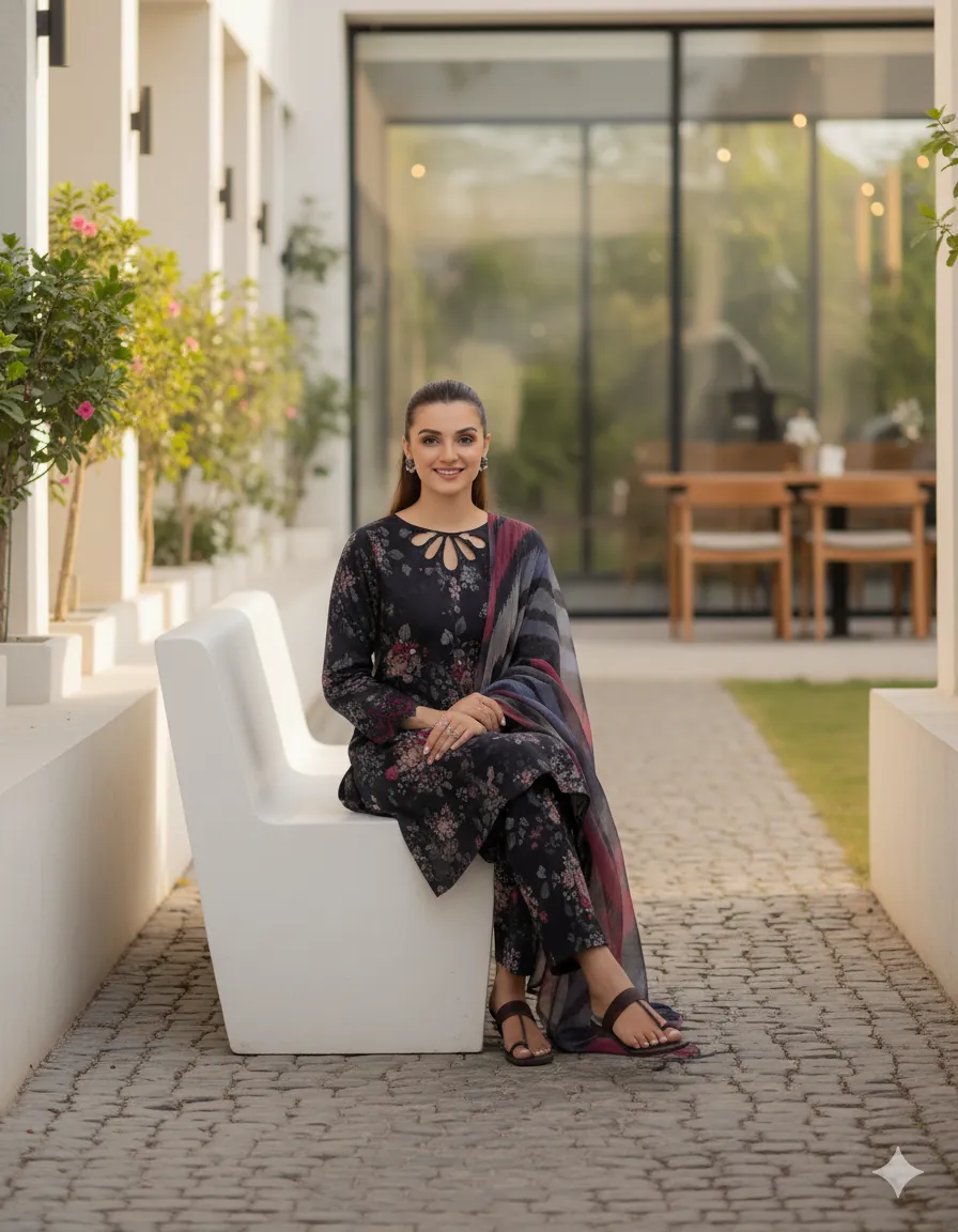 Introducing a chic design from our Alhamdulillah Khadder Collection, inspired by the signature style of Maria B. This 3-piece unstitched suit is a luxurious addition to your winter wardrobe, crafted from high-quality, warm khadder fabric for exceptional comfort. The shirt features an elegant black base adorned with bold, vivid floral prints in shades of dusty rose, deep purple, and red. The suit allows for custom tailoring and includes separate, finely detailed embroidered patches for the neck and the sleeves (bazu), along with a printed daman patch for the front hem. The ensemble is completed with a striking digital printed shawl (dupatta) featuring a contemporary zig-zag/chevron pattern in complementary shades of lilac, purple, black, and beige. All components—shirt, trouser, back, sleeves, and shawl—are made from premium khadder quality, ensuring a rich texture and feel. Perfect for making a sophisticated statement this season.