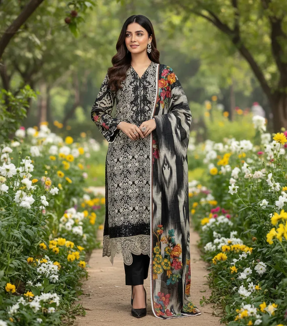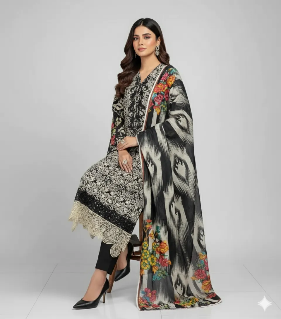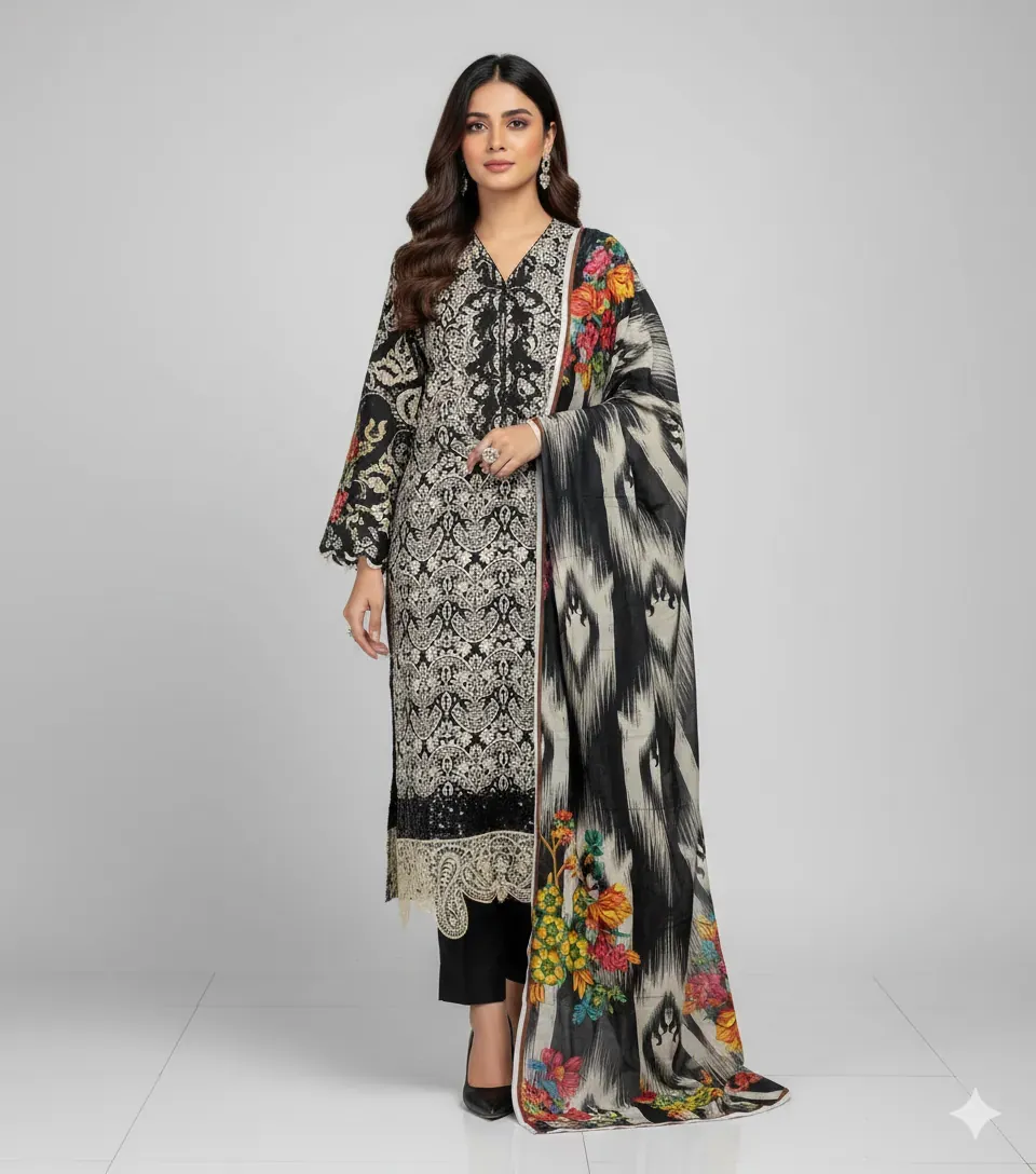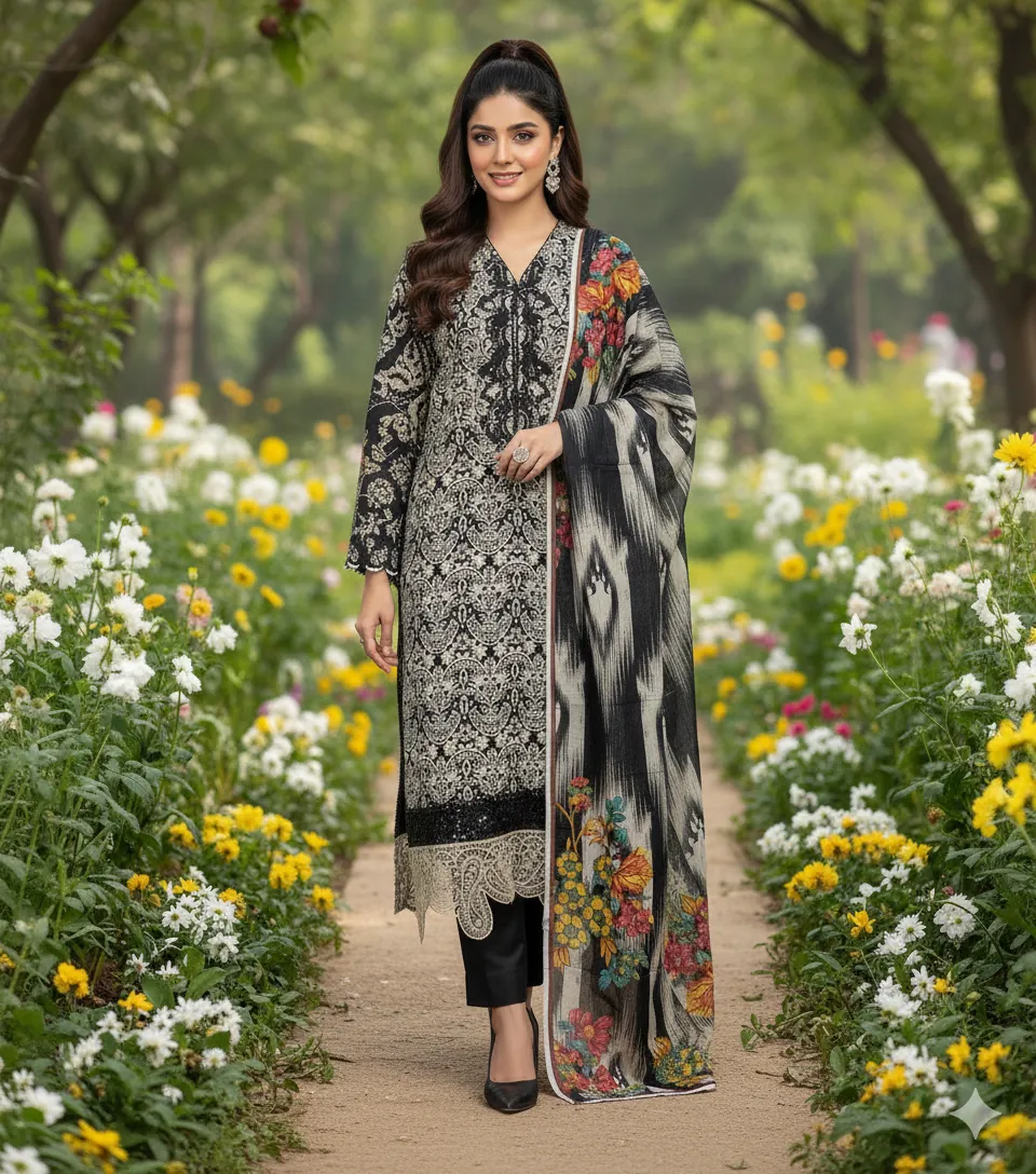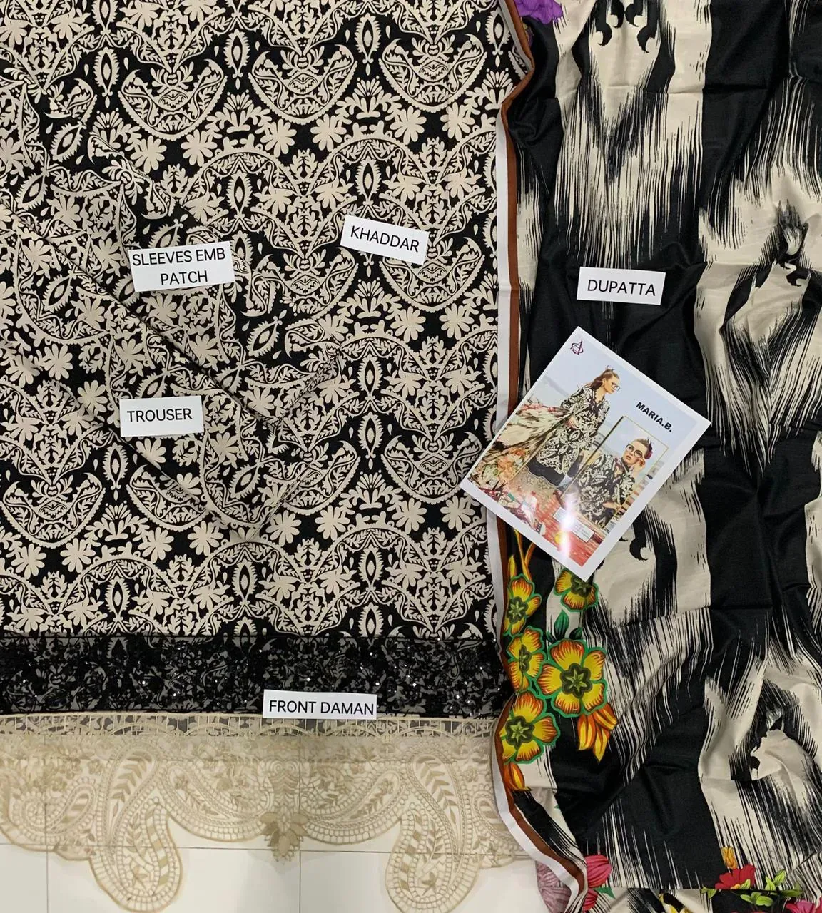 Step out in style with this gorgeous unstitched 3-piece Maria B. inspired suit. The dress features a stunning black and white color palette, with a Khaddar fabric that is perfect for the season. The intricate embroidery on the daman (front bottom) and sleeves adds a touch of sophistication and elegance. The set includes a beautifully printed dupatta and a plain black trouser. This versatile outfit is ideal for a semi-formal event or a casual day out. The unstitched fabric allows you to customize the fit and design to your liking.