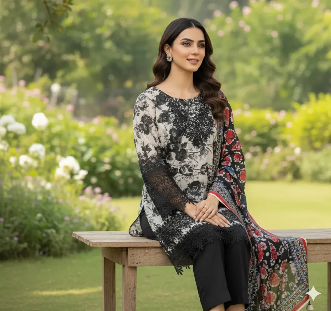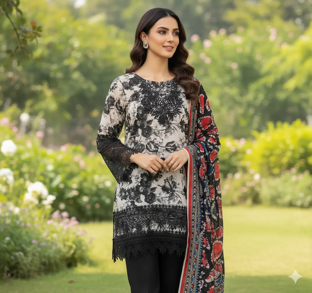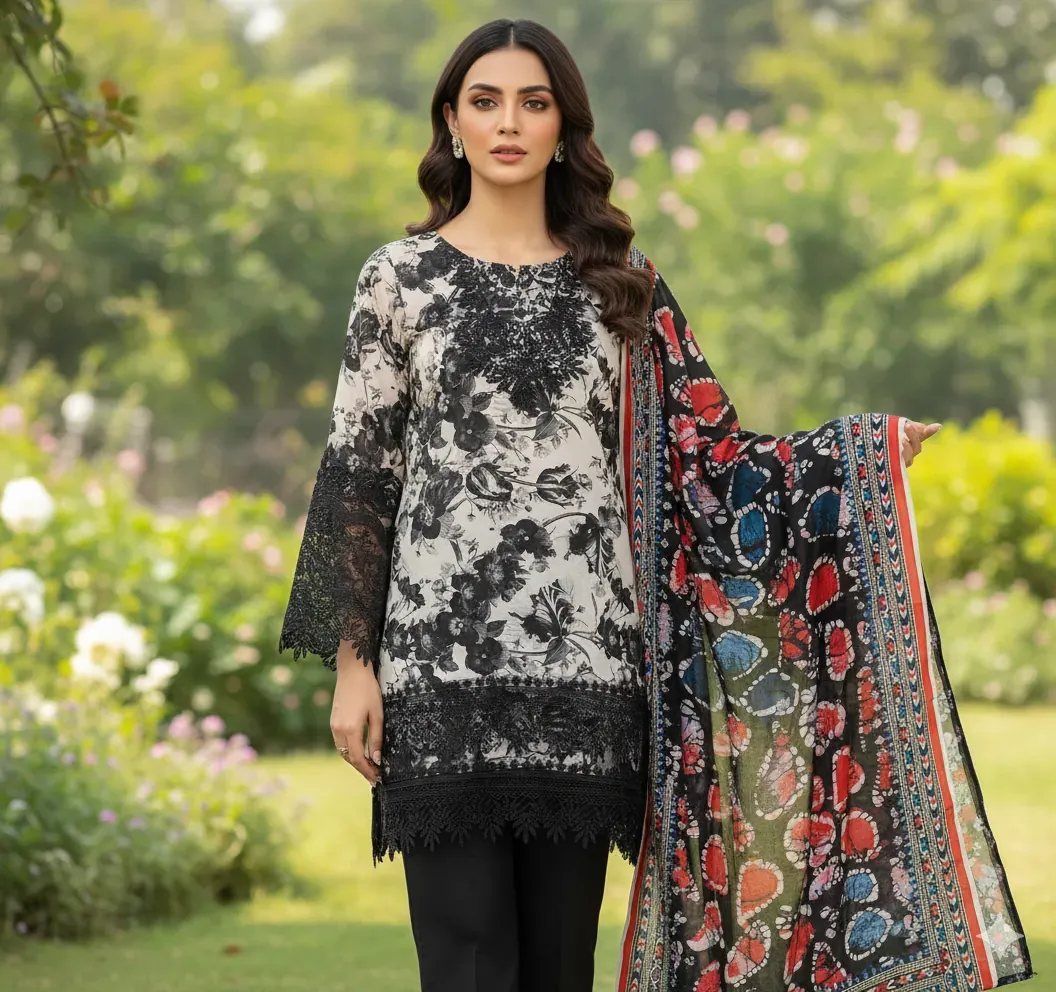 Step out in style with this stunning Maria B. inspired Khaddar suit. This unstitched 3-piece set is a perfect blend of classic elegance and modern flair. The shirt and trousers are crafted from high-quality Khaddar fabric with a sophisticated black and white floral pattern. The outfit is elevated by a separate, intricately embroidered neck and sleeves patch, adding a touch of luxury. The standout feature is the vibrant and eye-catching dupatta, which features a beautiful butterfly print with bold red and blue accents, creating a stunning contrast. The comfortable and breathable Khaddar fabric makes this suit ideal for the cooler seasons. Whether you're dressing up for a special event or a casual outing, this suit offers a unique and fashionable look at a wholesale price.