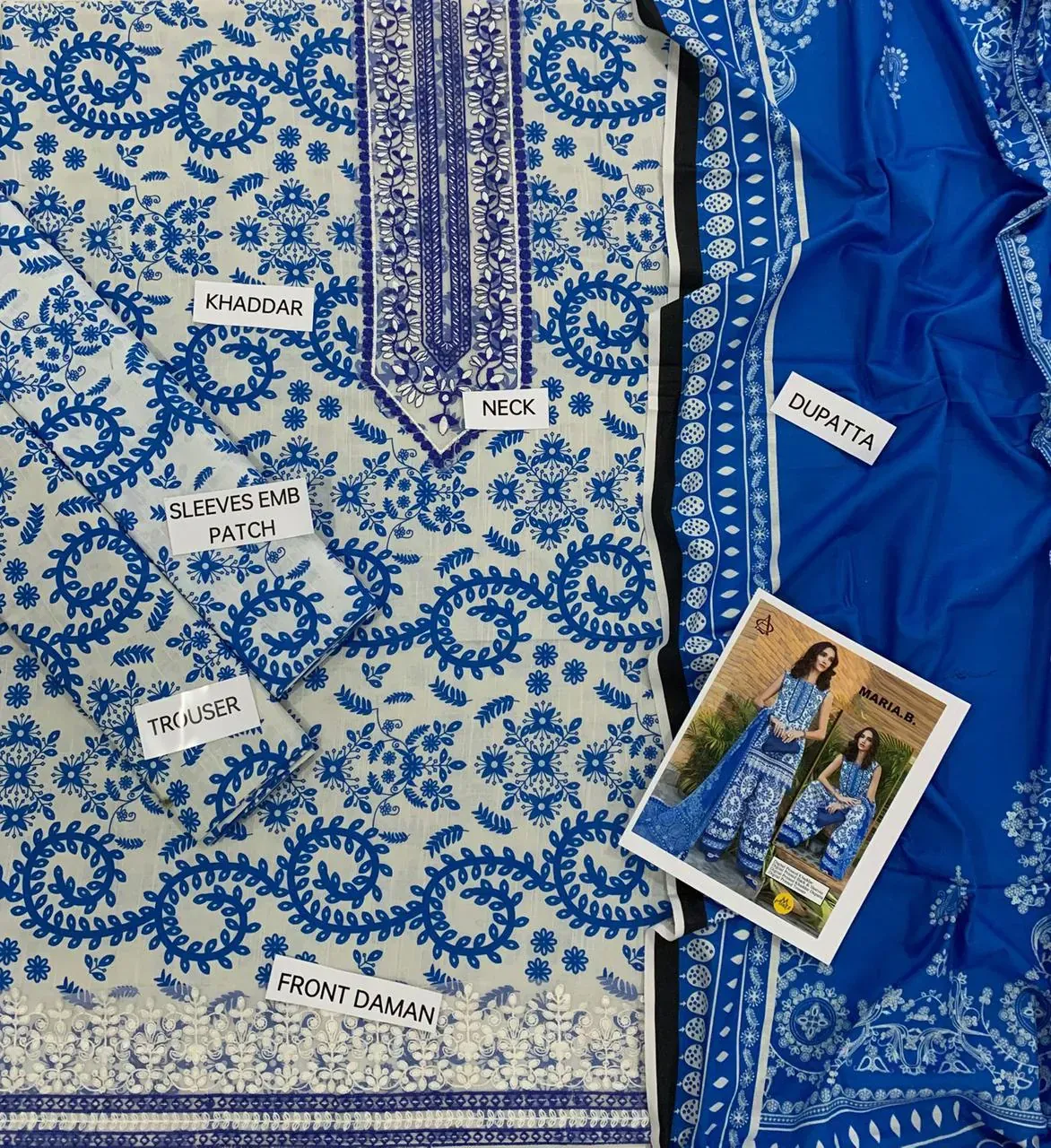 Maria B Inspired Khaddar Embroidered Suit | 3-Piece Unstitched Blue & White Floral Dress with Dupatta & Trousers | Elegant Winter Collection