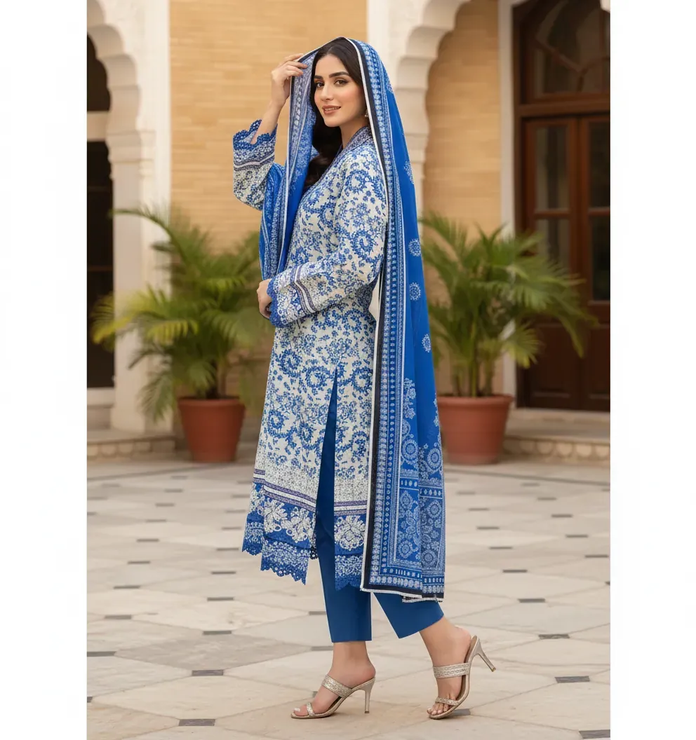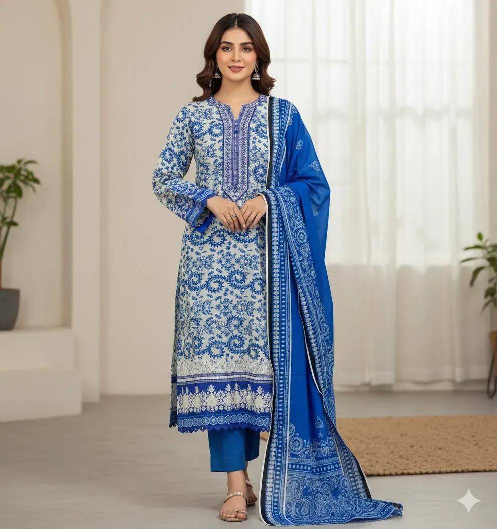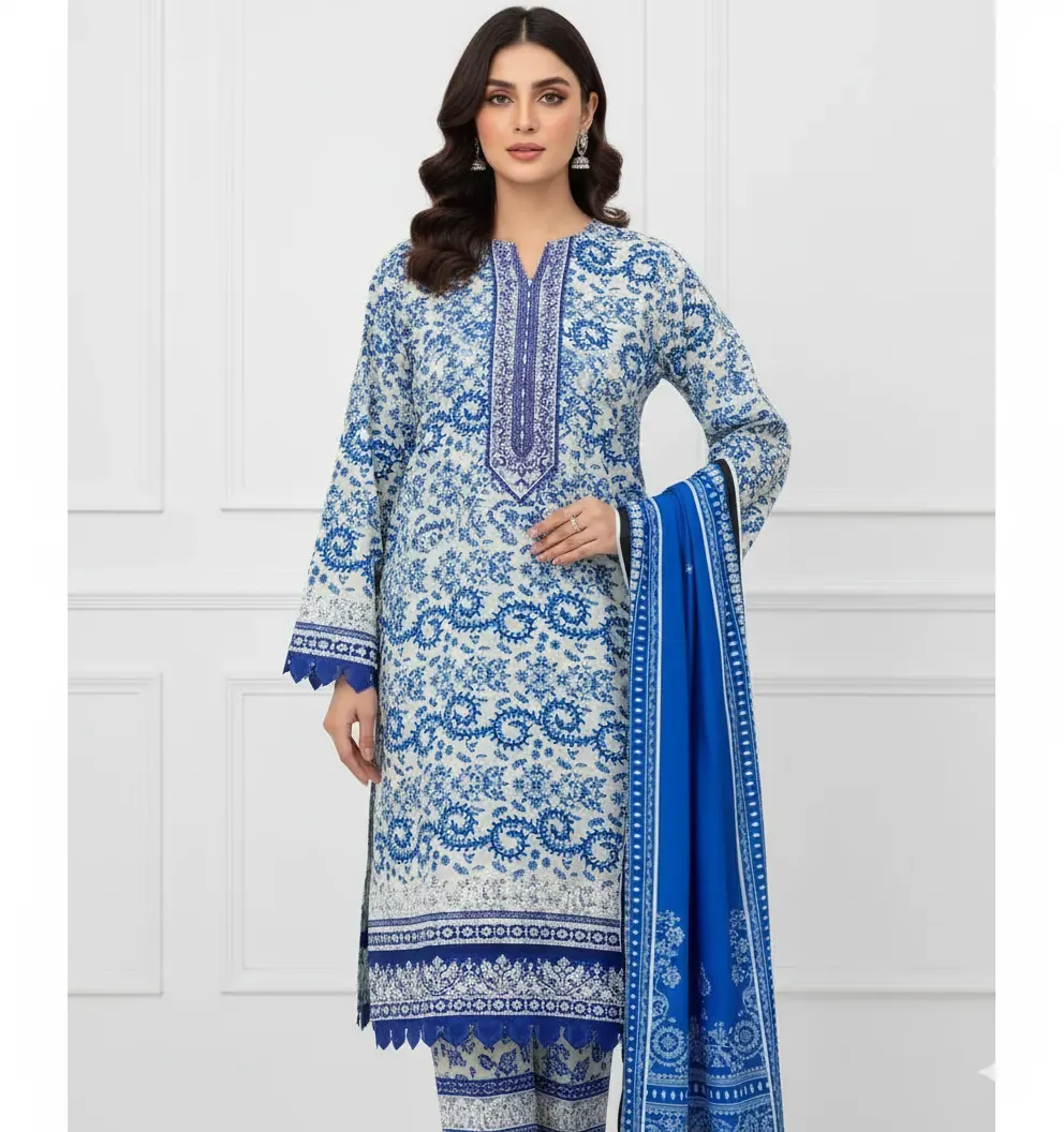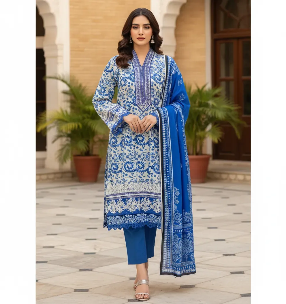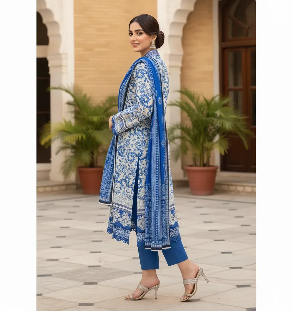 Step out in style this winter with our exquisite Maria B inspired Khaddar suit. This luxurious 3-piece unstitched ensemble boasts a sophisticated blue and white floral pattern throughout the high-quality Khaddar fabric. The kameez features a meticulously embroidered neck design and an elegant front daman, complemented by a separate embroidered patch for the sleeves, allowing for custom tailoring. The set includes a generous Khaddar dupatta with coordinating patterns and a plain Khaddar trouser fabric for a complete and cohesive look. Ideal for creating a graceful and comfortable outfit for any occasion, from casual gatherings to semi-formal events. Experience the blend of traditional charm and contemporary fashion.
