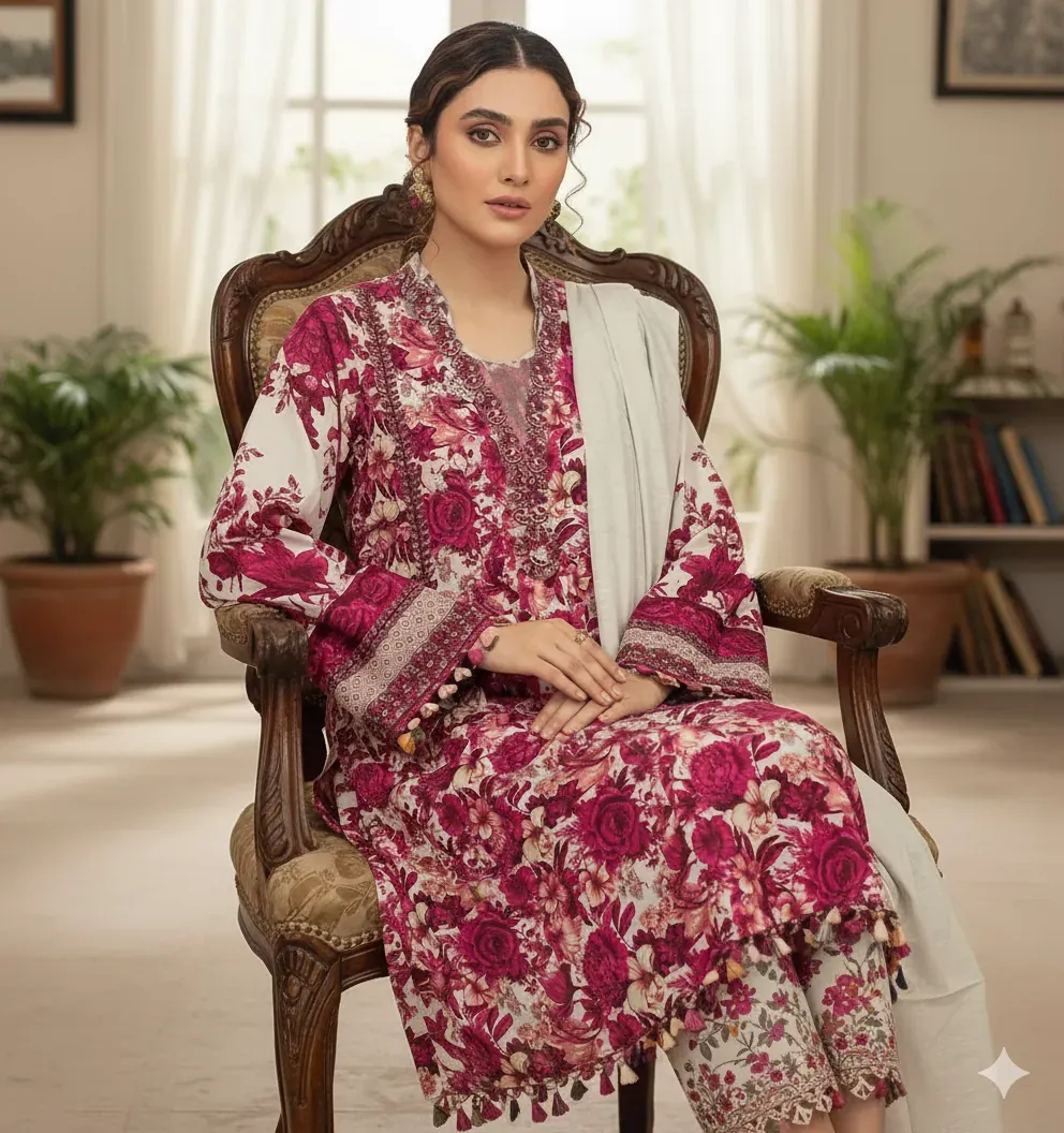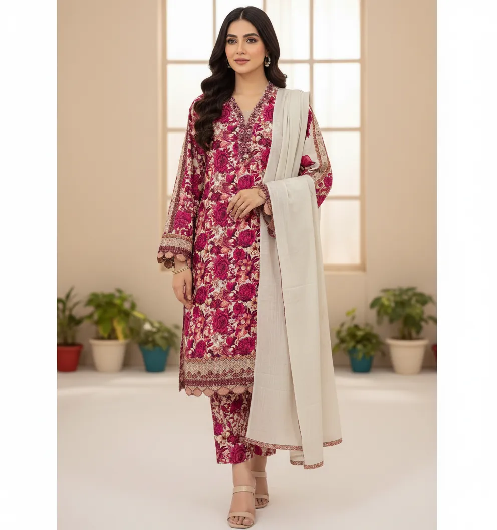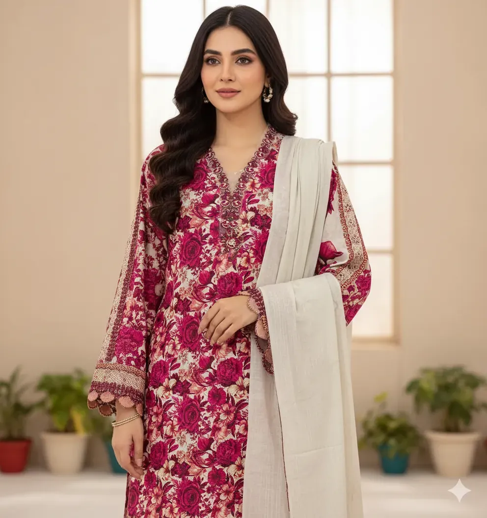 Step out in style this winter with our exquisite Maria B inspired Khaddar suit. This luxurious 3-piece unstitched ensemble boasts a sophisticated pink and white floral pattern throughout the high-quality Khaddar fabric. The kameez features a meticulously embroidered neck design and an elegant front daman, complemented by a separate embroidered patch for the sleeves, allowing for custom tailoring. The set includes a generous Khaddar dupatta with coordinating patterns and a plain Khaddar trouser fabric for a complete and cohesive look. Ideal for creating a graceful and comfortable outfit for any occasion, from casual gatherings to semi-formal events. Experience the blend of traditional charm and contemporary fashion.