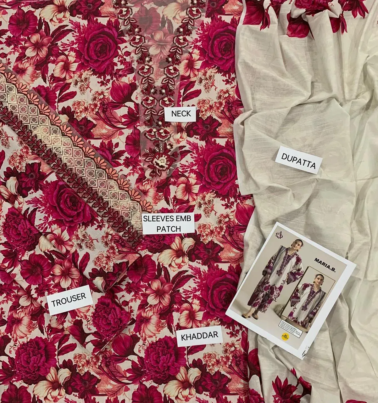 Maria B Inspired Khaddar Embroidered Suit | 3-Piece Unstitched Pink & White Floral Dress with Dupatta & Trousers | Elegant Winter Collection