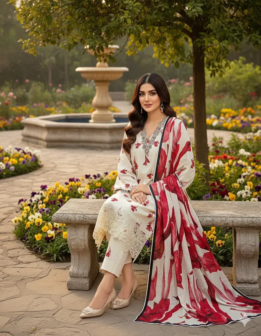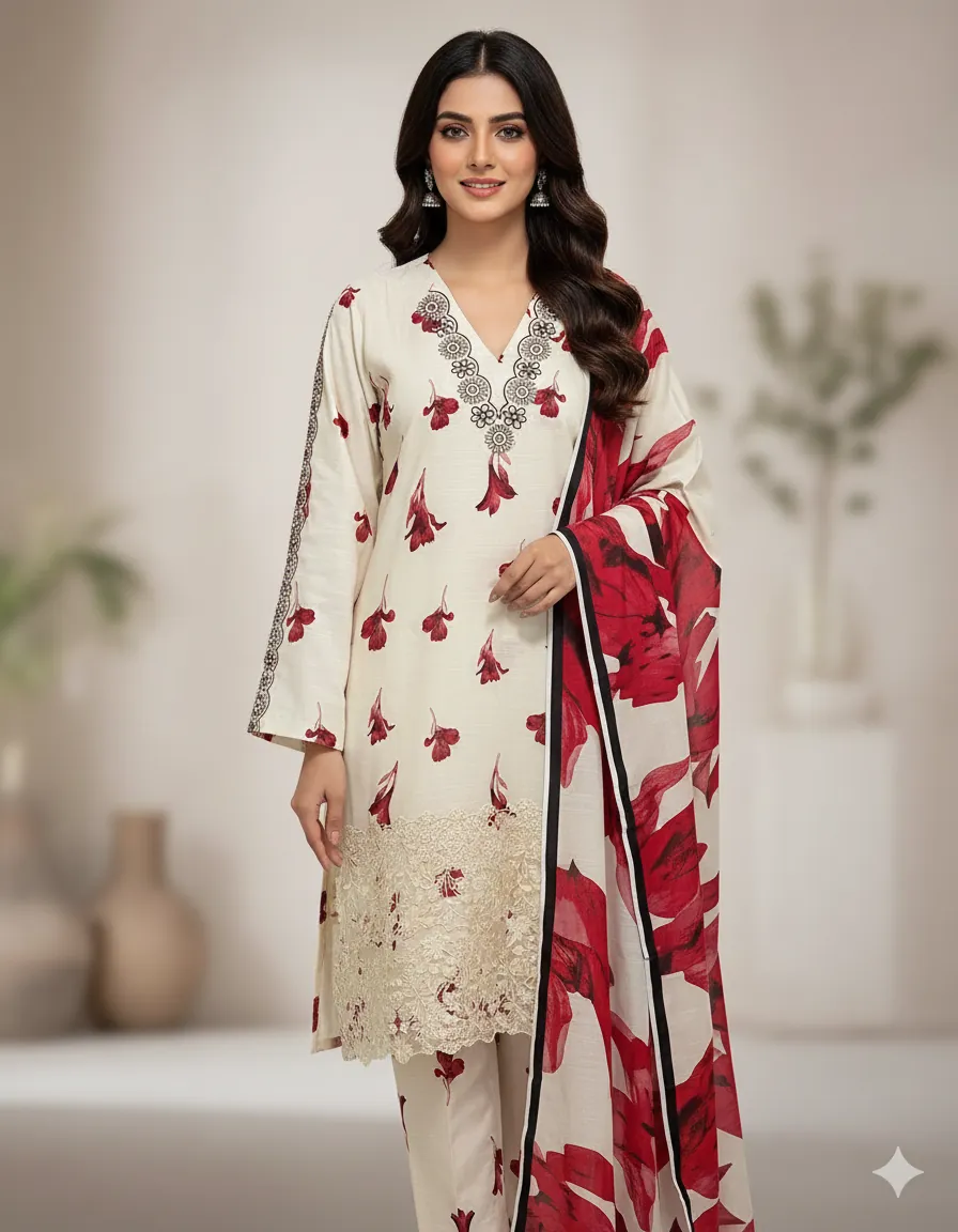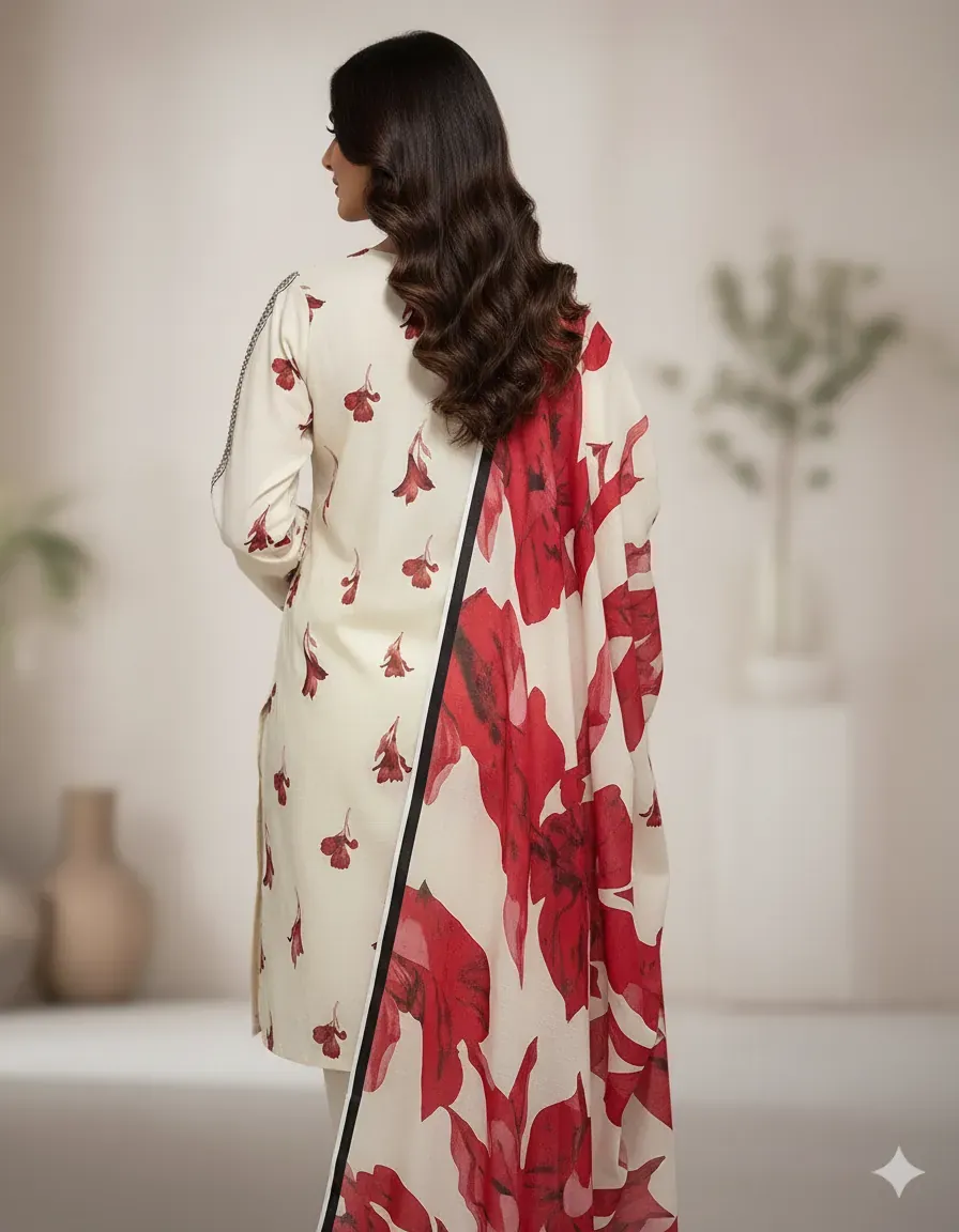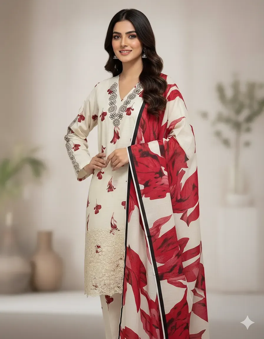 Embrace elegance with this stunning unstitched 3-piece Maria B. inspired suit. The dress features a beautiful cream base with vibrant red floral prints, crafted from comfortable Khaddar fabric, perfect for various seasons. The intricate embroidery on the neck and daman (front bottom) adds a touch of sophistication and charm. The set includes a beautifully printed dupatta with bold red patterns and plain trousers. This versatile outfit is ideal for semi-formal gatherings, festive occasions, or a stylish casual look. The unstitched fabric allows you the freedom to customize the fit and design to your personal preference, ensuring a unique and flattering silhouette.