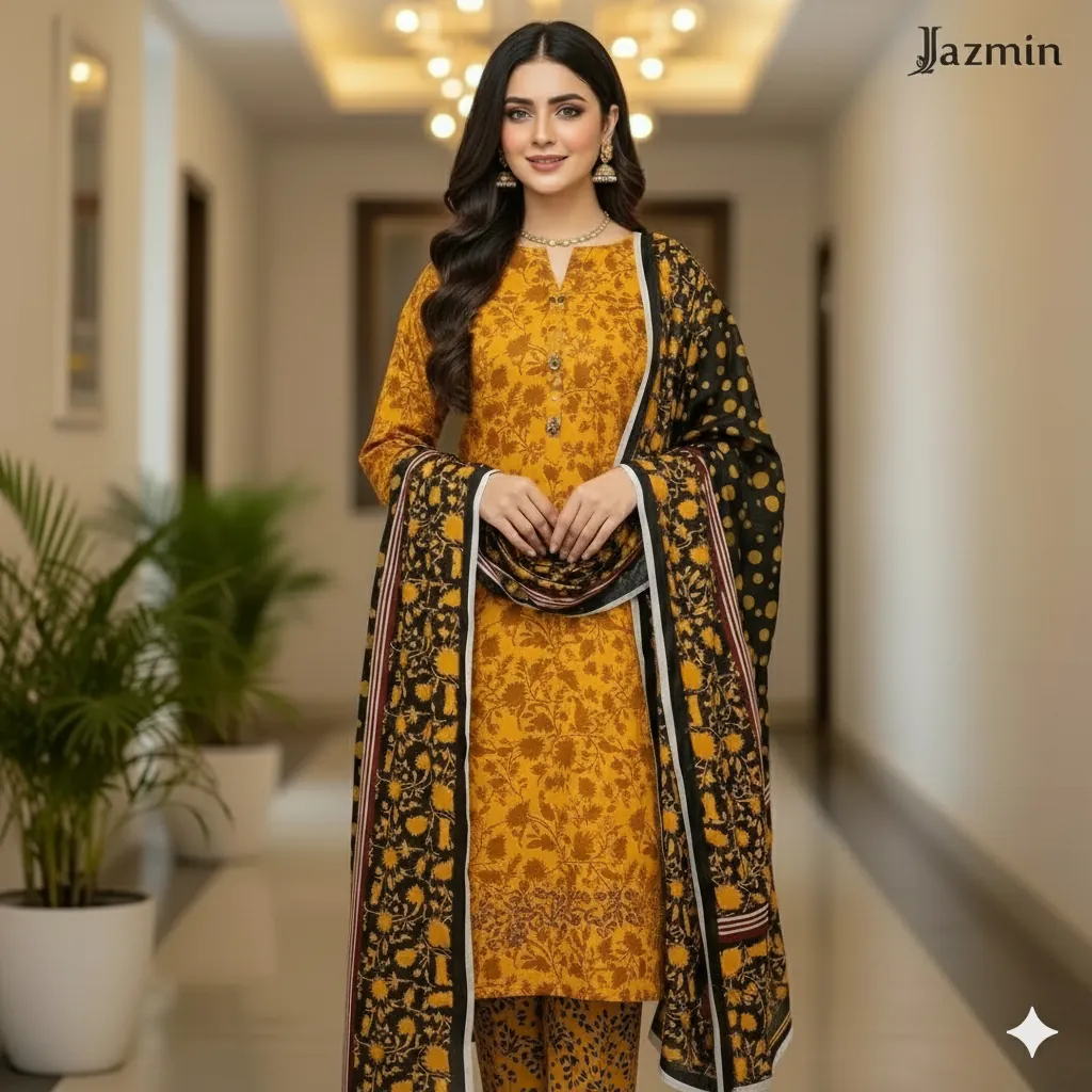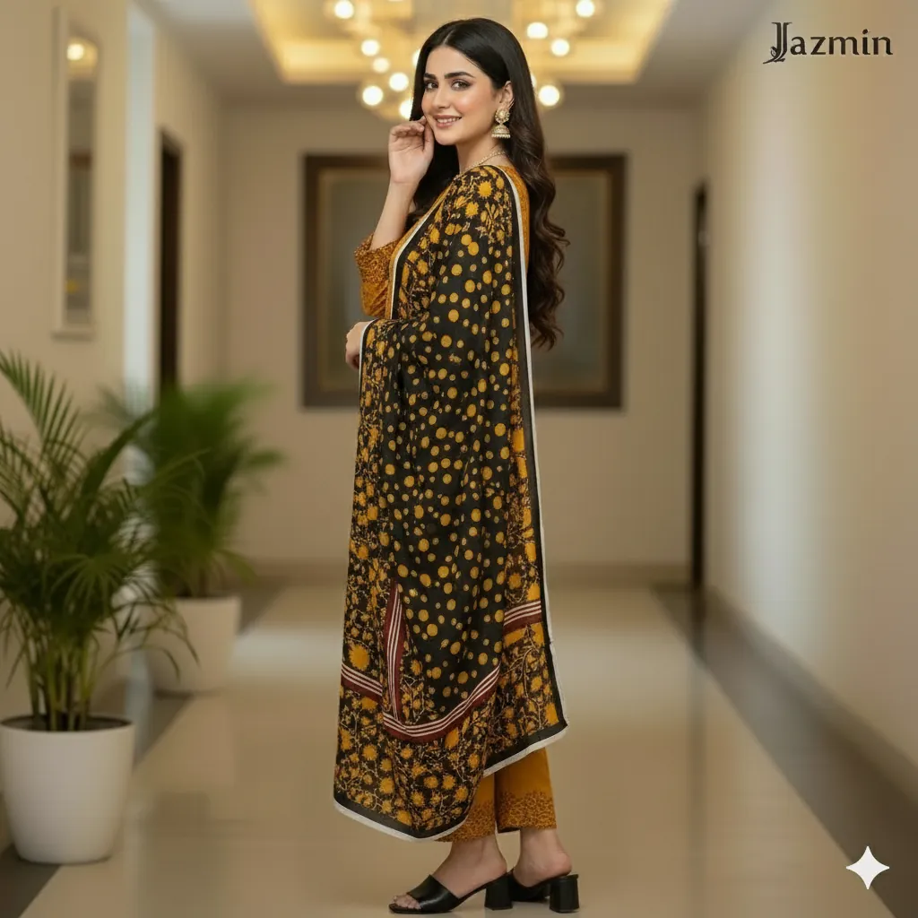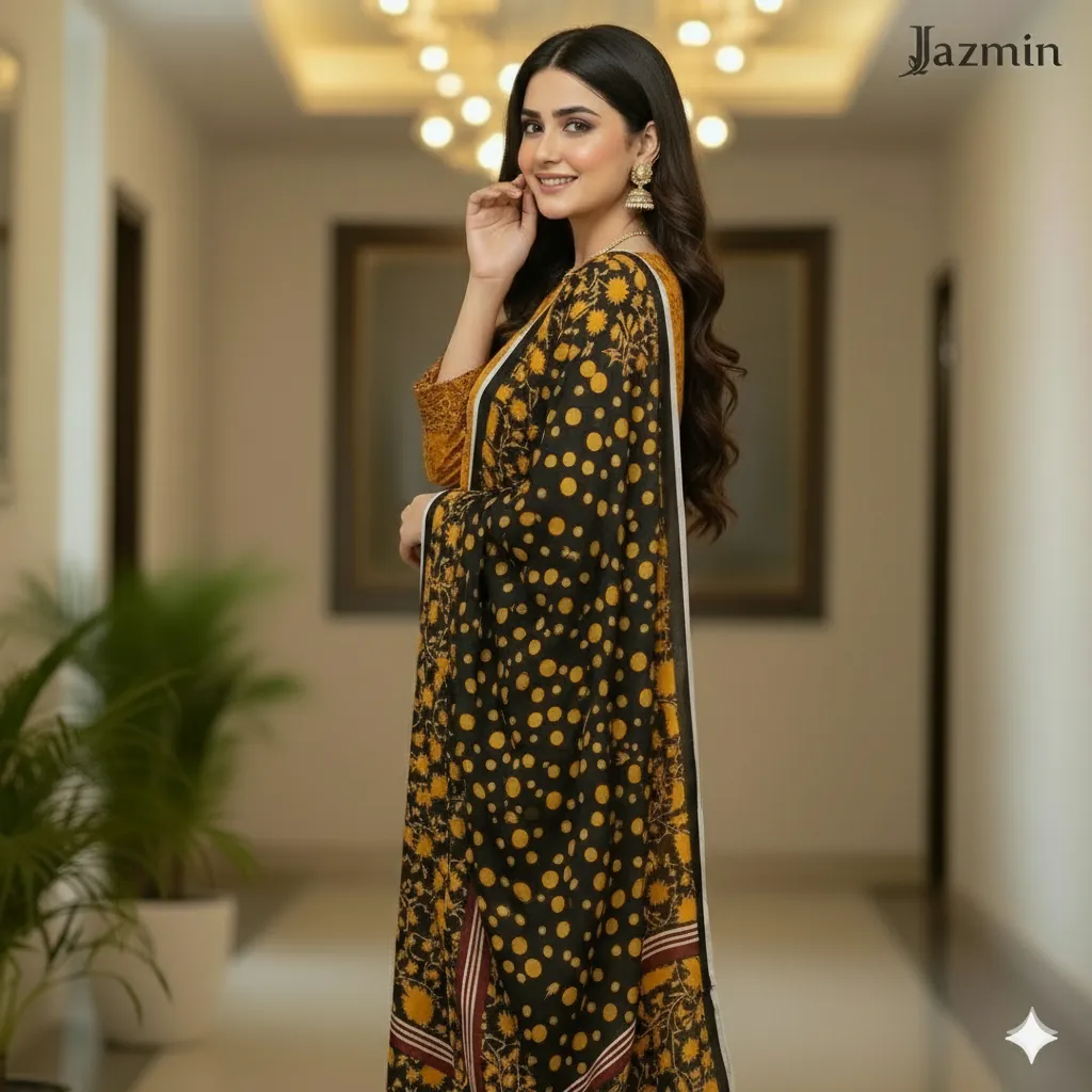 Maria B Iznik Baroque Charizma Linen 3Pc Suit – Mustard & Black Allover Printed | Digital Dupatta Collection. Premium Linen 3Pc 72/72 Suit from Maria B Iznik Baroque Charizma Collection. Features mustard & black allover printed shirt, matching printed trouser, and digital printed linen dupatta. Perfect blend of elegance and comfort.Discover timeless elegance with this Maria B Iznik Baroque Charizma Linen Collection 3Pc Suit. Made from premium linen 72/72 fabric, this outfit is designed for both comfort and luxury. The mustard & black combination enhances its classy appeal.The set includes an allover printed shirt, a printed trouser, and a digital printed linen dupatta that adds modern charm. Ideal for casual, semi-formal, or festive wear, this suit is a must-have for your winter and mid-season wardrobe.