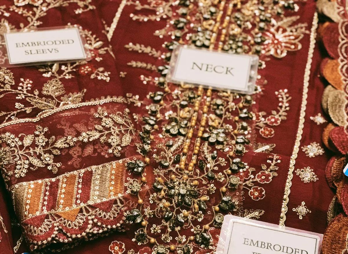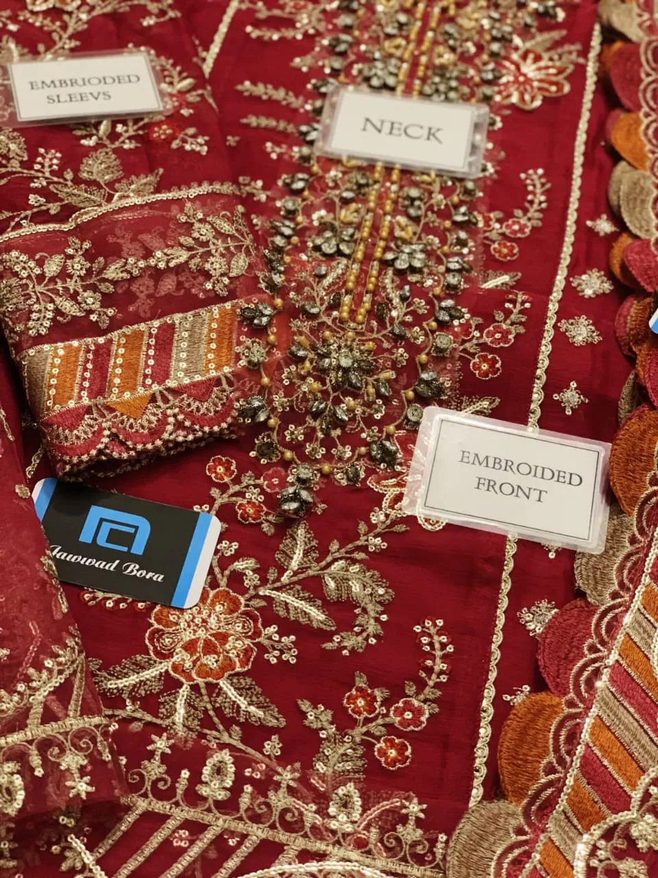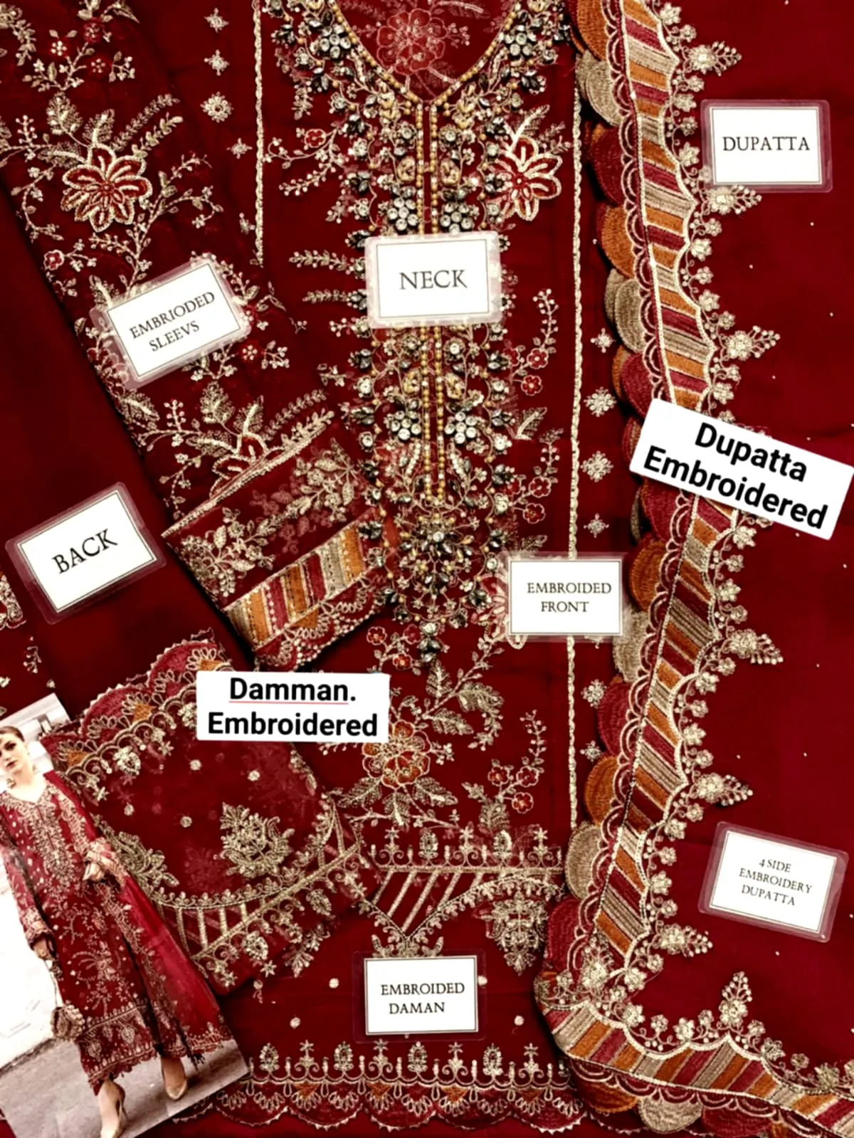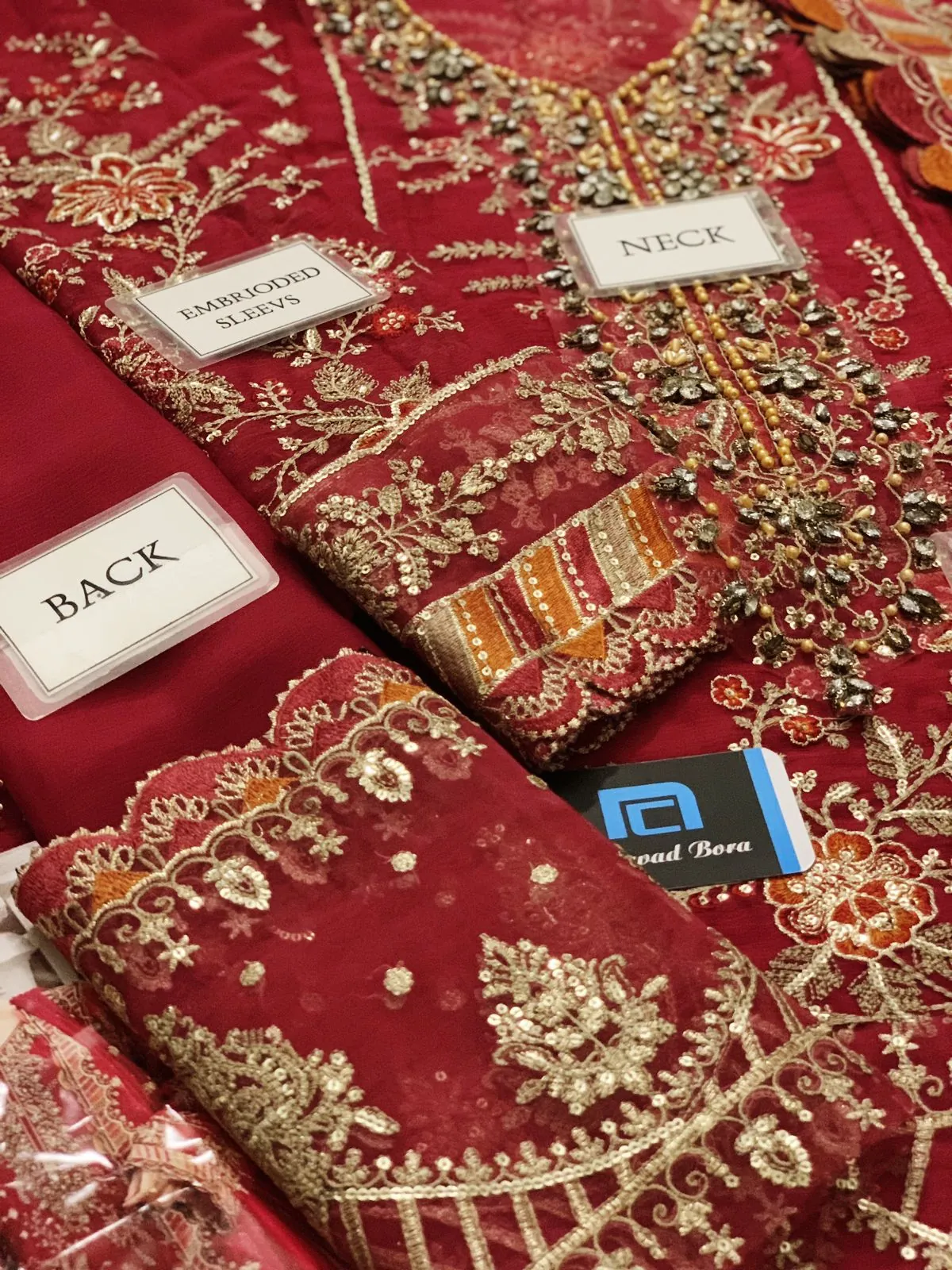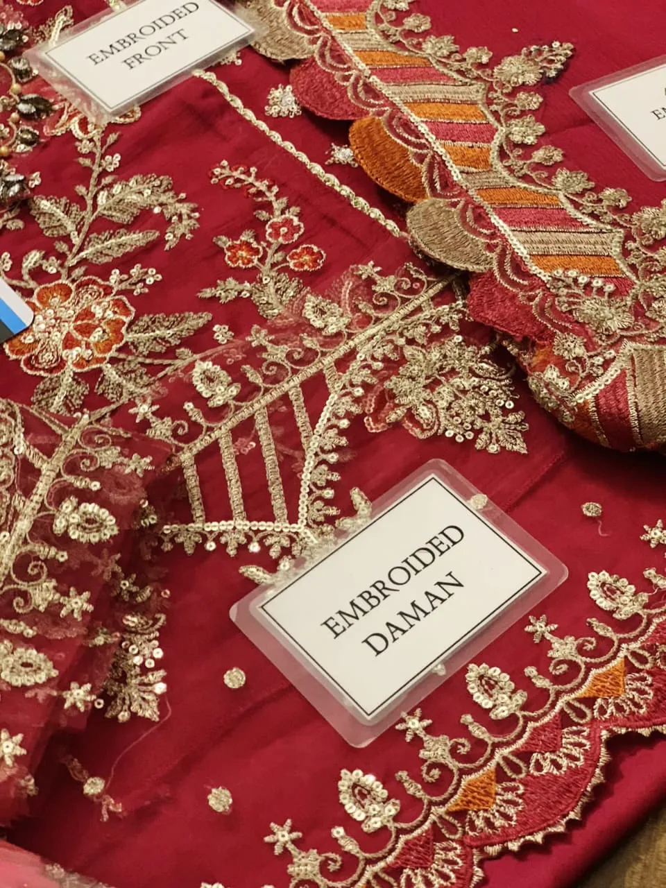 Introducing a replica of the MOST HIT DESIGN from MARIA B's New Catalog (Article #MBC-1098). This elegant 3-piece unstitched suit is available in beautiful colors, including a rich Red/Pink/Mehroon shade.