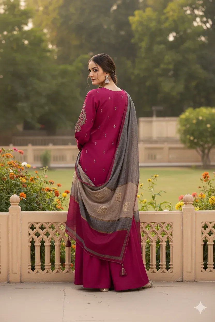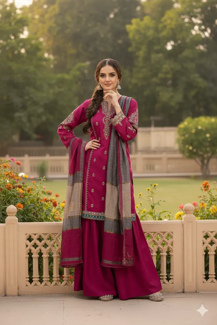 Discover timeless elegance with the Maria B. Airjet Dhanak Embroidered Collection. This 3-piece unstitched suit is crafted from premium Dhanak fabric, ensuring both comfort and a sophisticated drape. The shirt is adorned with intricate and heavy embroidery on the front, creating a stunning focal point. The ensemble is completed with a rich, multi-colored digital printed pashmina shawl and a premium quality dyed trouser, making it a complete and guaranteed-to-impress outfit. Whether for a formal event or a special gathering, this suit is a must-have addition to your collection.