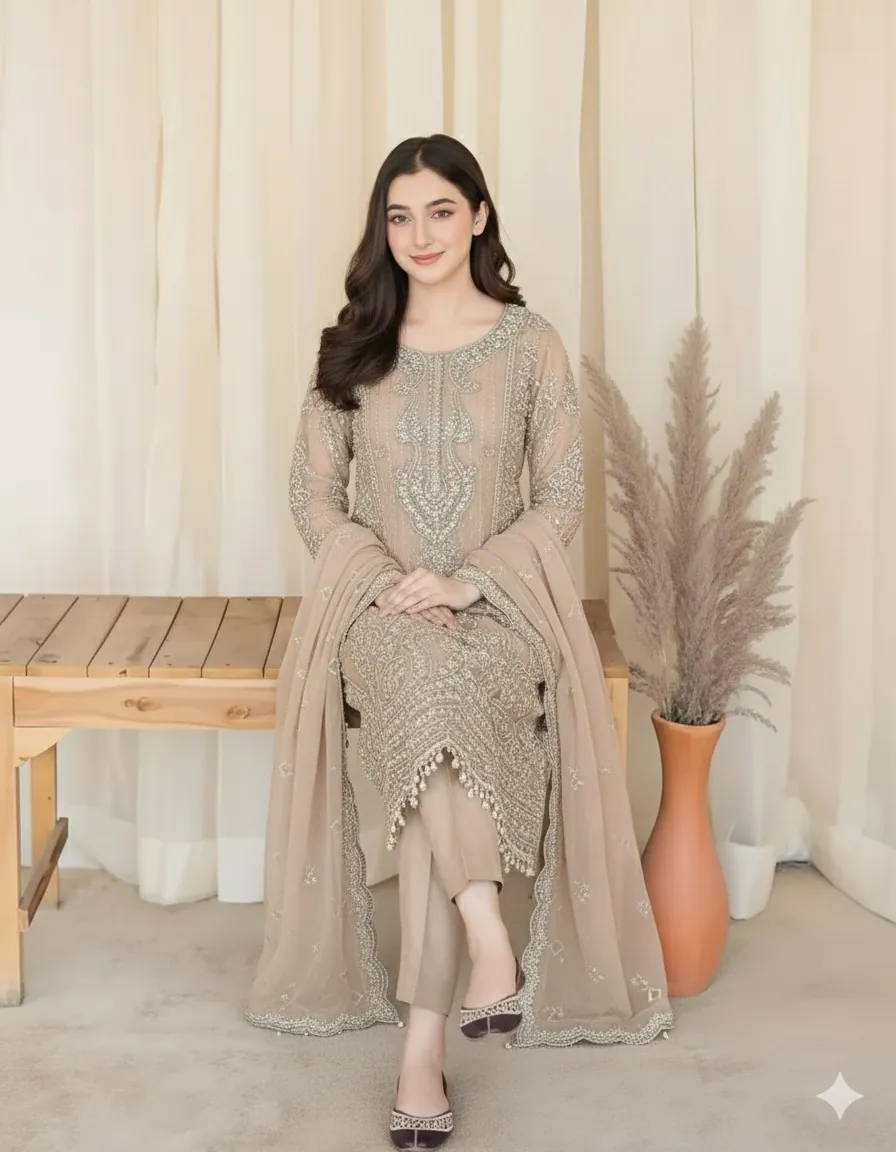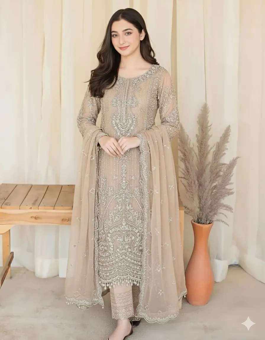 Unveiling the exquisite Maria B Style Heavy Embroidered Formal Collection in a sophisticated Skin tone. This luxurious 3-piece suit, a premium "King Copy like Original," is designed for grand festive and wedding occasions.