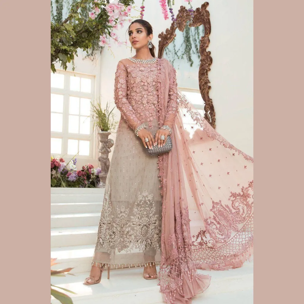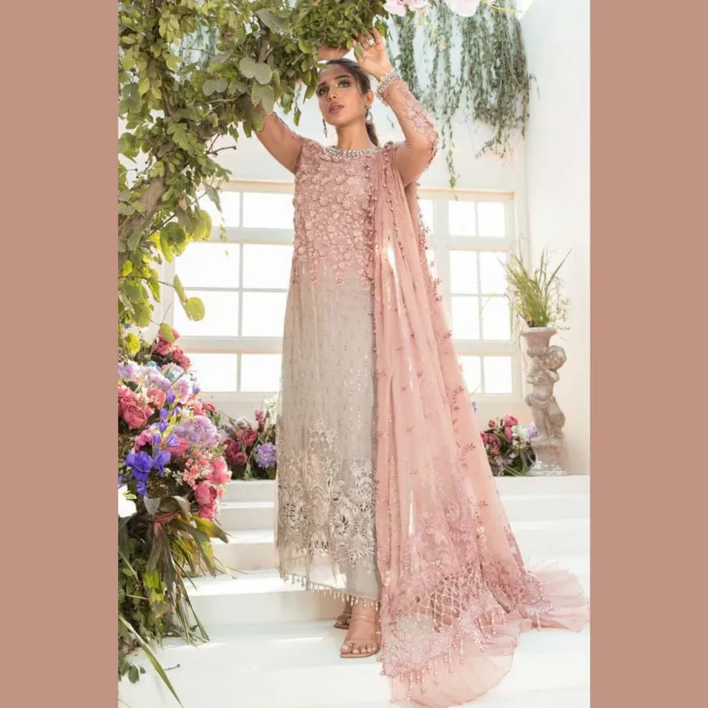 Perfect for weddings, festive parties, and formal events, this unstitched luxury outfit lets you customize your style while carrying the signature glamour of Maria.B.