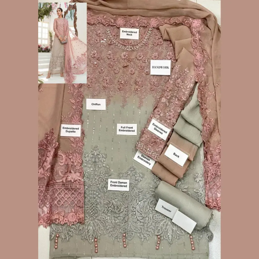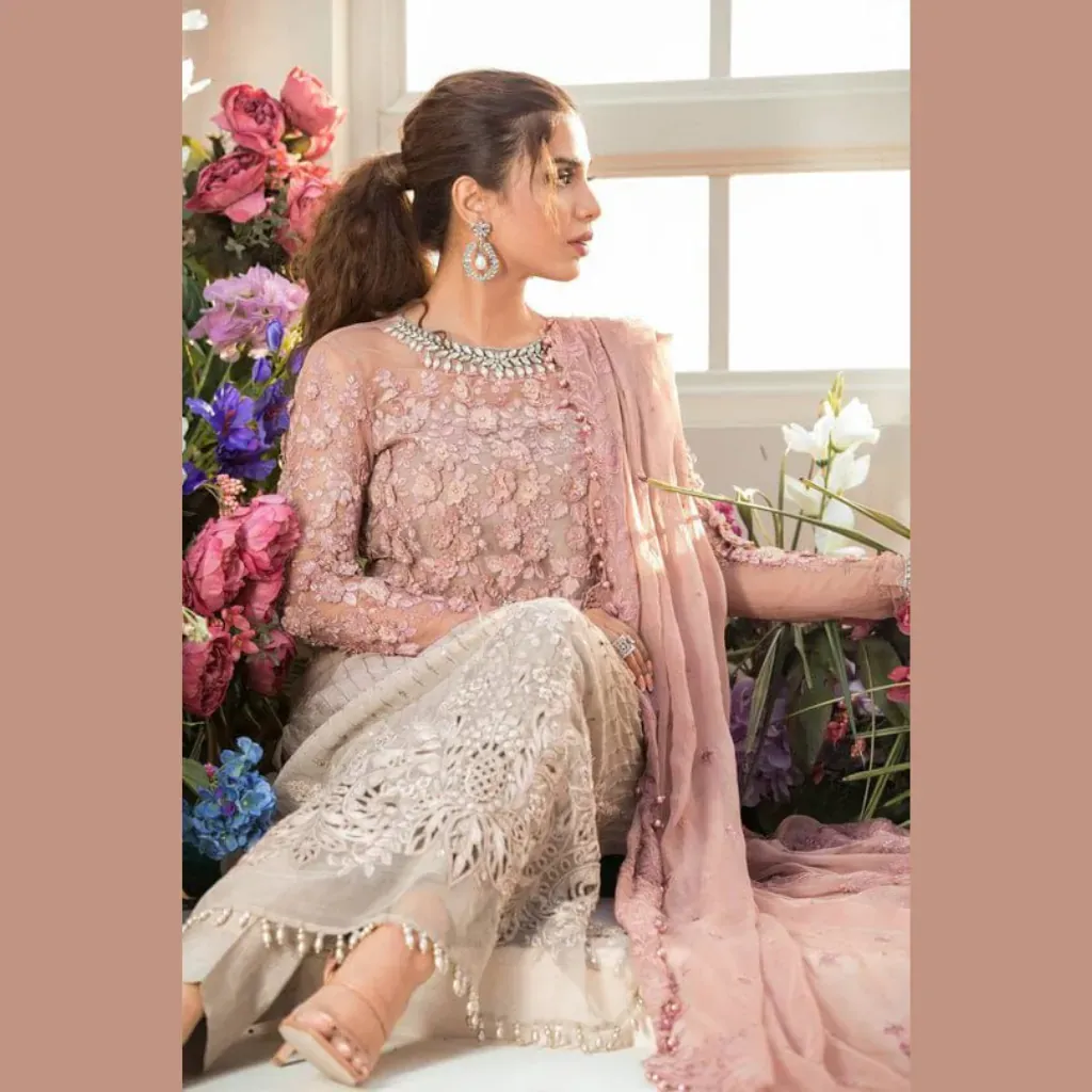 The chiffon shirt is beautifully adorned with embroidery and 3D flowers, paired with an elegant embroidered daman patch and embellished neckline that enhances its royal charm. The embroidered chiffon sleeves with borders add sophistication, while the plain malai trouser balances the look with a sleek finish. To complete the attire, the embroidered chiffon dupatta (ready-to-wear) adds a touch of timeless elegance.