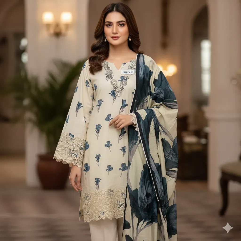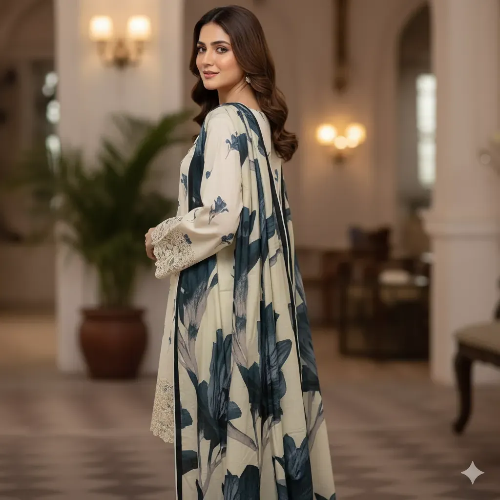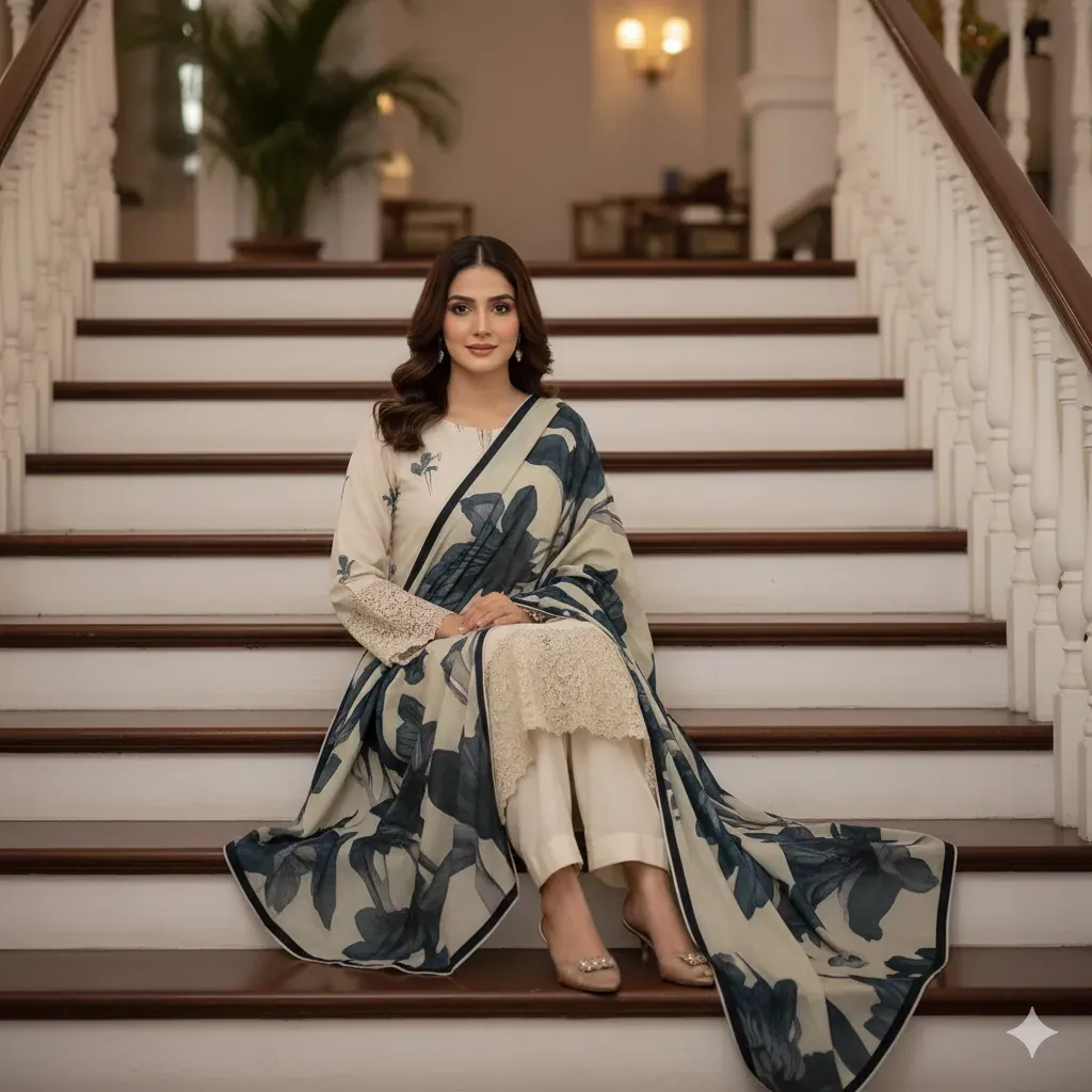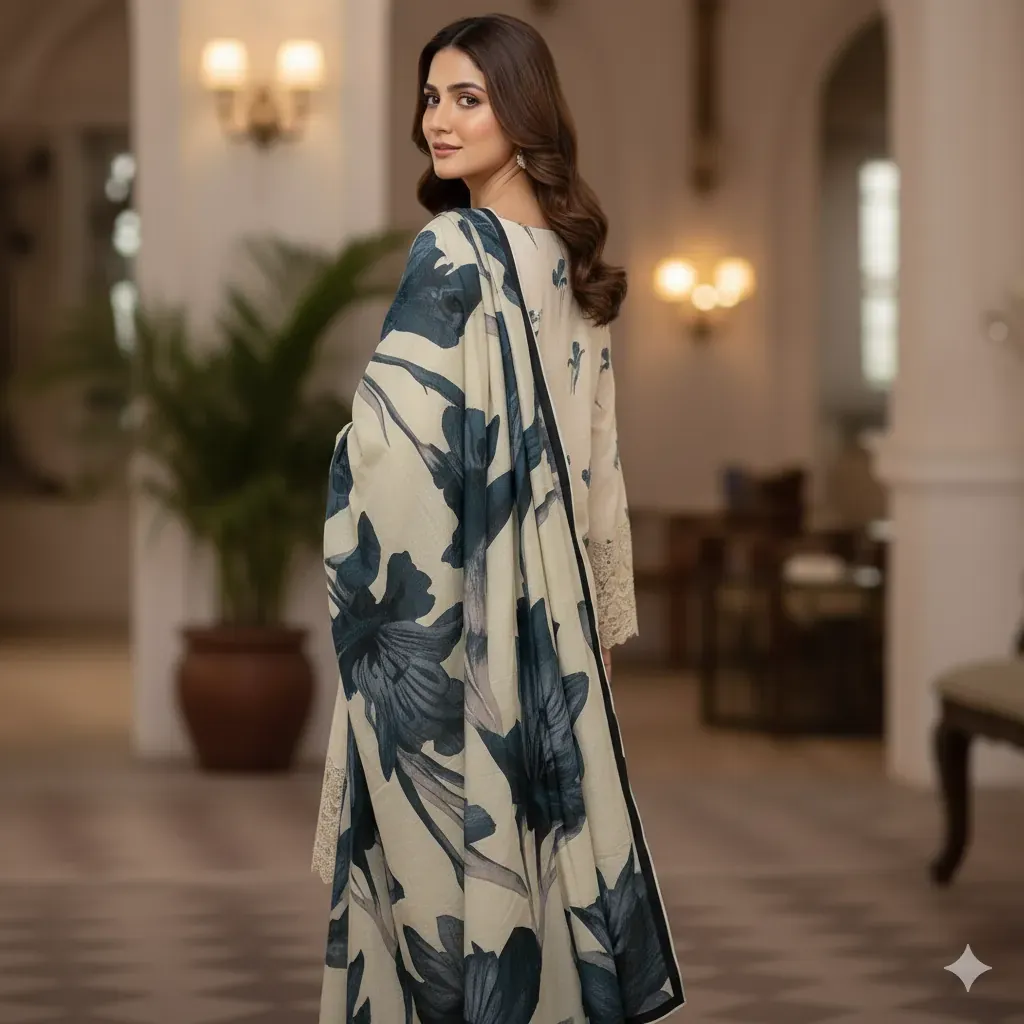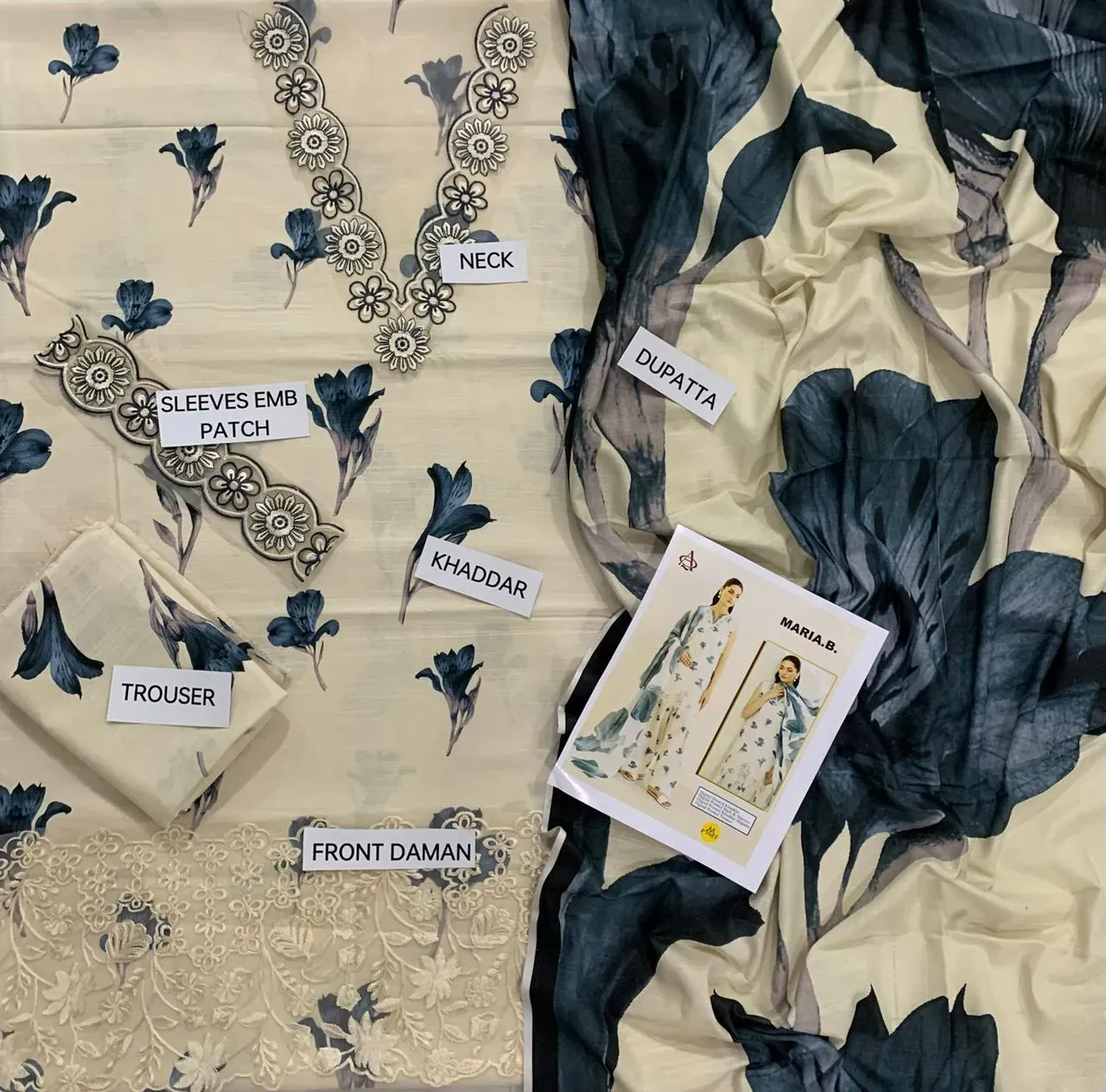 Embrace sophisticated style with this Maria.B inspired unstitched khaddar dress material. Perfect for the winter season, this ensemble features a stunning khaddar shirt with an elegant blue floral print, complemented by delicate neck embroidery and a coordinating sleeves embroidery patch. The set comes complete with a plain unstitched trouser fabric and a striking floral printed khaddar dupatta, offering a complete look. Design your personalized outfit for casual gatherings, daytime events, or everyday wear with this comfortable yet chic Pakistani dress material.