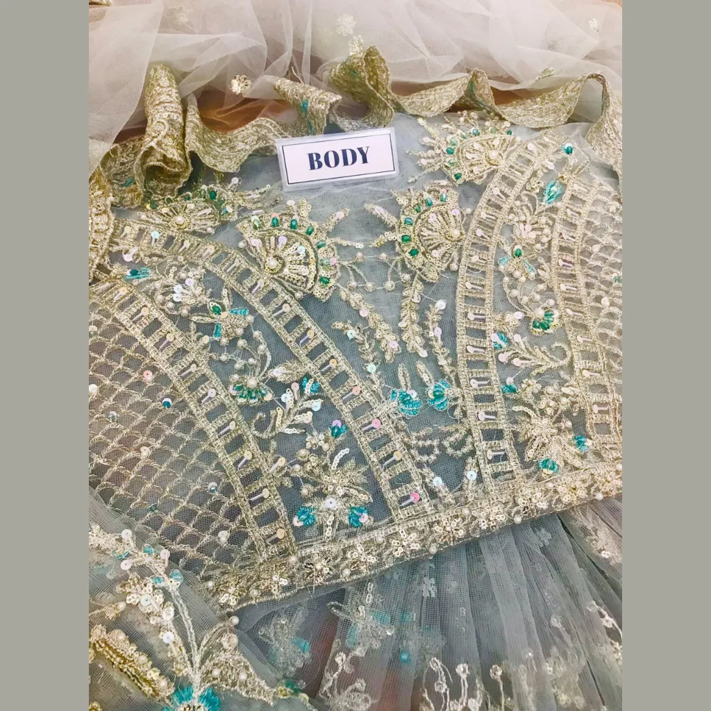 The front is beautifully embroidered with delicate details, paired with an embroidered daman, sleeves, and cuff patch, while the back remains plain for balance. The outfit is completed with a plain silk trouser and a ready-to-wear organza printed dupatta featuring an embroidered border for a graceful finish.
