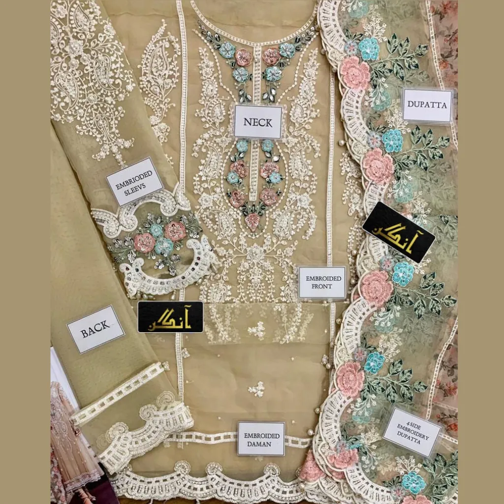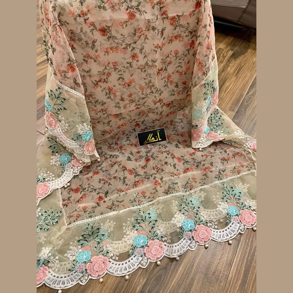 The front is beautifully embroidered with delicate details, paired with an embroidered daman, sleeves, and cuff patch, while the back remains plain for balance. The outfit is completed with a plain silk trouser and a ready-to-wear organza printed dupatta featuring an embroidered border for a graceful finish.