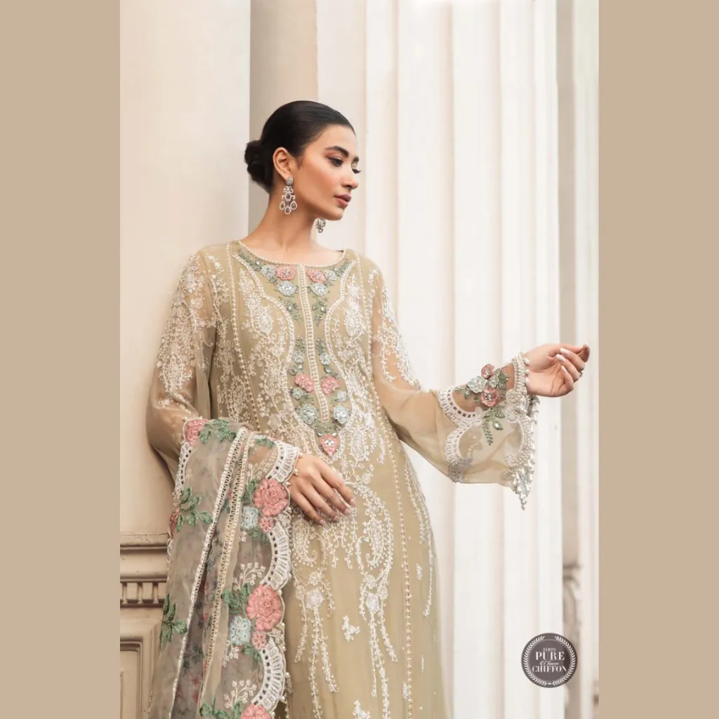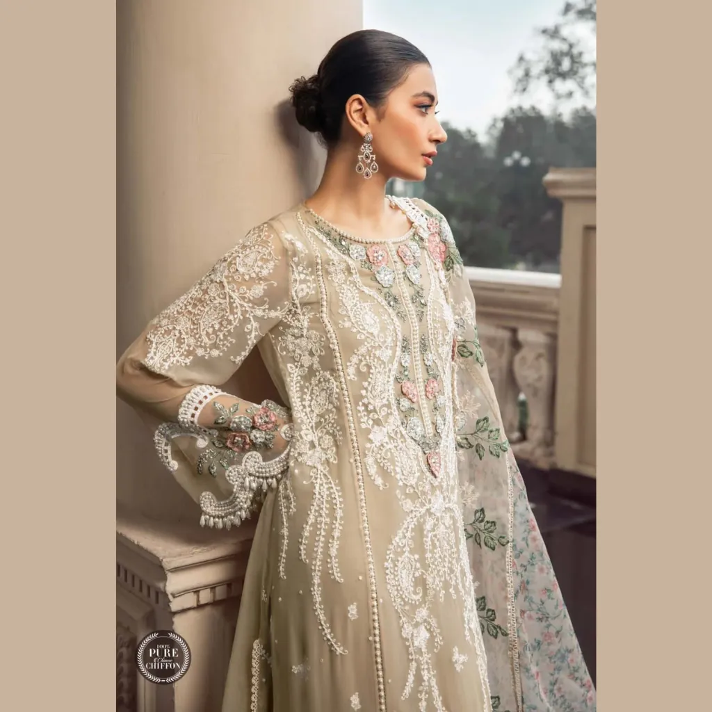 Experience pure elegance with the Maria.B Luxury Chiffon Collection, a masterpiece of craftsmanship and sophistication. This 3-piece unstitched suit features exquisite 3D floral embroidery and adda hand embellishment on premium chiffon fabric, designed to bring timeless luxury to your wardrobe.