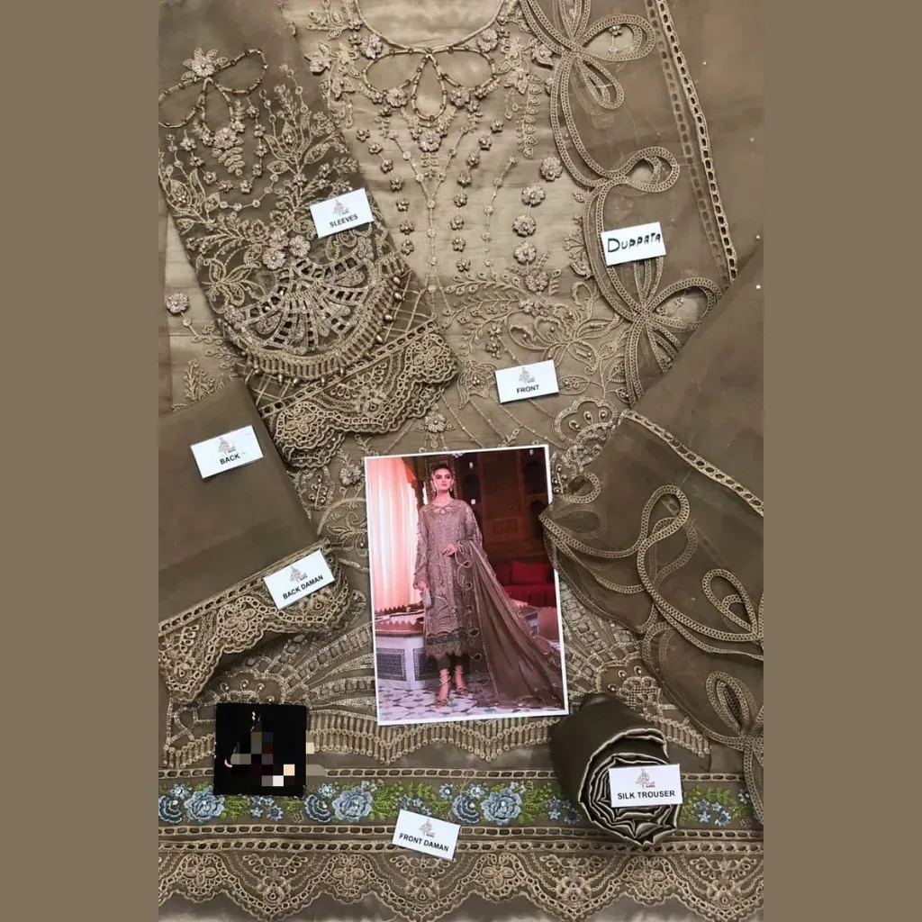 Elevate your festive style with the Maria.B Organza Embroidered & Hand Work 3PC Luxury Suit. The front features exquisite embroidery with handwork, sparkling stone embellishments, 3D flower attachments, and delicate cutwork detailing. The embroidered daman with stone work and cutwork patch adds depth and richness to the design, while the embroidered patch at the back balances the outfit with subtle charm.
