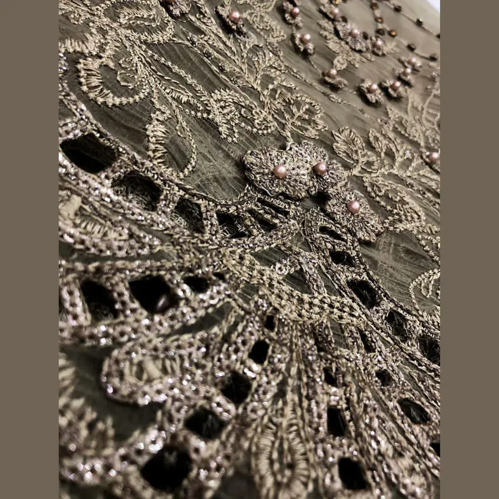 The sleeves, highlighted with embroidery, stone work, tassels, and cutwork, bring a modern yet traditional touch. The embroidered cuff patch adds refinement. This outfit comes with a plain silk trouser for comfort and a ready-to-wear embroidered organza dupatta with 4-side borders and cutwork finishing, completing the luxurious look.