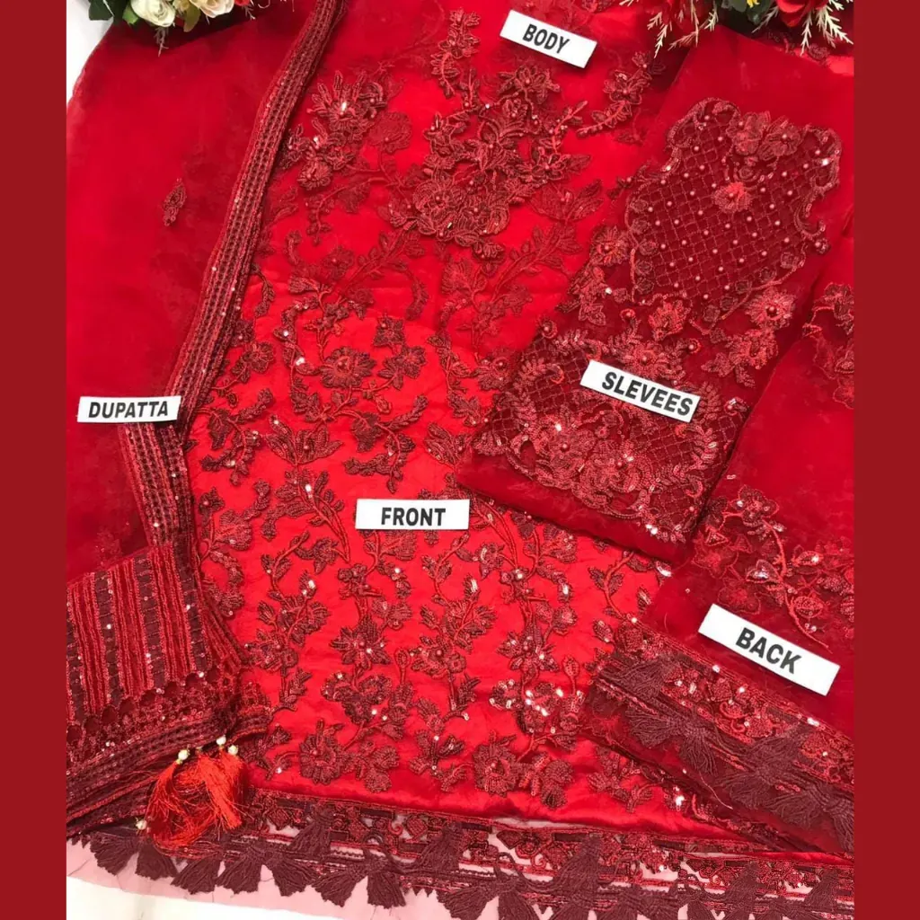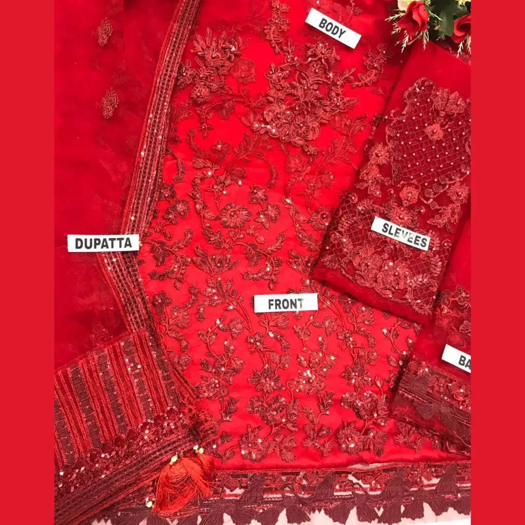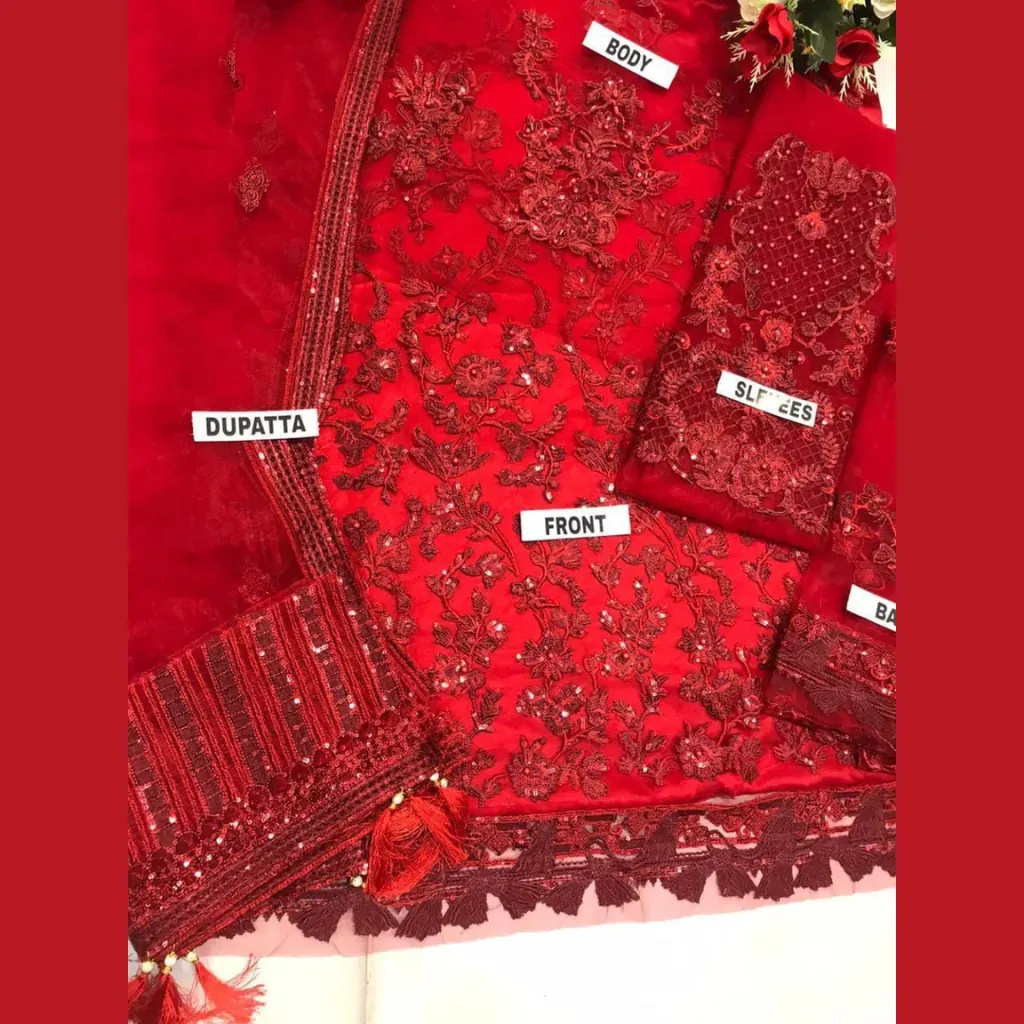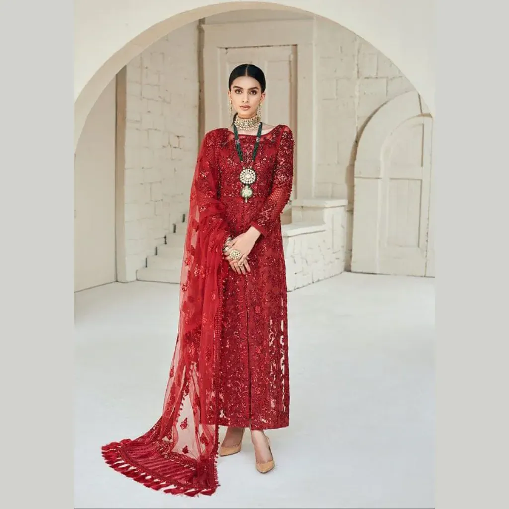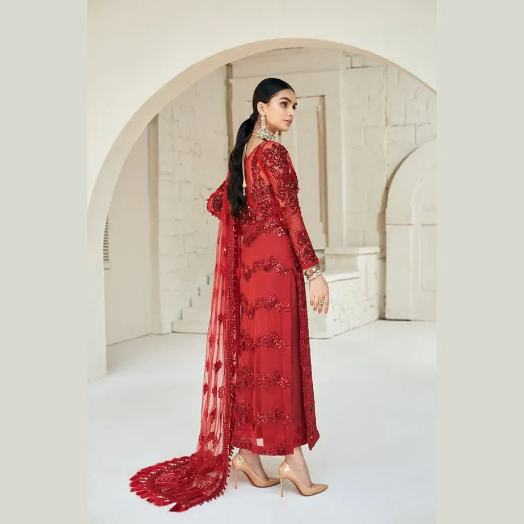 The Maryum Hussain Net Embroidered & Moti Work Sequence Unstitched 3PC Dress is a masterpiece of luxury and elegance. Designed with premium net fabric, this outfit features a fully embroidered front, back, body, and sleeves with exquisite sequence embroidery. The neckline is enhanced with a beautifully crafted handwork embroidered patch, adding a touch of sophistication.