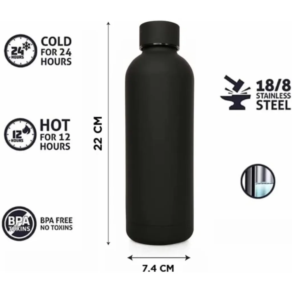 The Matte Black Insulated Water Bottle is a premium hydration essential designed for modern lifestyles, combining functionality with a sophisticated aesthetic. Made from high-quality stainless steel with vacuum insulation technology, it keeps hot drinks warm for up to 12 hours and cold beverages chilled for up to 24 hours, making it ideal for commutes, workouts, or office use. The matte black finish provides a non-slip grip and resists fingerprints, while the leak-proof lid ensures spill-free portability. BPA-free and eco-friendly, this bottle promotes sustainable living by reducing single-use plastic waste. With its slim profile, it fits easily into cup holders or bags, offering a reliable, stylish solution for staying hydrated on the go without compromising on performance or elegance.