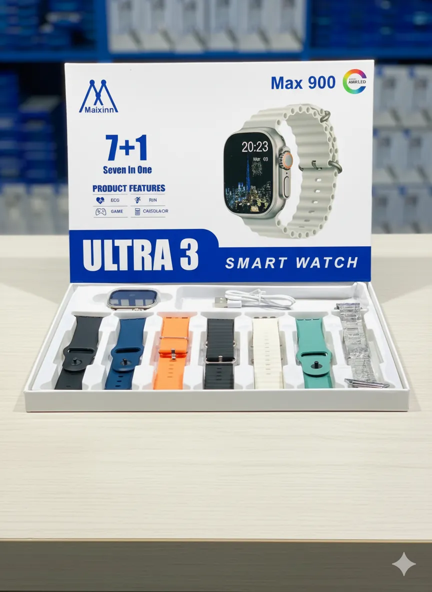 Upgrade your wristwear with the Max900 Ultra 3 7-in-1 Smart Watch, a premium smartwatch designed for style, versatility, and functionality. Powered with an AMOLED display, this smartwatch delivers vivid visuals and a smooth touch experience. The package includes 7 interchangeable straps – silicone, nylon, and metal – making it ideal for every occasion from workouts to formal events.Whether you're tracking your heart rate with ECG, counting steps, running, or using the built-in calculator and games, the Max900 Ultra 3 does it all. Stay connected, fit, and in control with this stylish multi-functional wearable. Compatible with Android and iOS devices