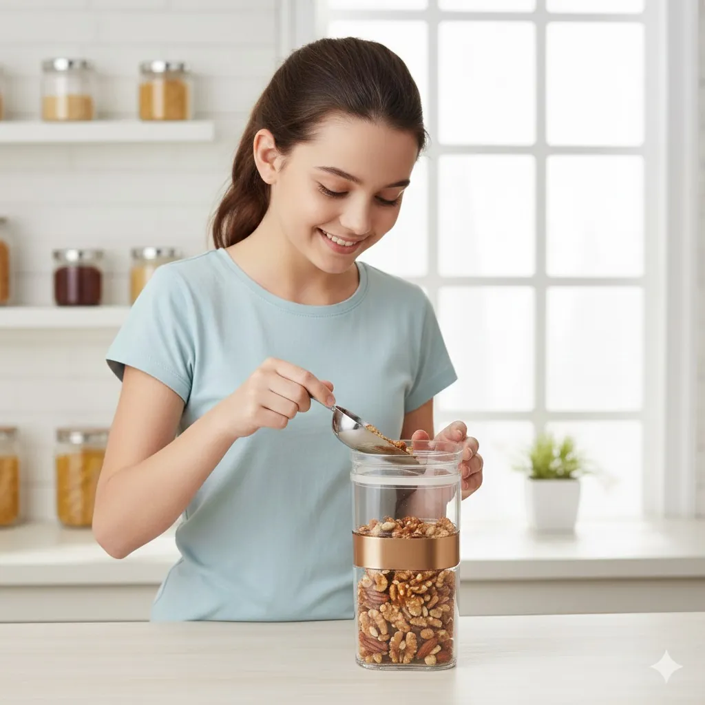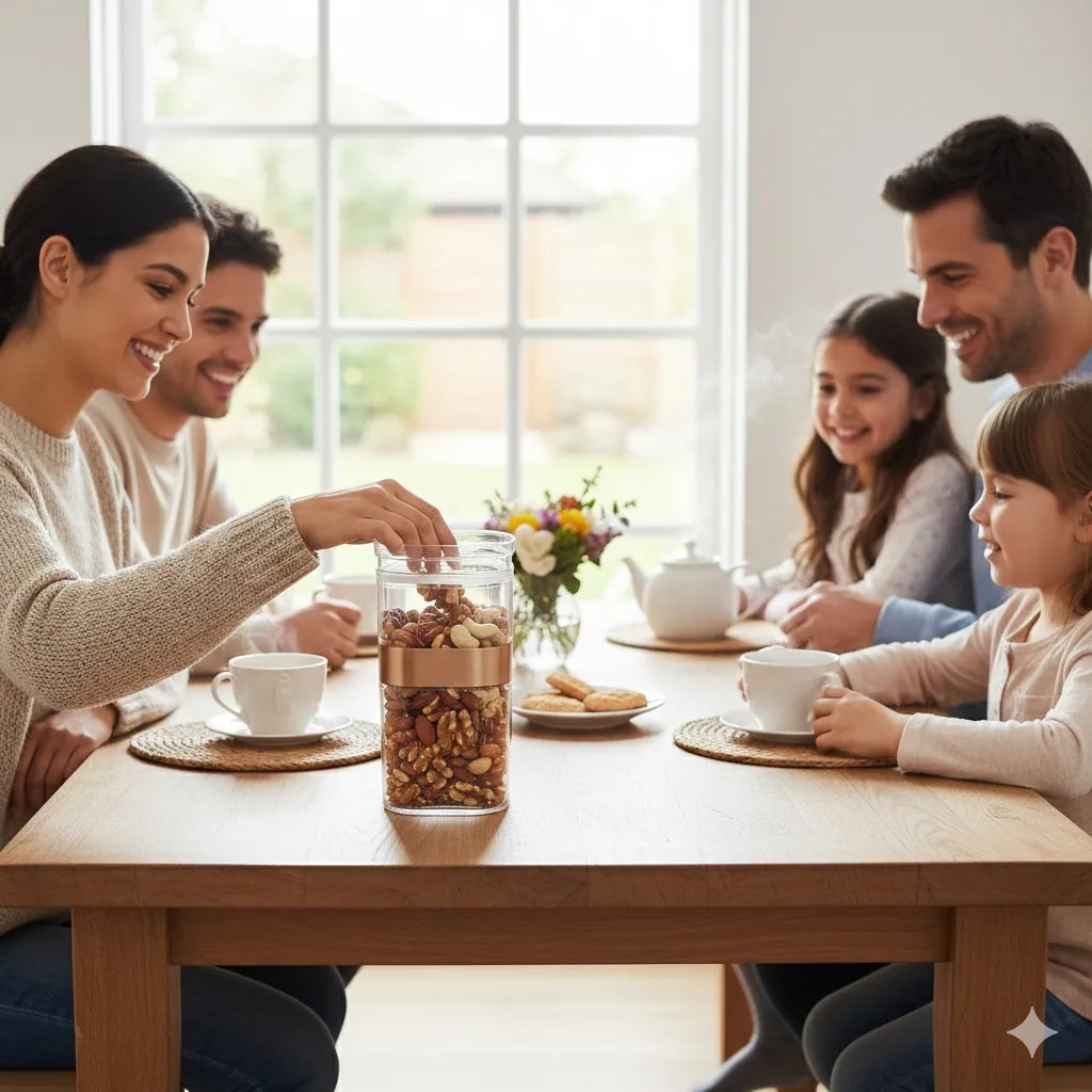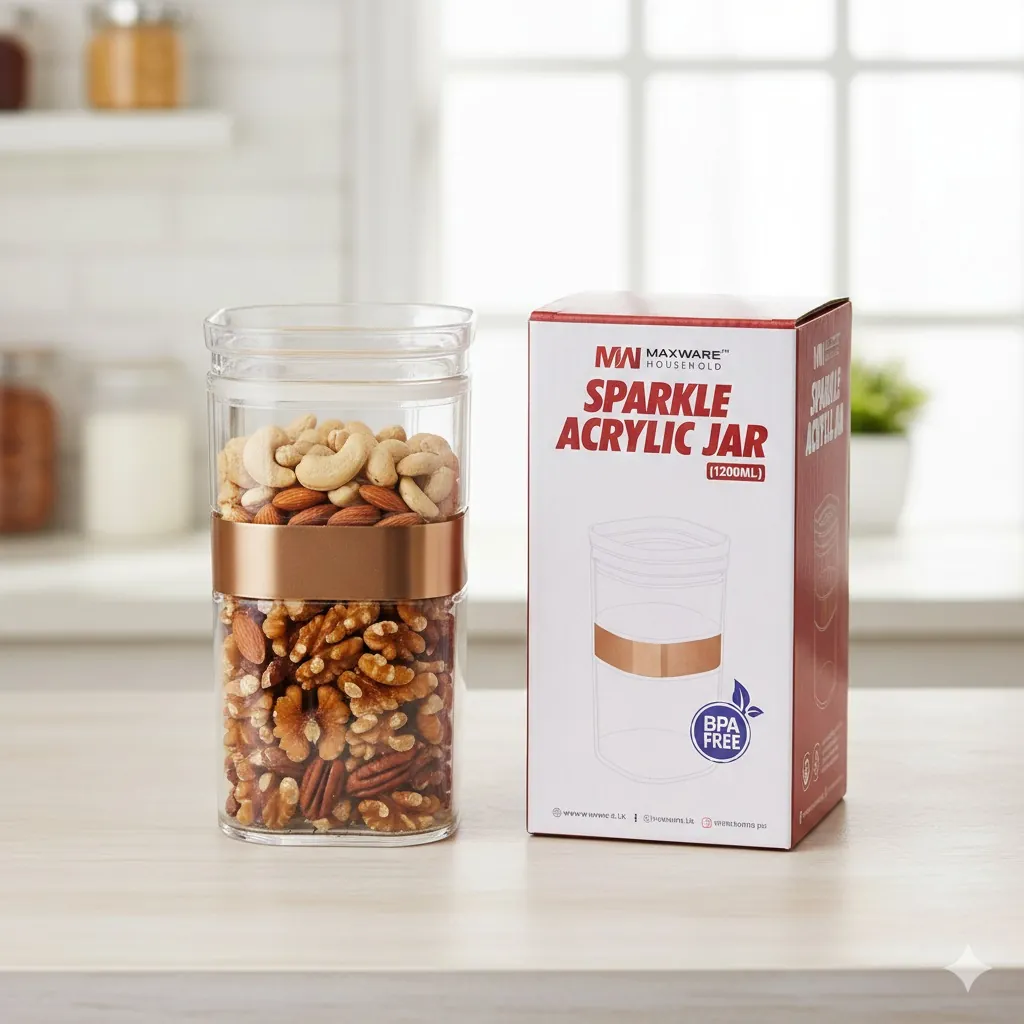 Maxware Household Sparkle Acrylic Jar 1200ml – Premium Airtight Food Storage Container with Copper Accent Band, BPA-Free Clear Kitchen Organizer for Nuts, Snacks, and Dry Fruits