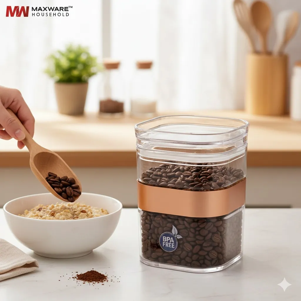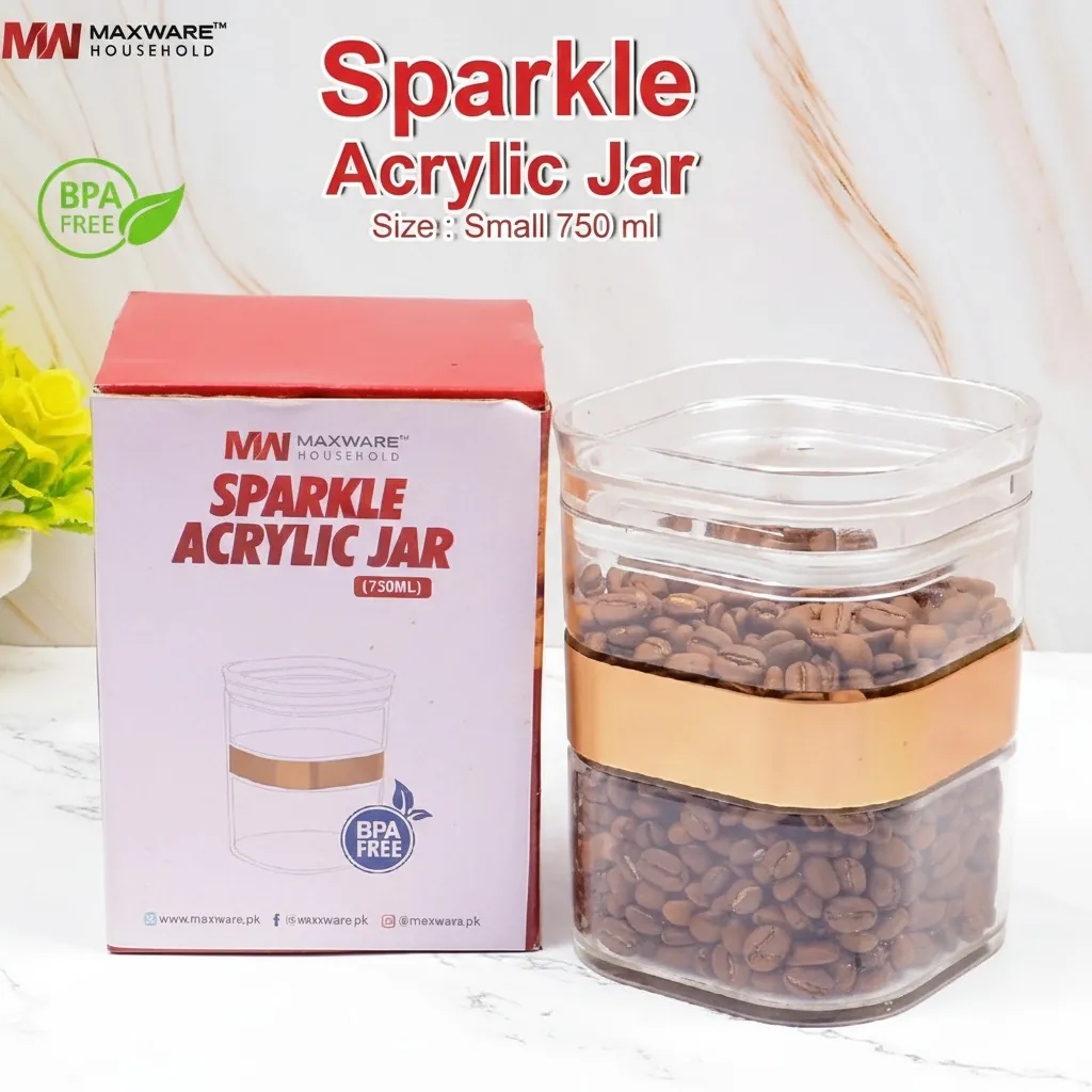 Elevate your pantry aesthetics with the Maxware Household Sparkle Acrylic Jar. Crafted from premium, high-quality food-grade acrylic, this 750ml container offers the clarity of glass without the fragility. Its modern square shape is accented by a stylish gold-toned band, making it a functional piece of decor for any modern kitchen.