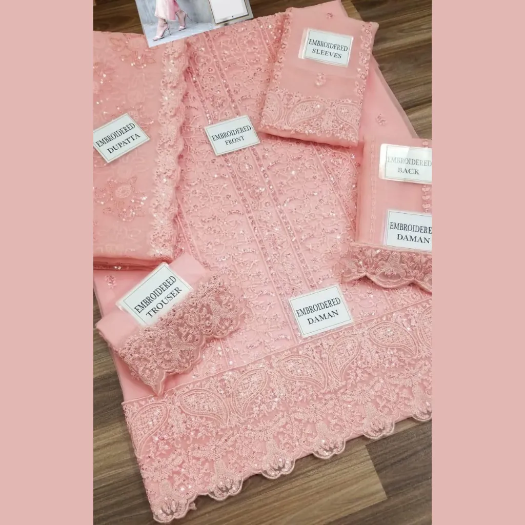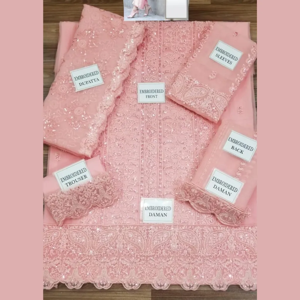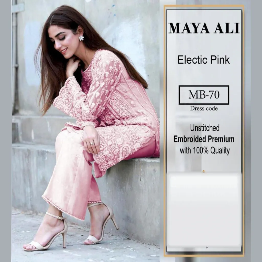 Experience elegance with the Maya Ali Organza Embroidered Sequence 3PC Unstitched Suit. This luxurious formal outfit features a beautifully crafted front embroidered with delicate sequence work on organza, complemented by a fully embroidered back and daman. The sleeves and dupatta are adorned with exquisite sequence embroidery, adding shimmer and sophistication. Paired with a dyed malai trouser, this unstitched set promises comfort and style, perfect for special occasions and festive events. Elevate your wardrobe with this timeless piece that blends traditional craftsmanship with modern aesthetics.