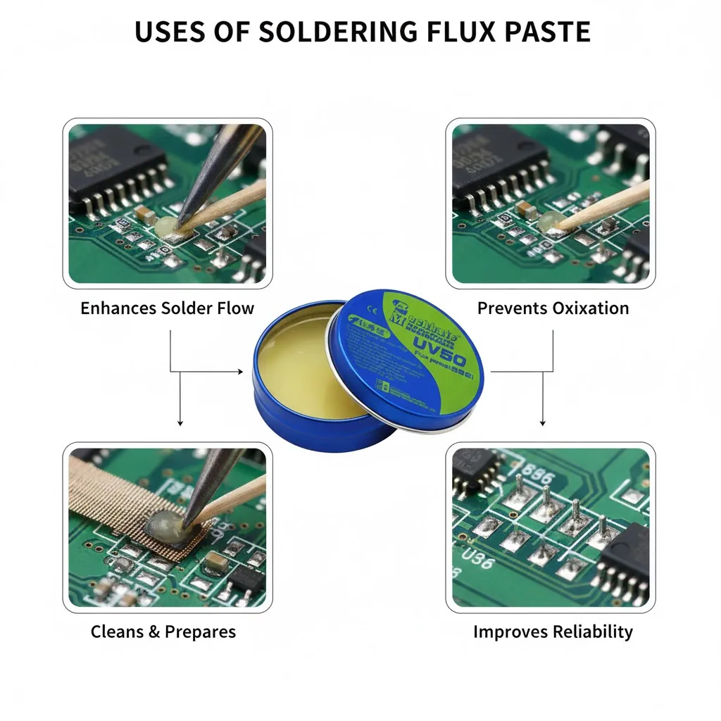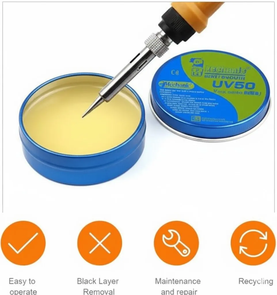 Featuring a neutral pH and strong insulation properties, the UV50 is classified as non-corrosive, making it the best choice for delicate work on modern electronics, including PC Cards, mobile phones, and sophisticated chip-level welding. It guarantees a smooth, bright, and full solder joint, eliminating common soldering issues like cold welds or false welding. Its superior compacity makes it universally applicable for PCB repair, BGA, SMD, and PGA reballing, ensuring high bond strength every time.
