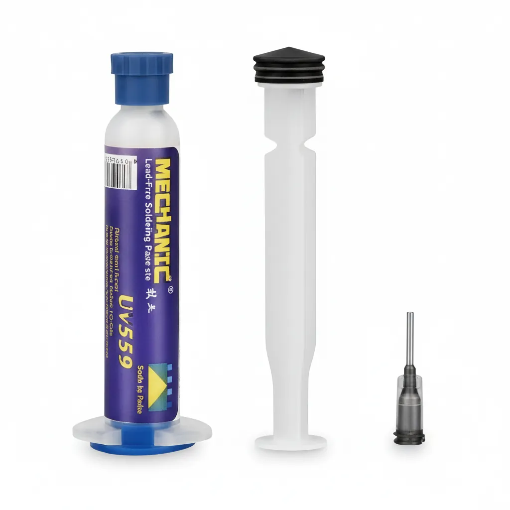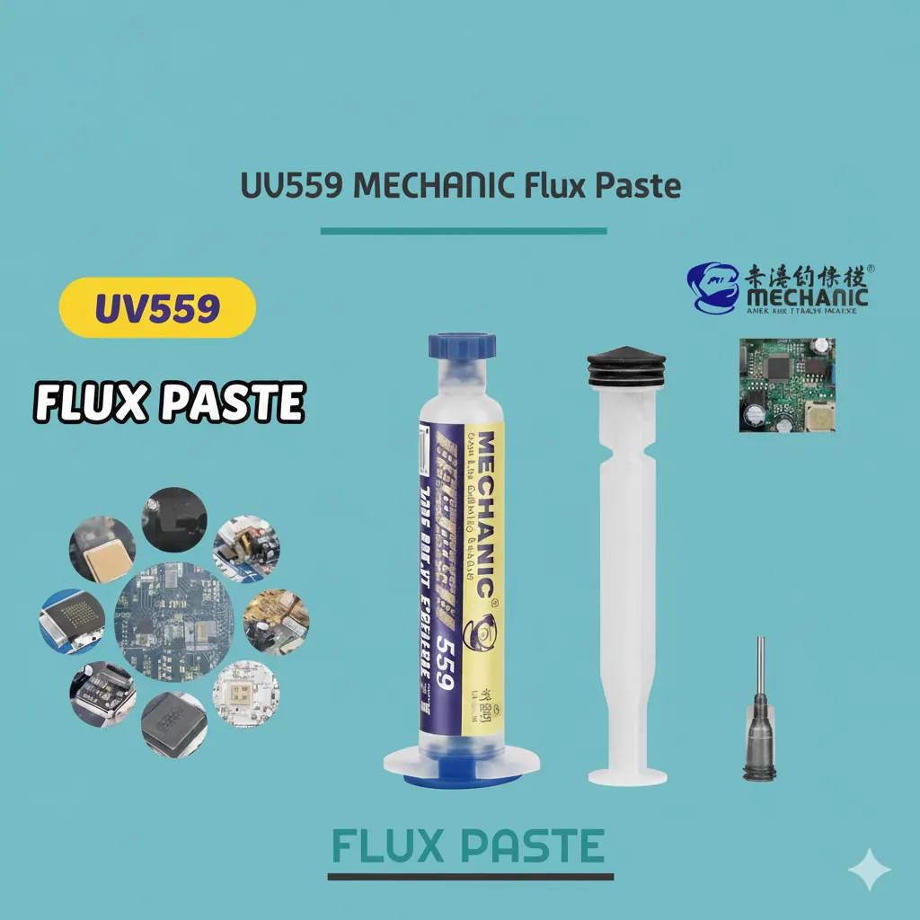 Upgrade your electronics repair and soldering precision with the MECHANIC Soldering Flux Paste UV559. This high-quality, resinic pasty flux is formulated with high-purity alloyed powder to deliver clean and reliable solder joints every time.The non-corrosive, neutral pH formula is perfectly suited for delicate electronic work, minimizing the risk of damage to components or traces, and is often suitable for no-clean applications (though cleaning is always recommended for critical boards).The UV559 is specifically designed for demanding tasks such as PCB repair and rework, BGA (Ball Grid Array), and PGA (Pin Grid Array) reballing.Its excellent wetting properties allow the solder to flow smoothly and efficiently, ensuring high bond strength and superior solderability. Supplied in a convenient $10\text{ml}$ container, it is easy to apply directly to the solder area. A must-have for technicians, DIY hobbyists, and professionals working on modern microelectronics.