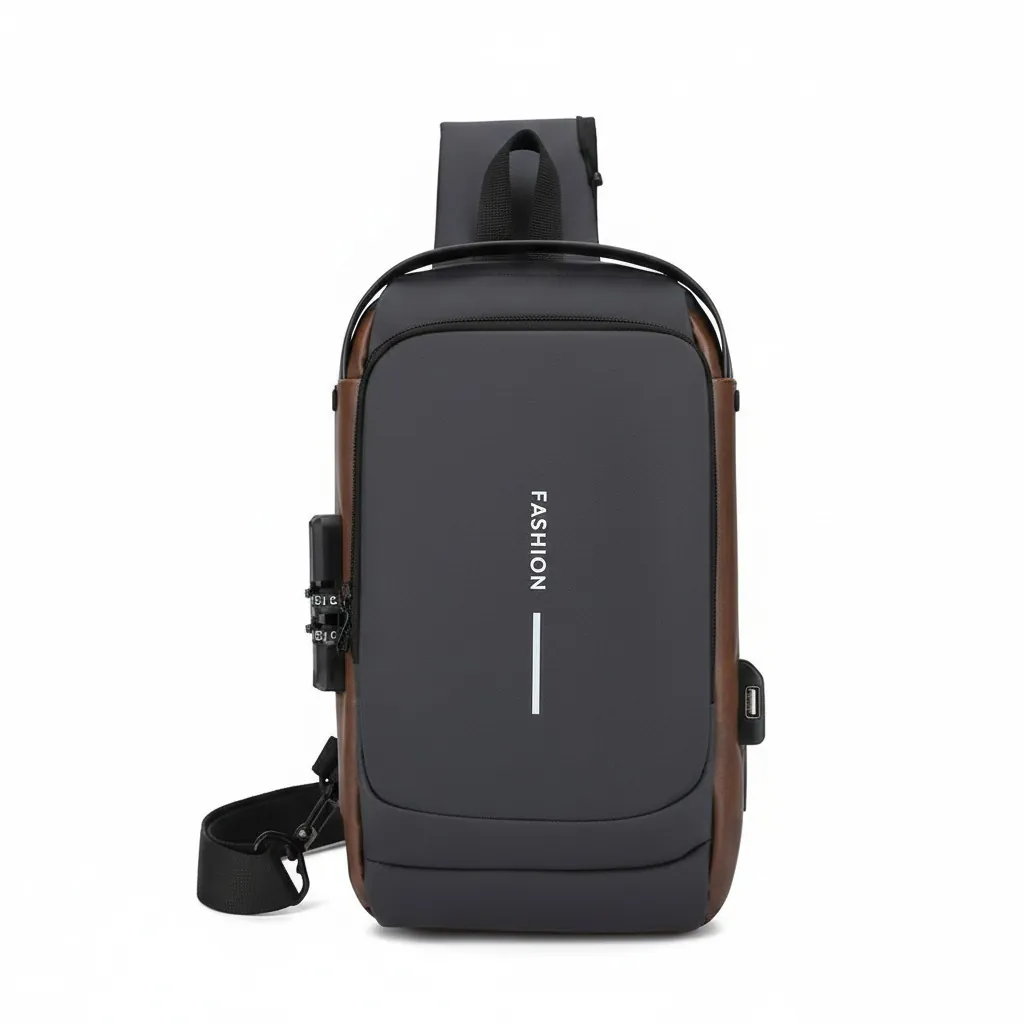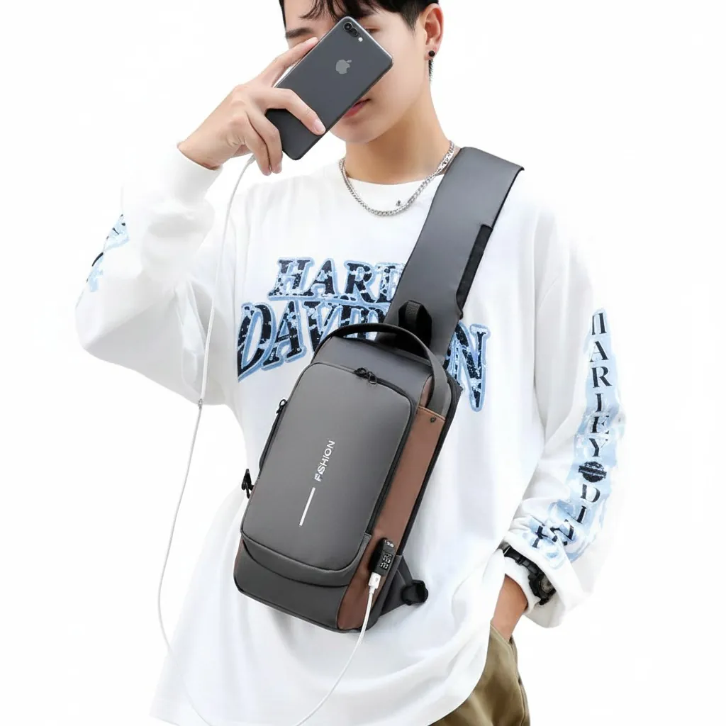 Men's Anti-Theft Crossbody Sling Bag with Combination Password Lock & USB Charging Port | High-Capacity, Waterproof Chest Shoulder Backpack for Travel & Commute