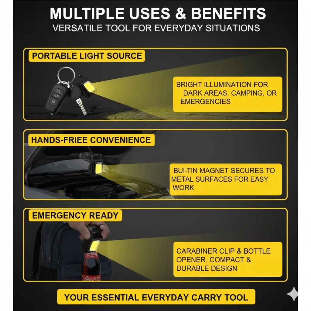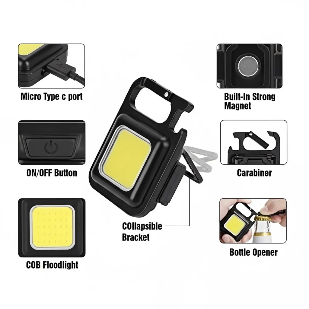 Rechargeable COB LED Work Light Keychain Flashlight with Built-in Strong Magnet, Collapsible Bracket, Carabiner, and Bottle Opener – Portable Micro Type C Charging Task Light